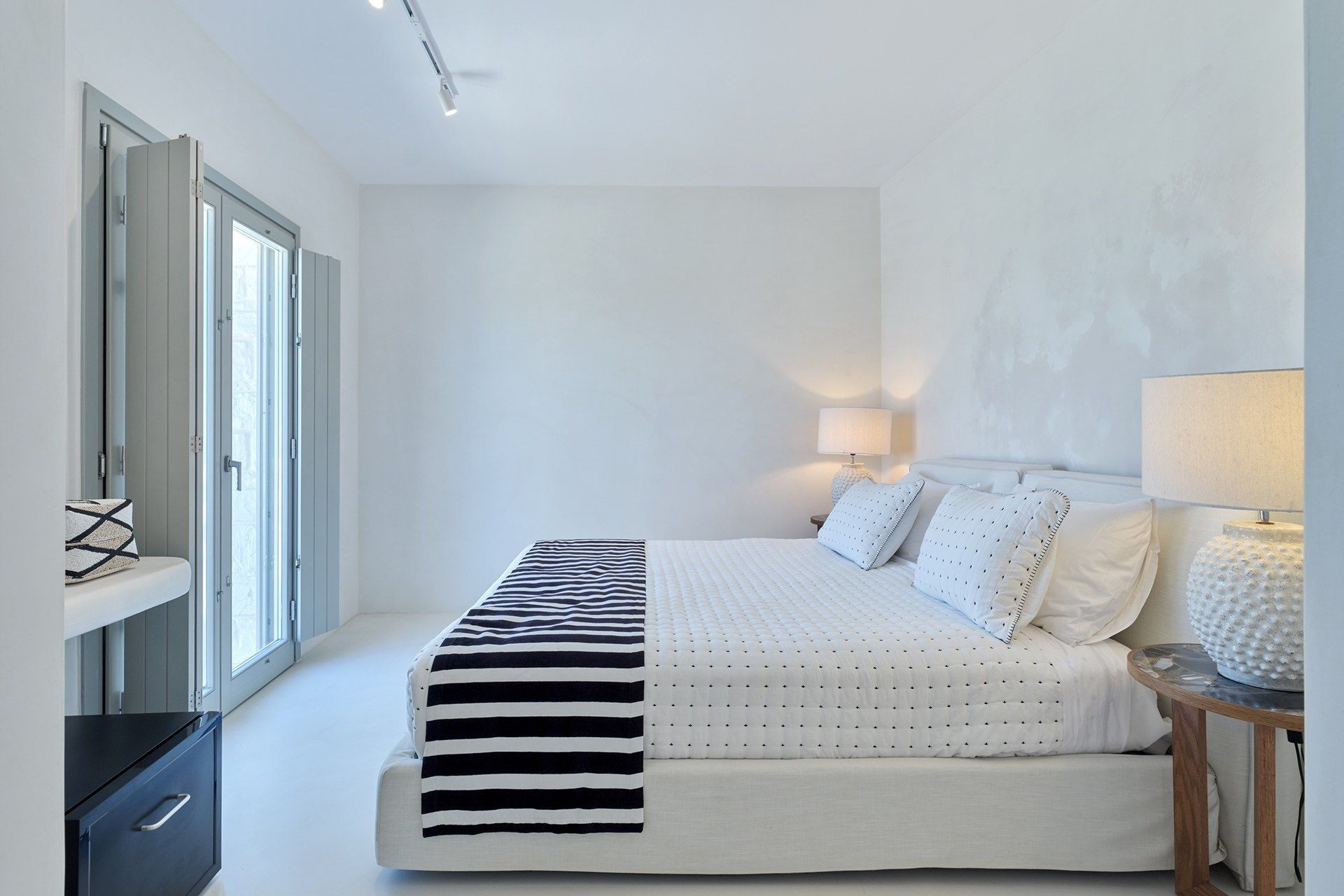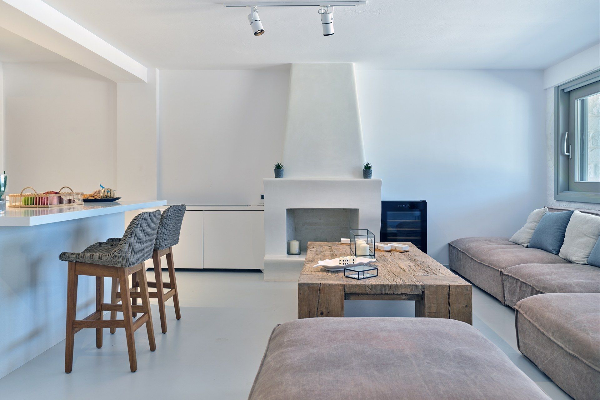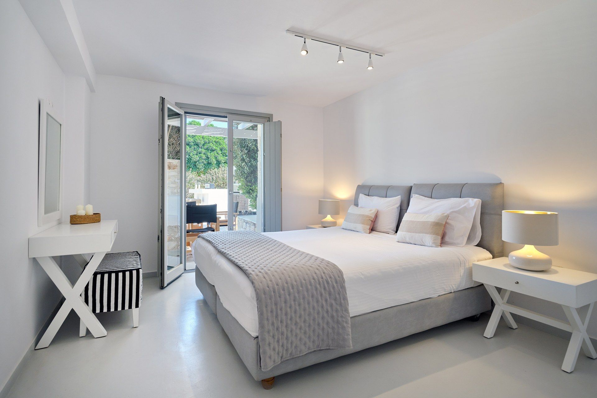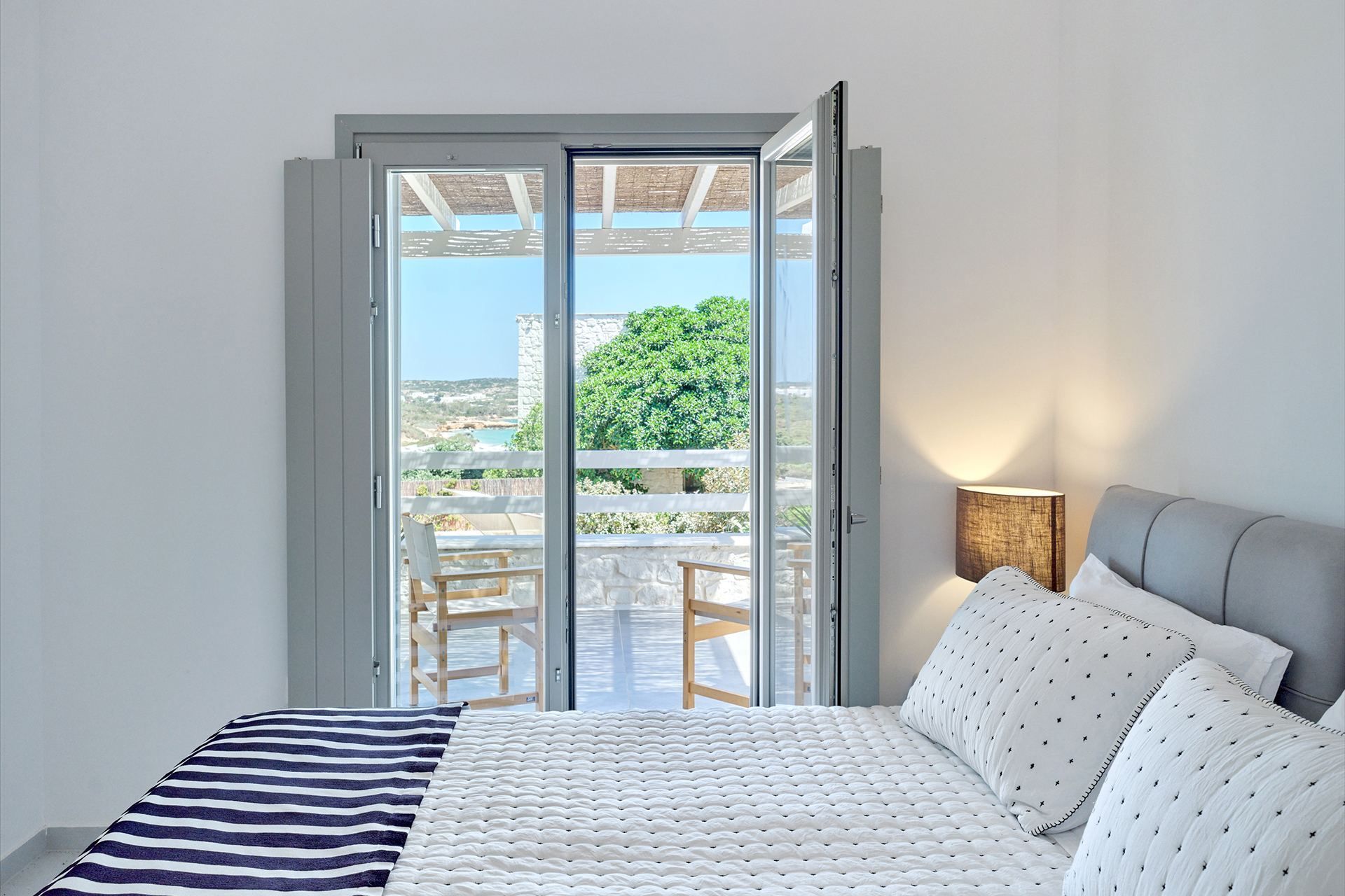 The setting is part of what makes Brigitte so appealing. A quieter sandy stretch of Santa Maria is a short walk away for a quick dip, while the more organized beach area is also close if the group wants something livelier. Naousa is also within easy driving distance, so dinners out and evenings in town are simple to fit into the week without the villa ever losing its quieter feel.