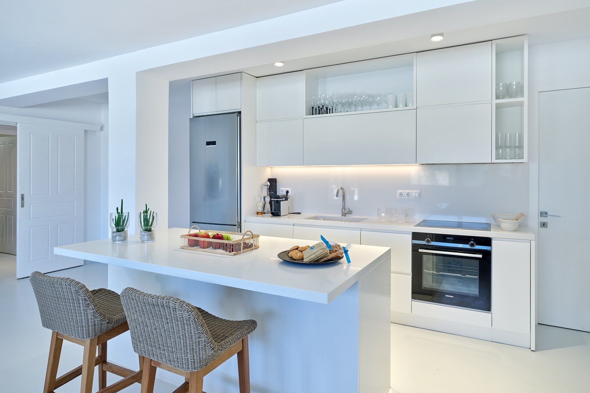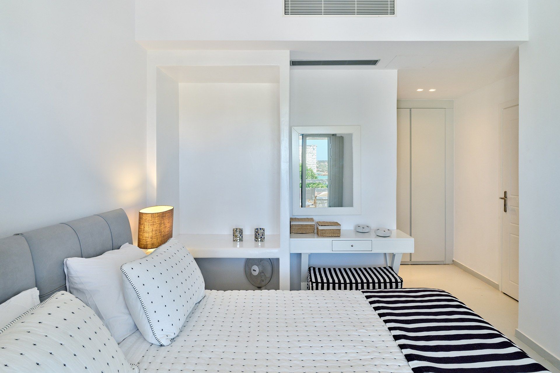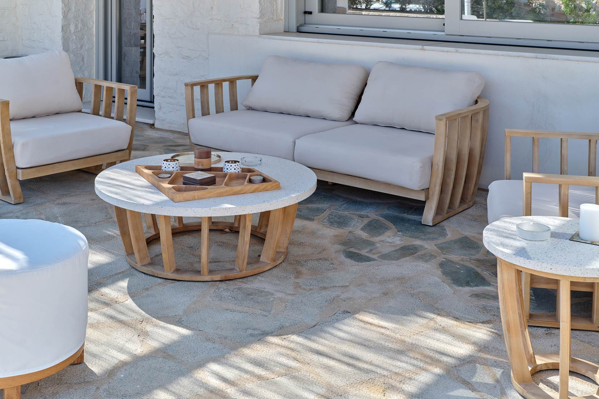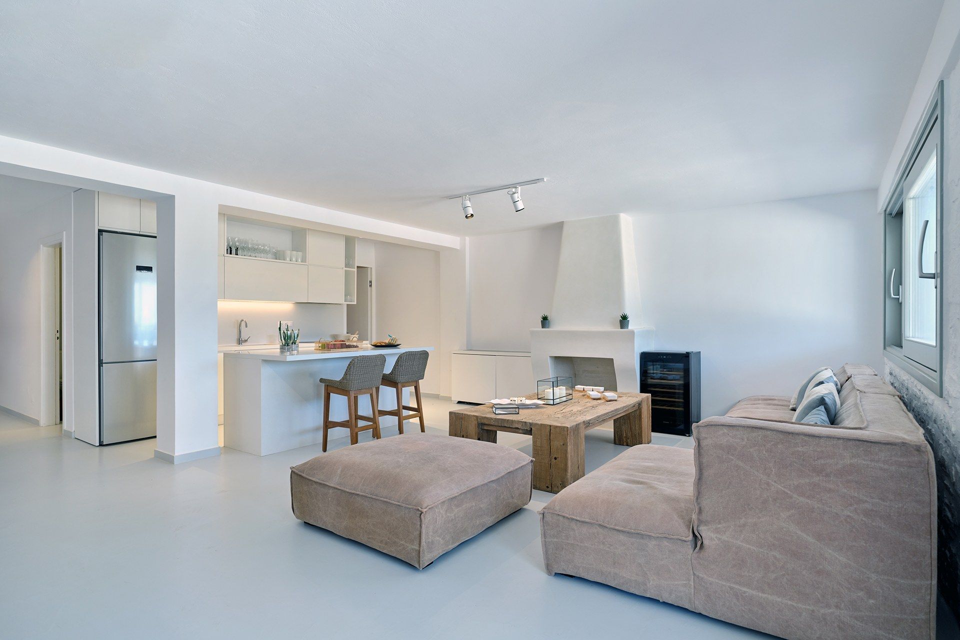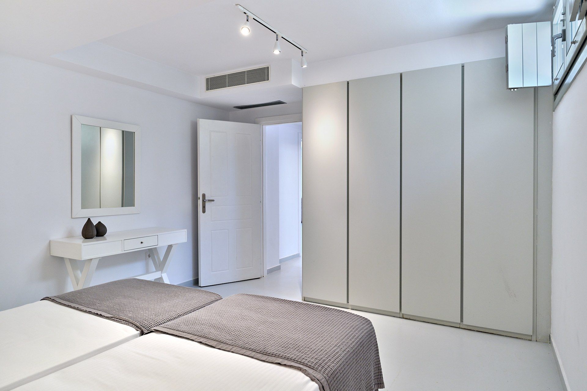 The setting is part of what makes Brigitte so appealing. A quieter sandy stretch of Santa Maria is a short walk away for a quick dip, while the more organized beach area is also close if the group wants something livelier. Naousa is also within easy driving distance, so dinners out and evenings in town are simple to fit into the week without the villa ever losing its quieter feel.