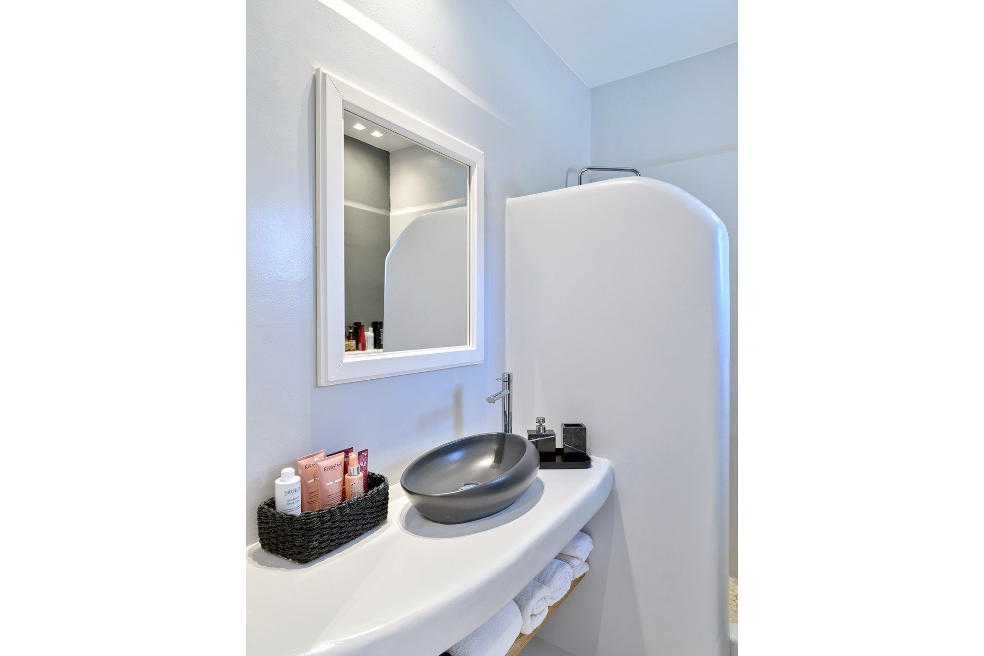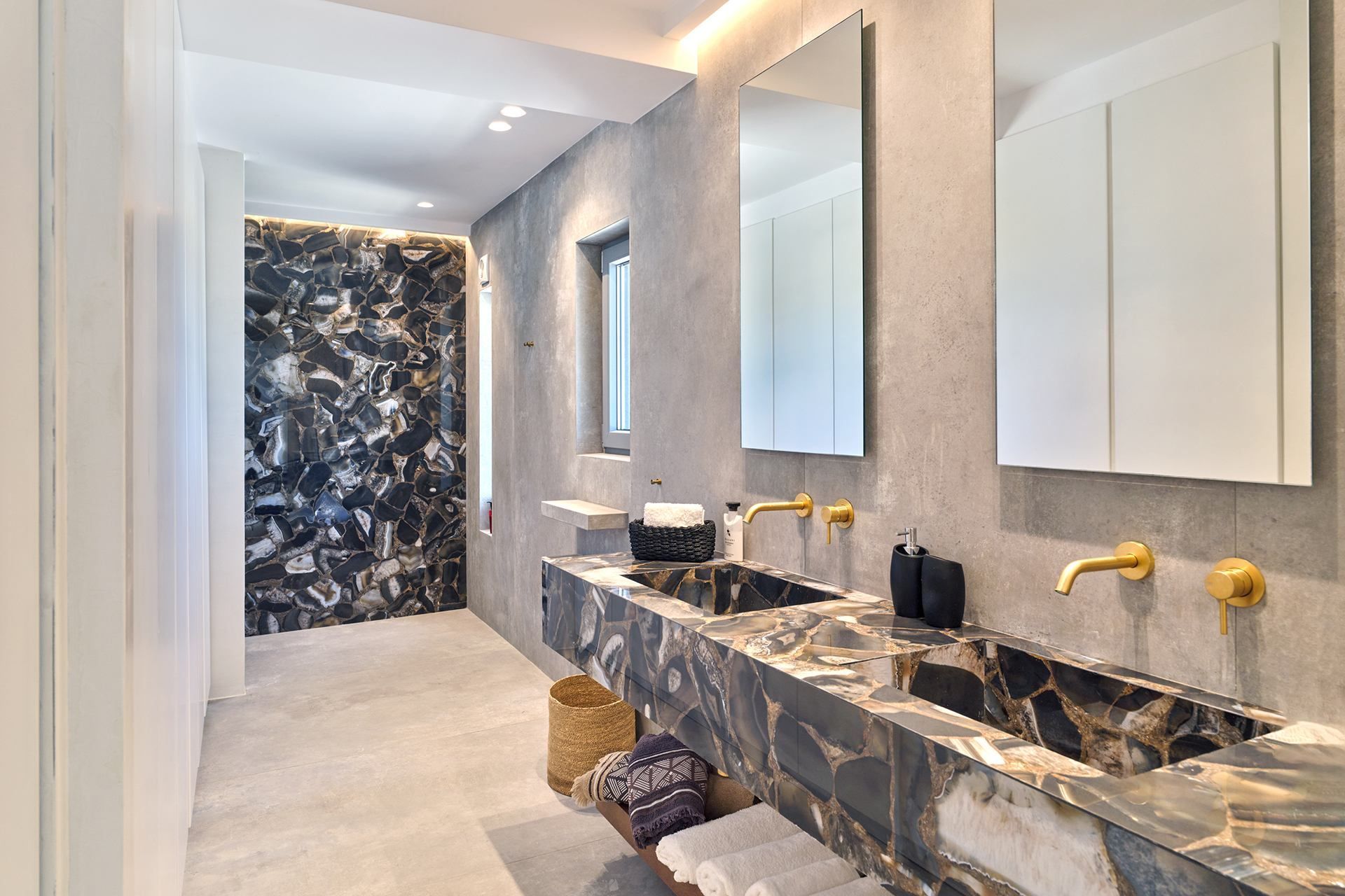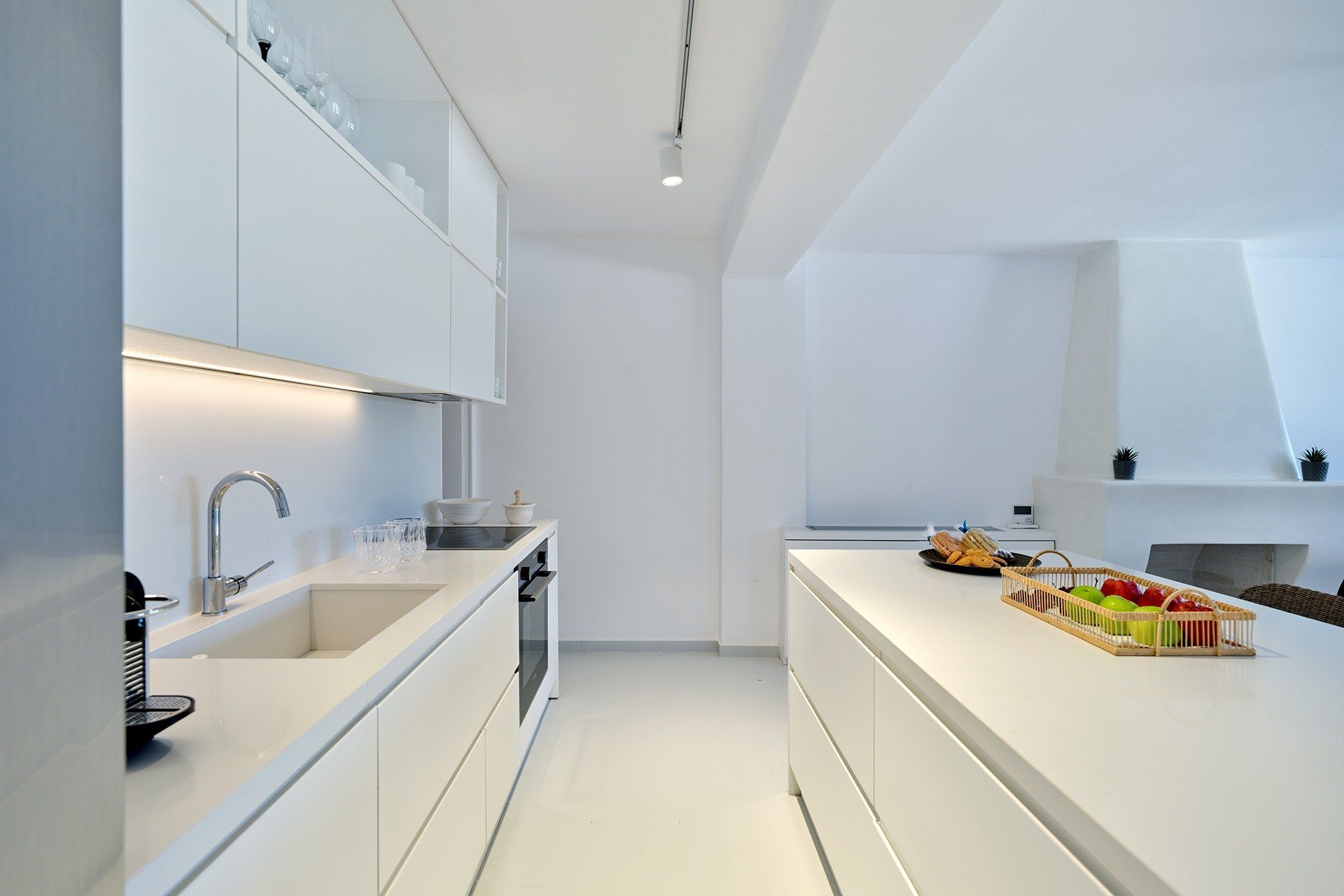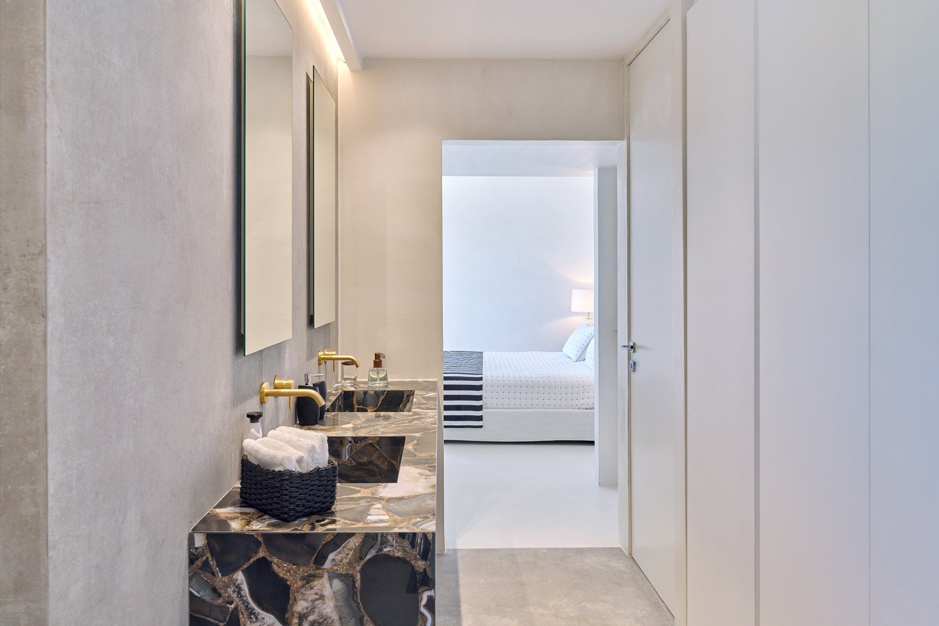 The setting is part of what makes Brigitte so appealing. A quieter sandy stretch of Santa Maria is a short walk away for a quick dip, while the more organized beach area is also close if the group wants something livelier. Naousa is also within easy driving distance, so dinners out and evenings in town are simple to fit into the week without the villa ever losing its quieter feel.