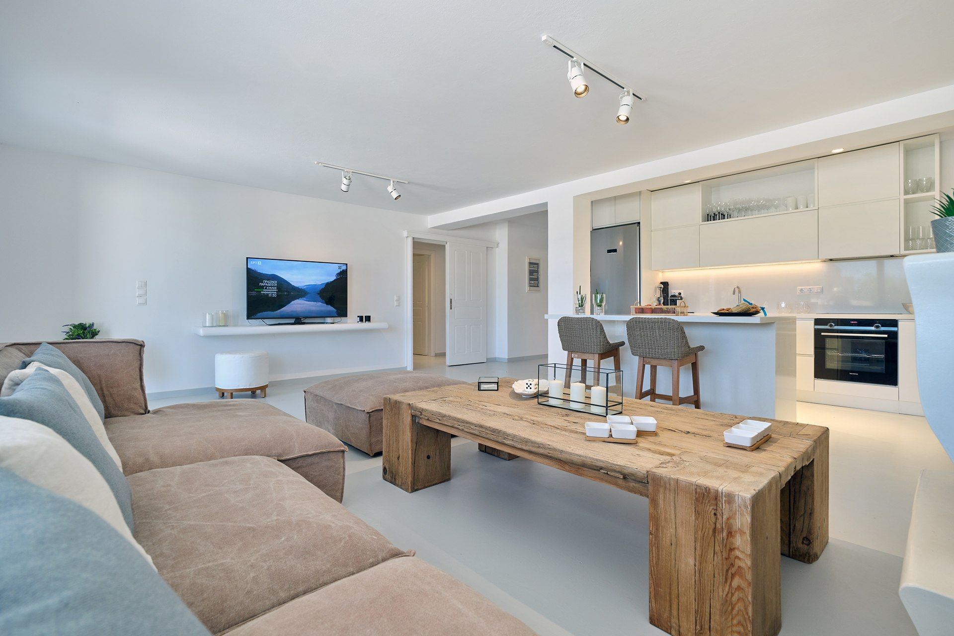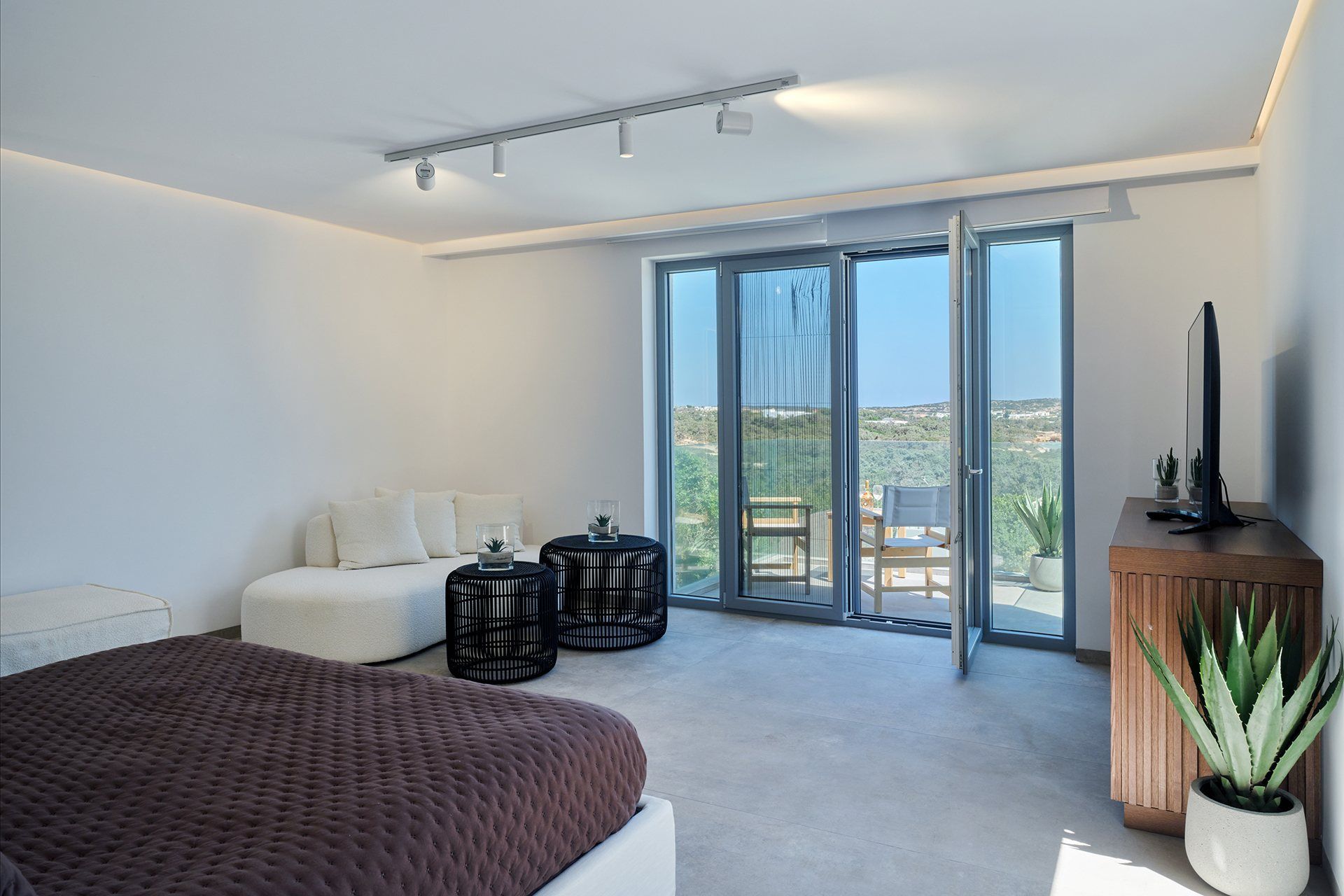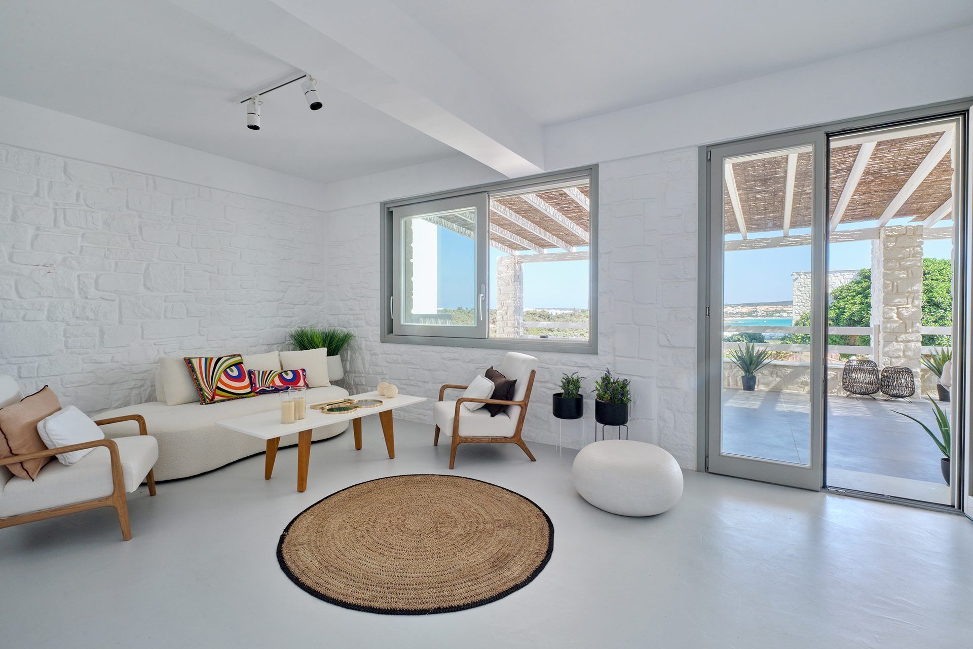Inside, the house is bright, open, and easy to move through. The main living area on the pool level connects to the kitchen and outdoor spaces, while the second sitting area upstairs opens onto a spacious veranda with sea views, adding another rhythm to the layout. The bedrooms are comfortable, well-sized, and calm in tone, with the upper master enjoying a little more privacy and the two independent guestrooms making the house especially easy to share.