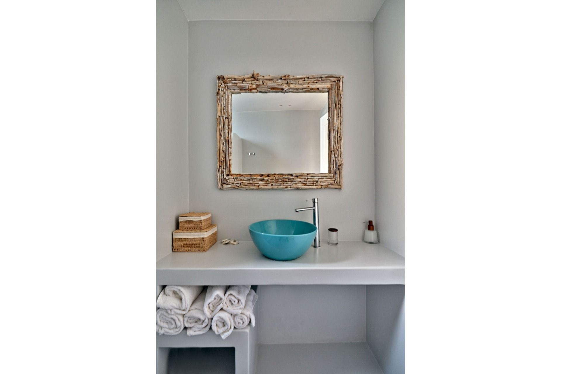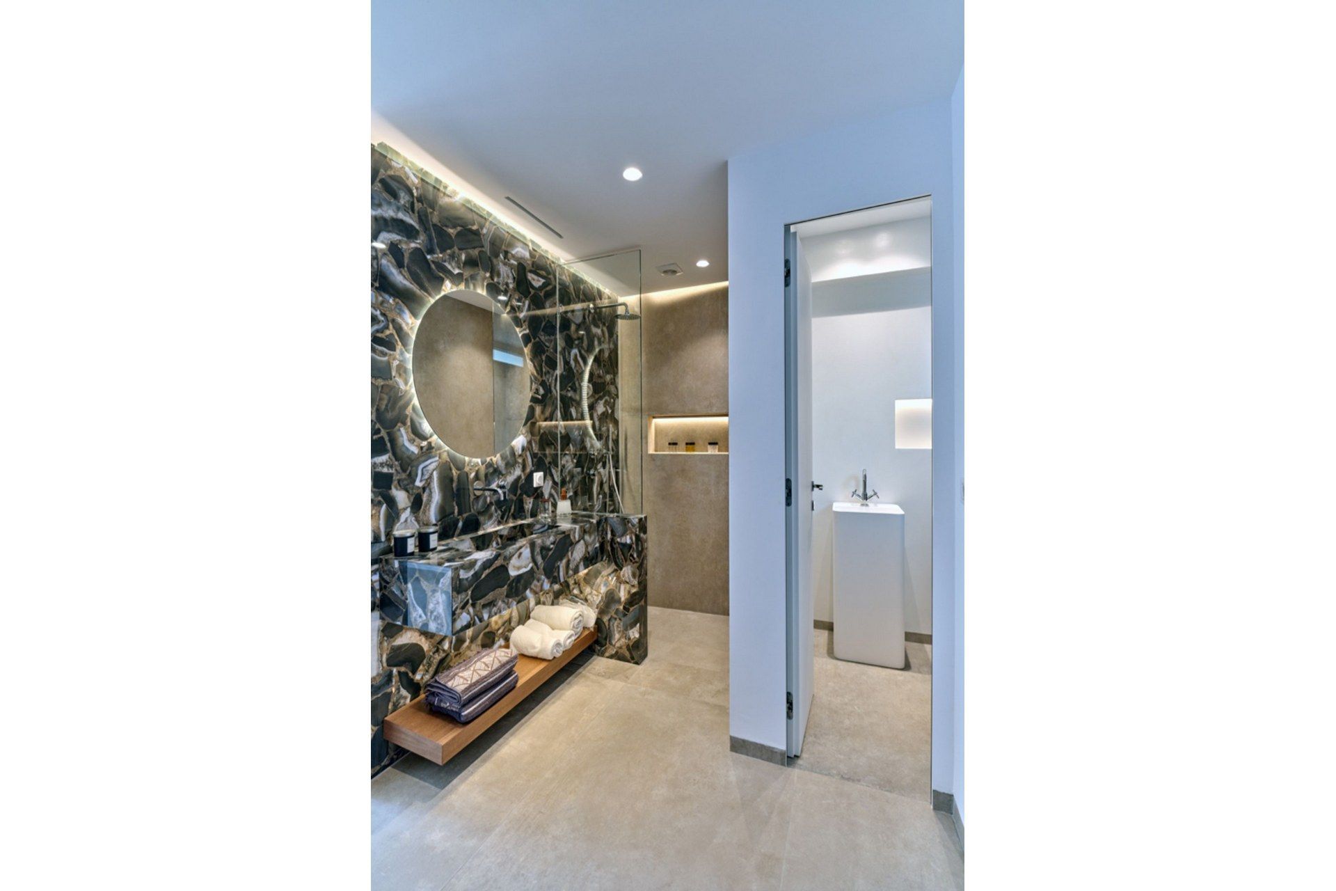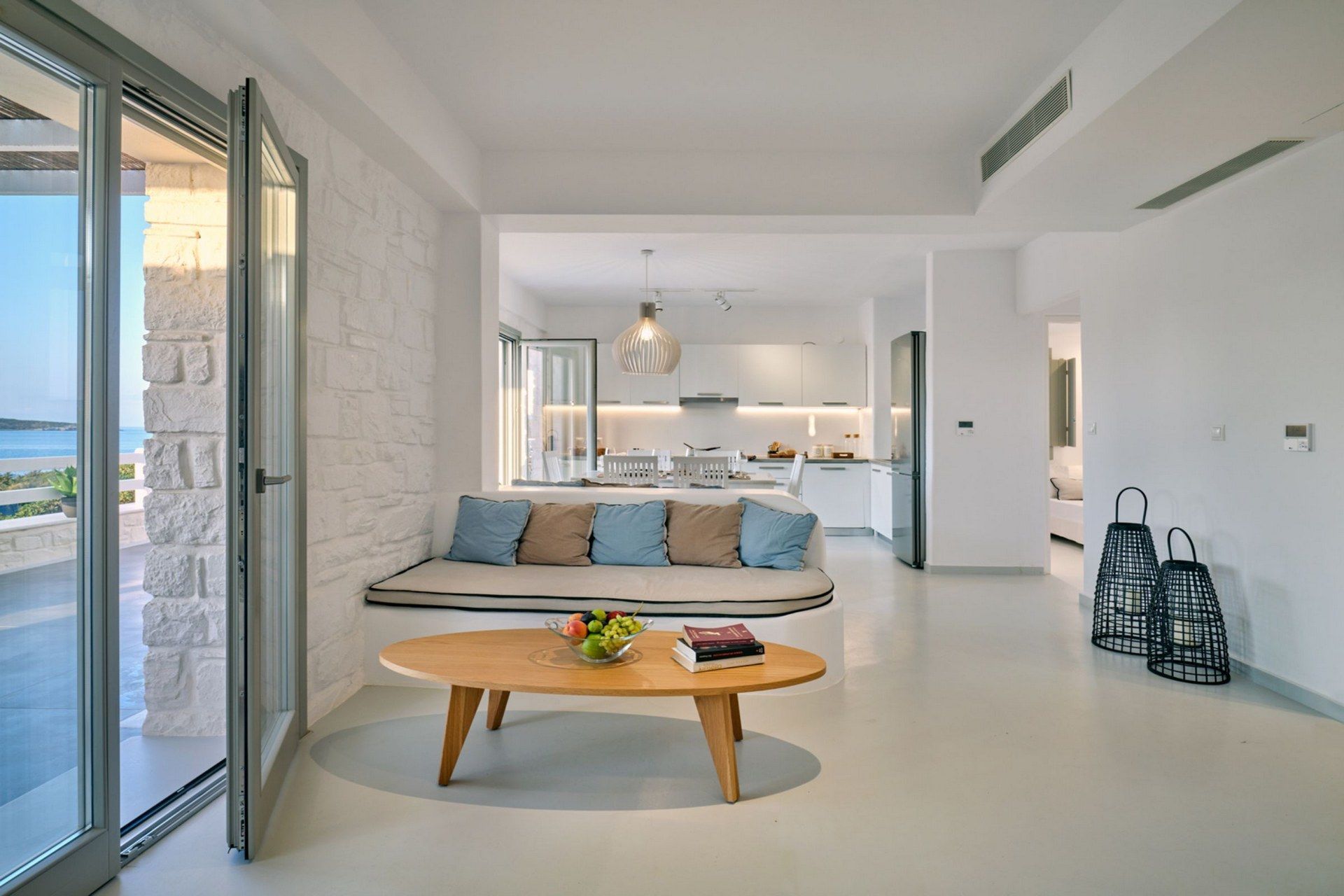 Inside, the villa is bright and contemporary, with whitewashed surfaces, soft grey tones, and subtle textures. The living spaces are spread out in a way that gives each level its own rhythm, from the pool-level living room with fireplace to the entrance-level kitchen, dining area, and sea-facing lounge. The master suite upstairs stands apart with its own sitting area and private balcony, while the independent guest room adds flexibility that works especially well for mixed groups.
