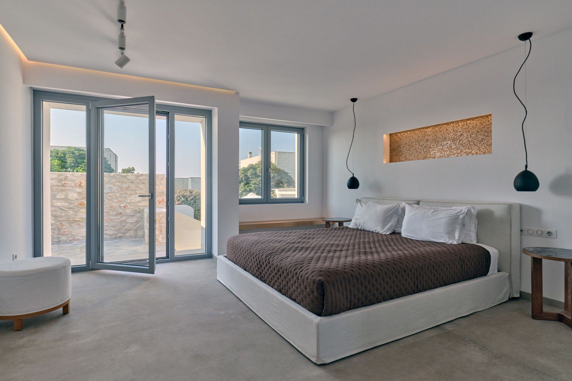 Outdoors, the atmosphere is shaped by pale stone, clean lines, and the calm light of the Cyclades. The pool terrace becomes the natural meeting point of the house, with shaded dining and lounge areas that make it just as pleasant for a slow breakfast as for a long dinner after sunset. Sun loungers, a BBQ, and the proximity to the beach make the whole setting feel relaxed and practical, especially for guests who like their days to move between swimming at home and slipping down to the shore.