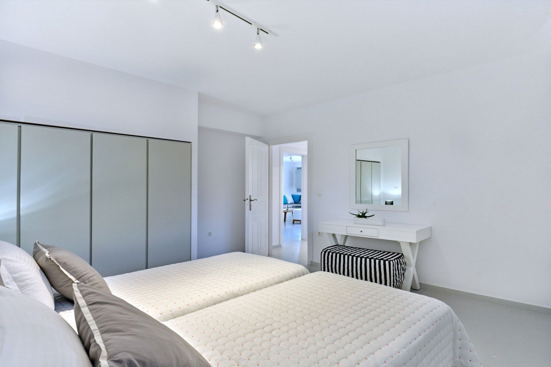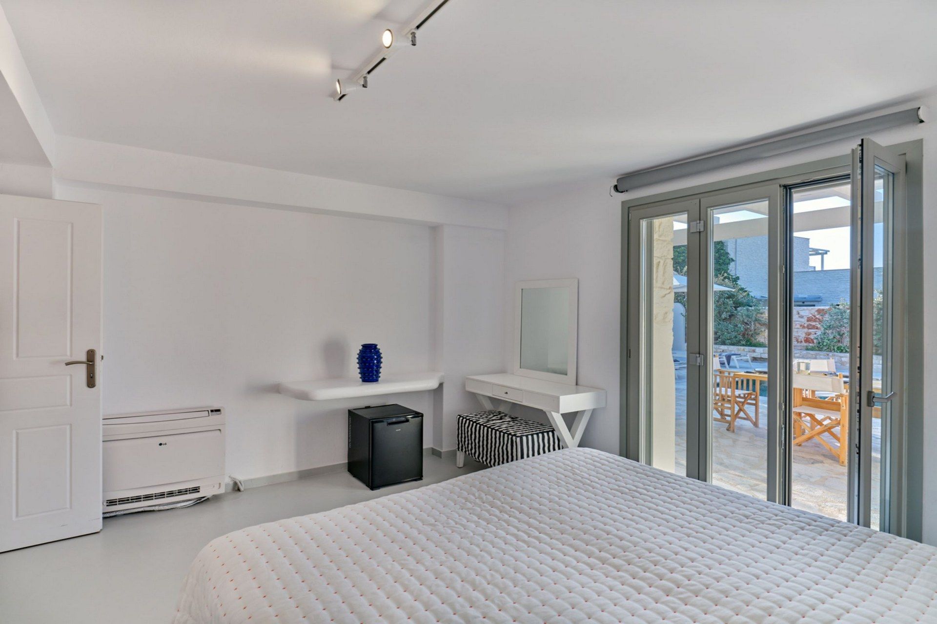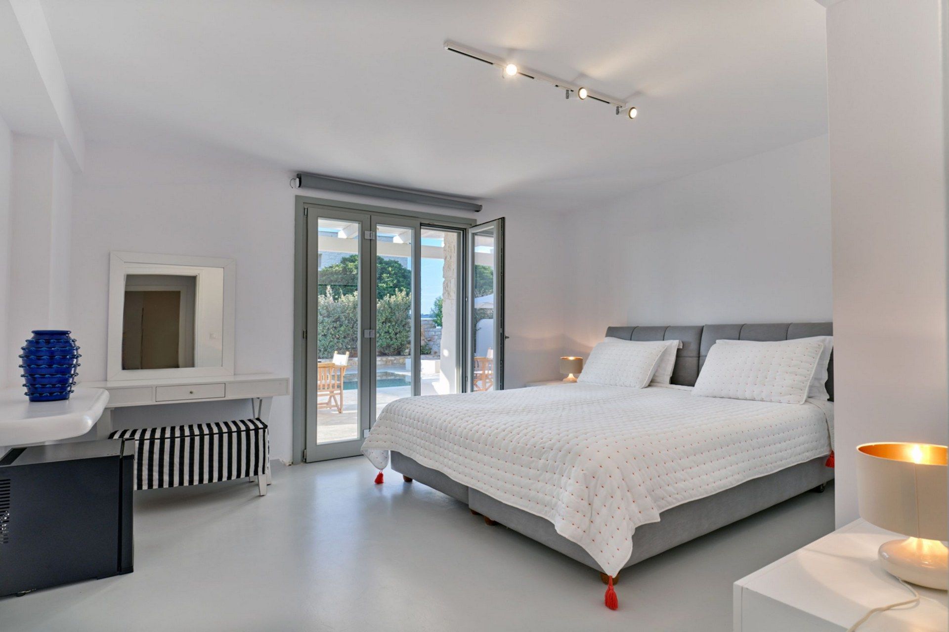 A big part of Caroline’s appeal is how easily the stay extends beyond the villa itself. A quieter, unorganized stretch of Santa Maria can be reached on foot, while the main beach is just a little further along for guests who prefer a more organized setup. Naousa is also within easy driving distance for dinner, shopping, and evenings out. Private parking for two cars is included, and the presence of a staff room may also be useful for longer or more service-oriented stays.