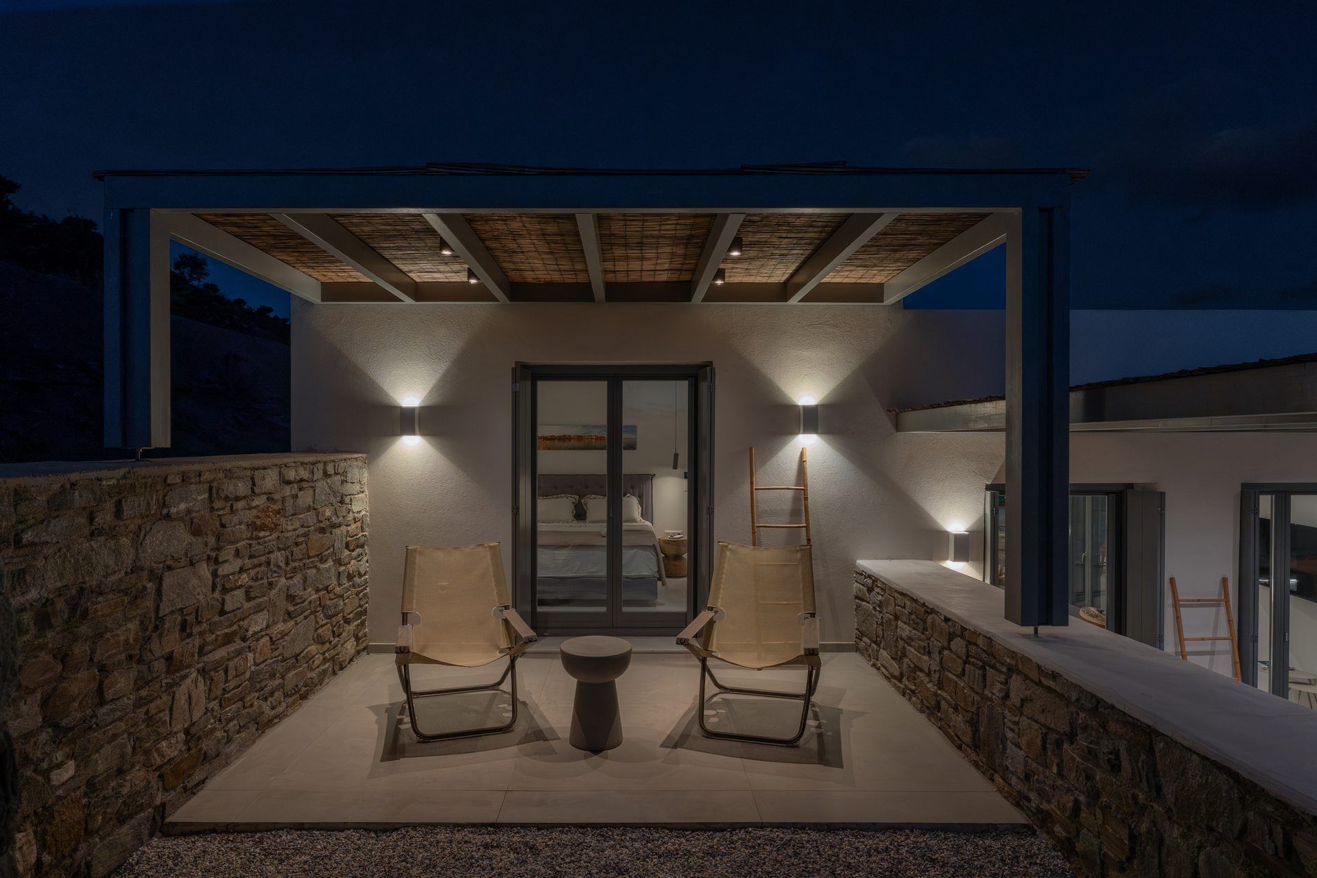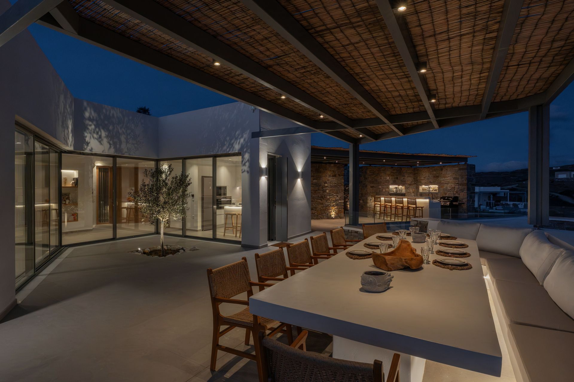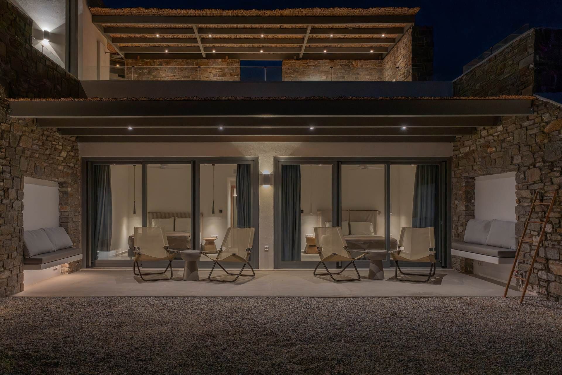 Inside, the villa follows a calm, contemporary approach, with open-plan living areas, soft tones, and large openings that connect directly to the outdoors. Four bedrooms are spread across the two levels of the main house, creating a natural sense of privacy, while the independent guesthouse features an additional bedroom and a flexible living space that can be used as a sixth bedroom when needed.