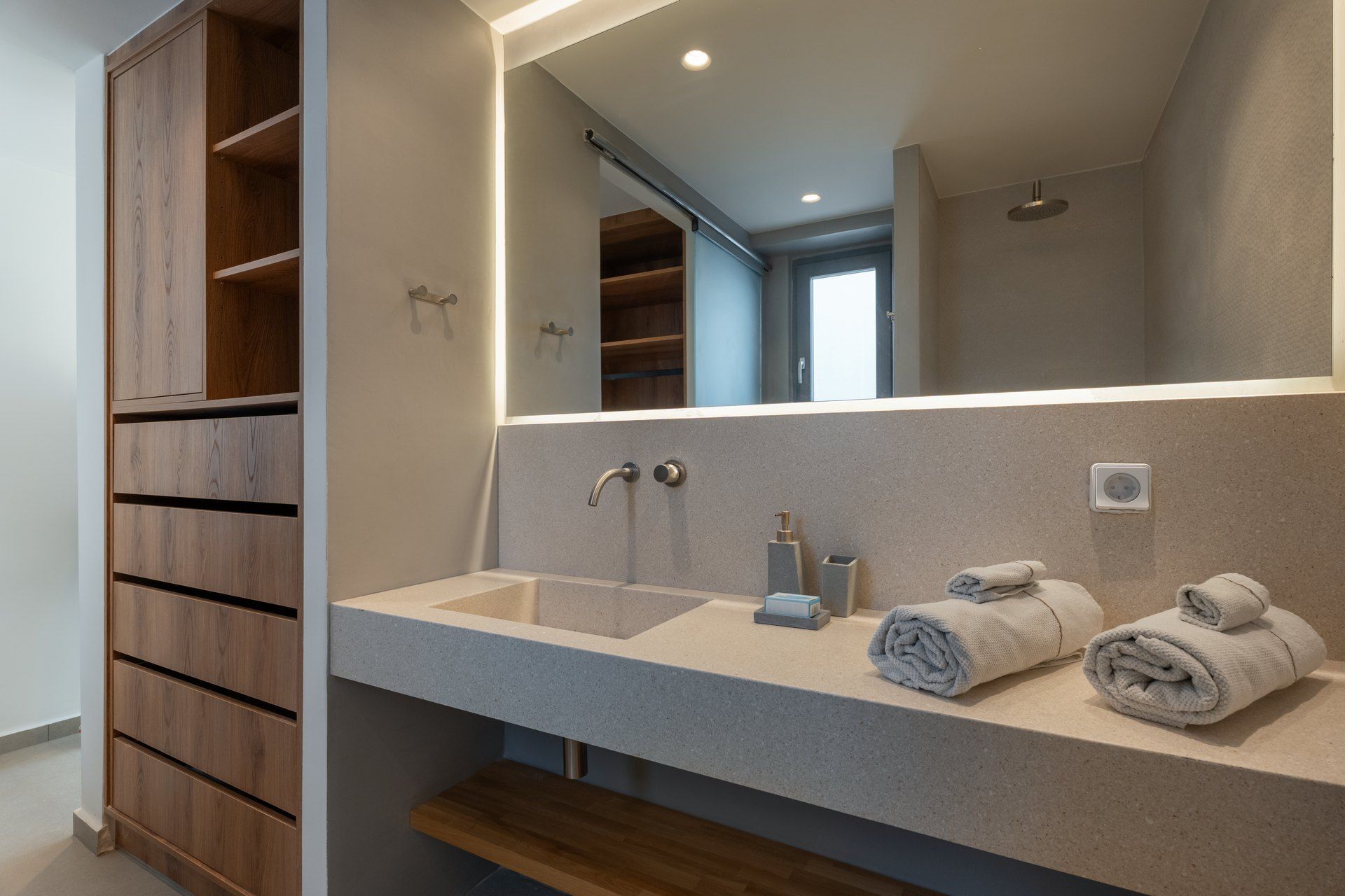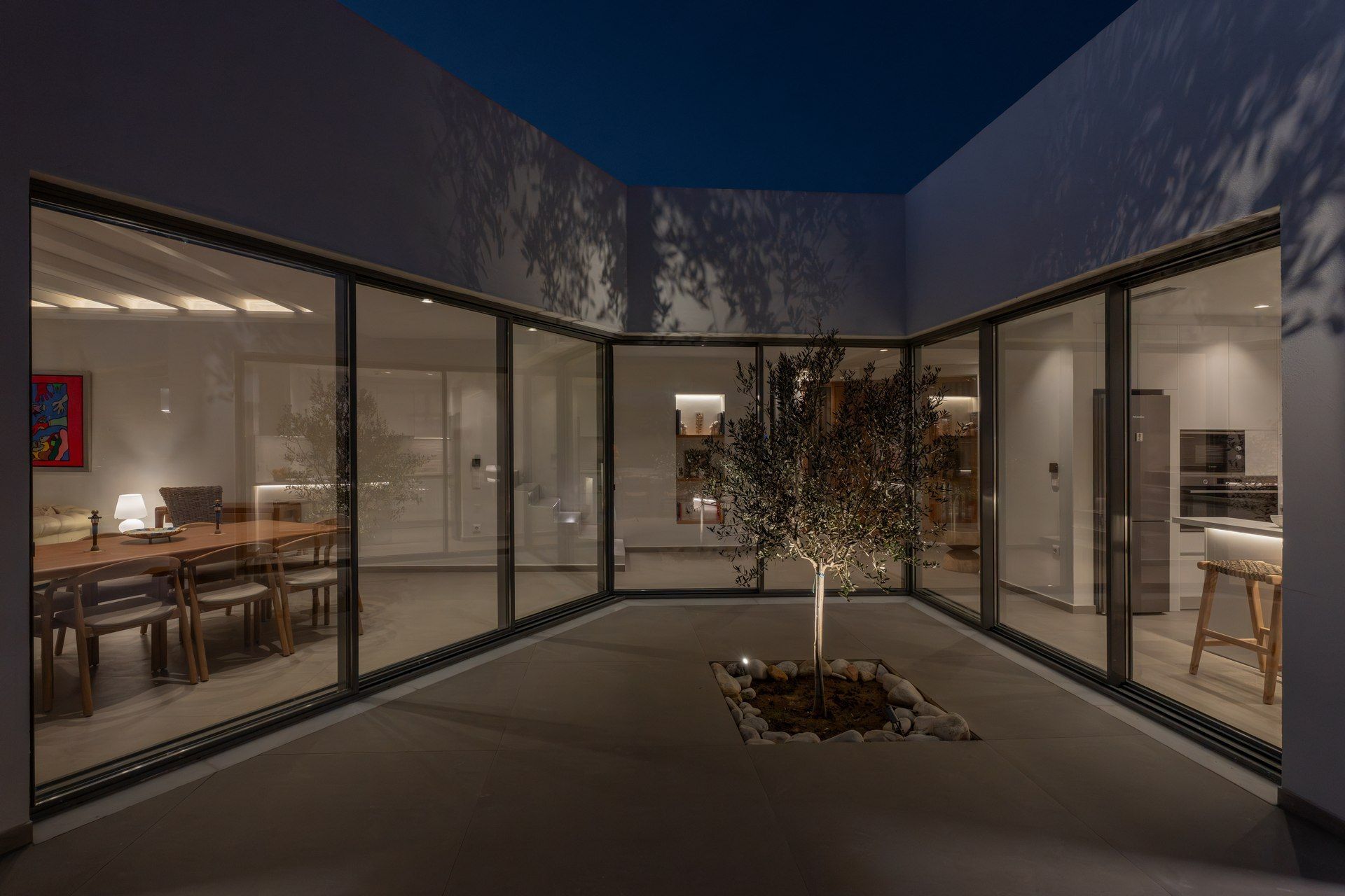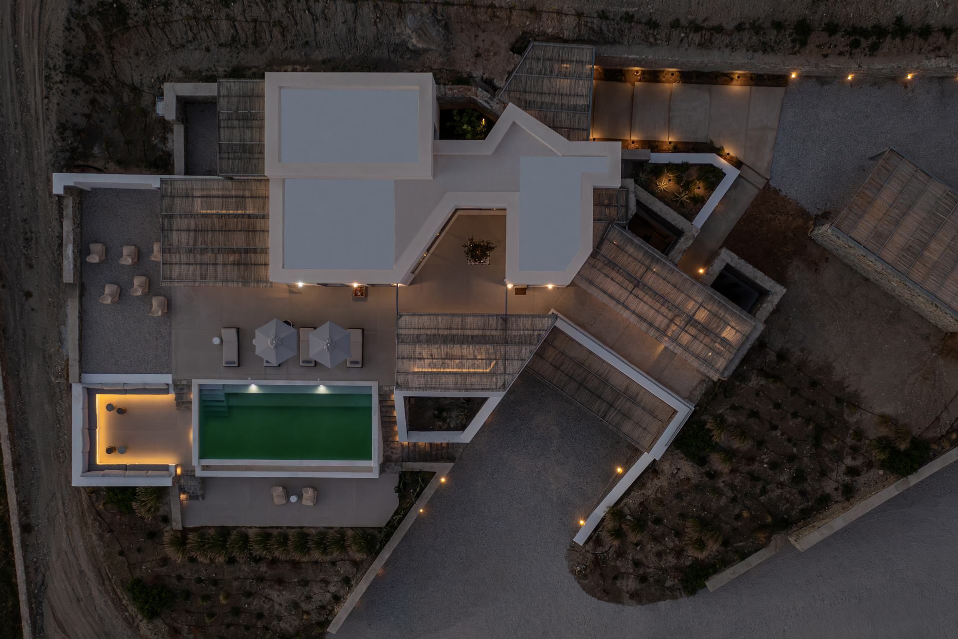 Inside, the villa follows a calm, contemporary approach, with open-plan living areas, soft tones, and large openings that connect directly to the outdoors. Four bedrooms are spread across the two levels of the main house, creating a natural sense of privacy, while the independent guesthouse features an additional bedroom and a flexible living space that can be used as a sixth bedroom when needed.