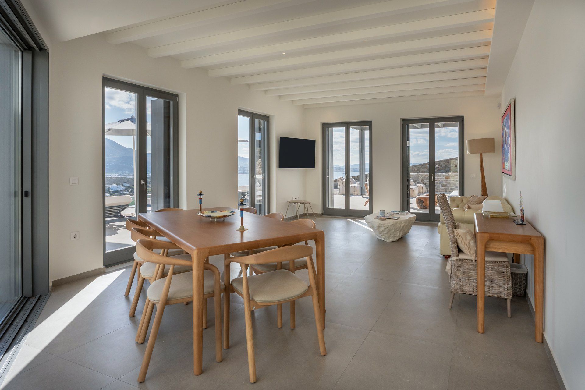Open-plan living area with TV, access to pool terrace, sea view