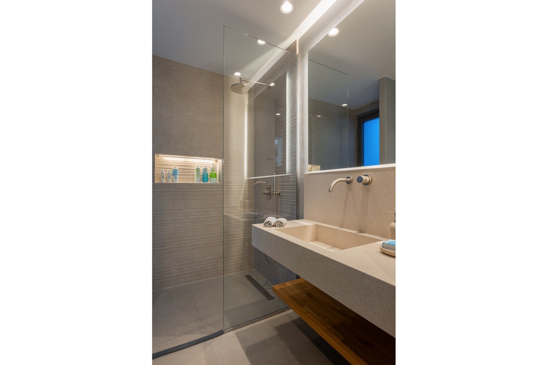 The outdoor spaces are defined by clean lines and open perspectives, with an infinity pool forming the central point of the terrace. Lounge and dining areas are arranged to support both quiet use and social moments, while the pool bar, BBQ, and open-air cinema introduce a more dynamic layer to the setting and more options for spending quality time together. The result is an exterior that feels effortless to enjoy.