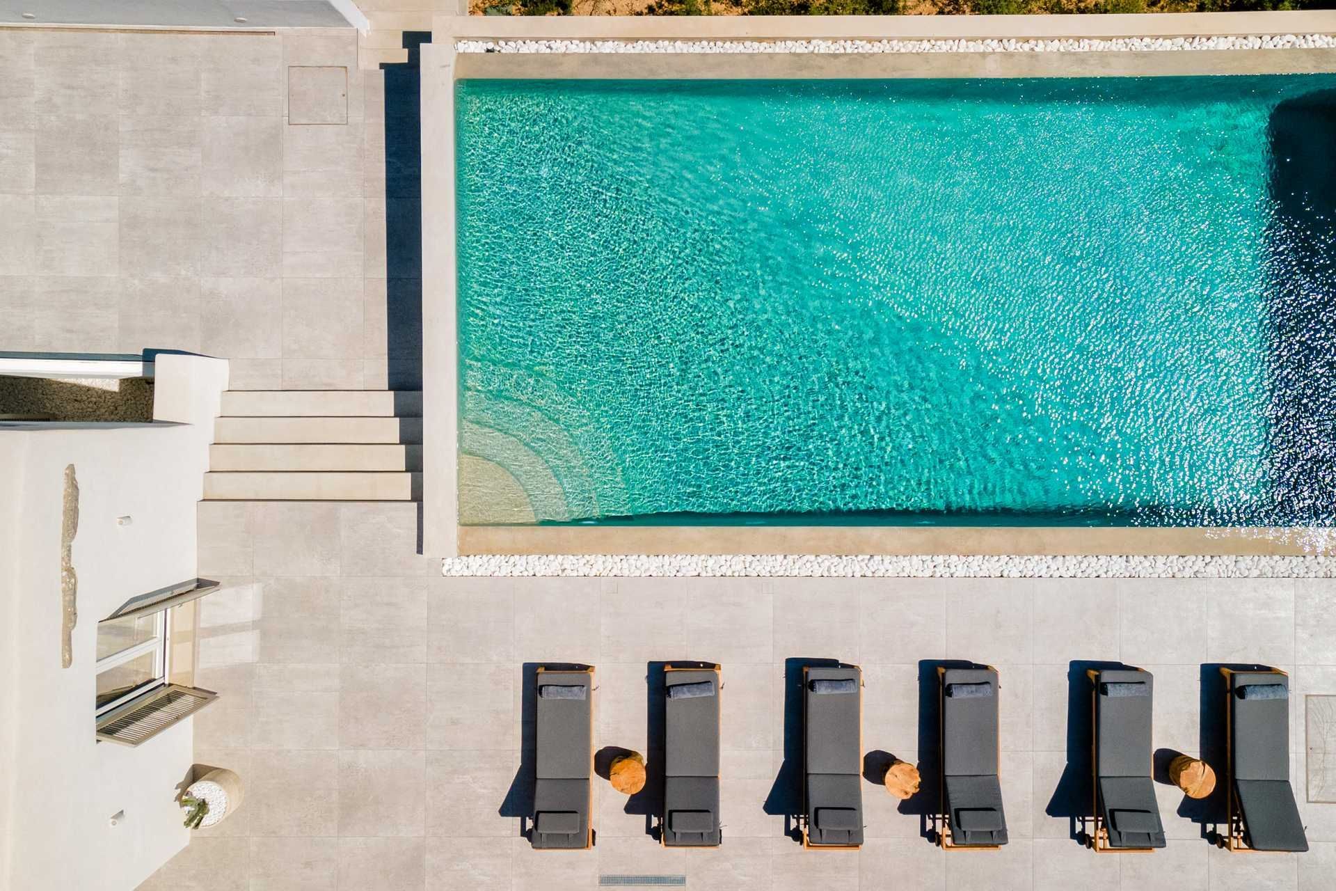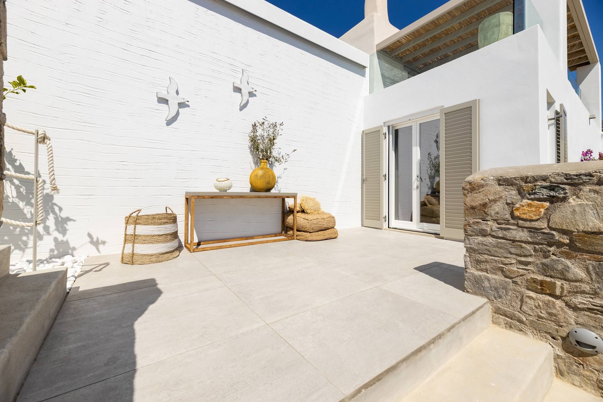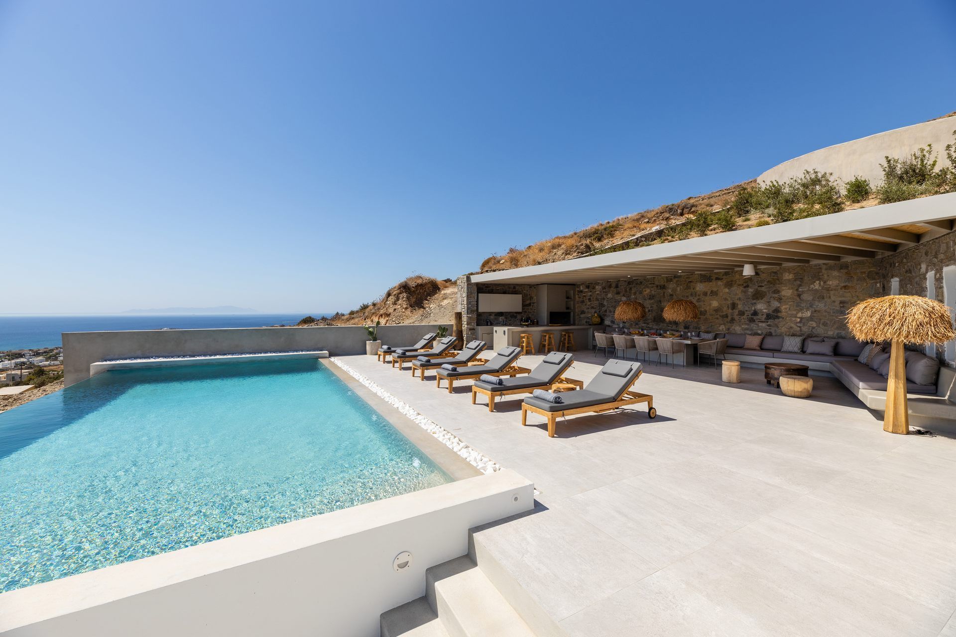 From its privileged position on the hillside, Hollis’ exterior is your private nature space, where the sky and sea blend into the perfect summer backdrop. The swimming pool with panoramic sea views is surrounded by sun loungers, and running along the side of the villa is a wooden portico to provide shade with a view. There is also a stylish alfresco dining area, a lounge area, and a BBQ to test your cooking skills. Designer garden furniture, comfortable cushions, and local stone features blend harmoniously with nature's beauty to create an outdoor summer living space you will not want to leave.