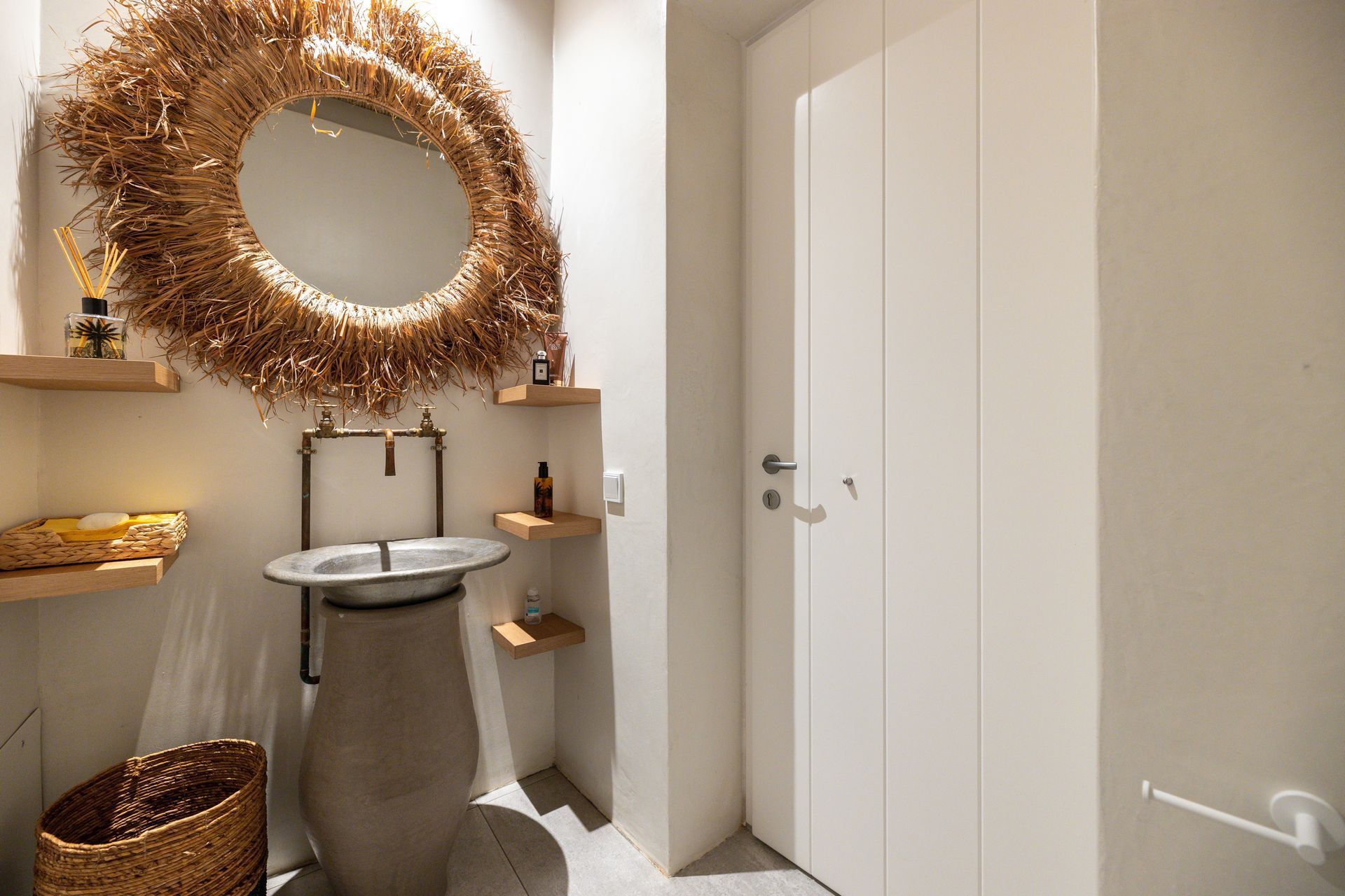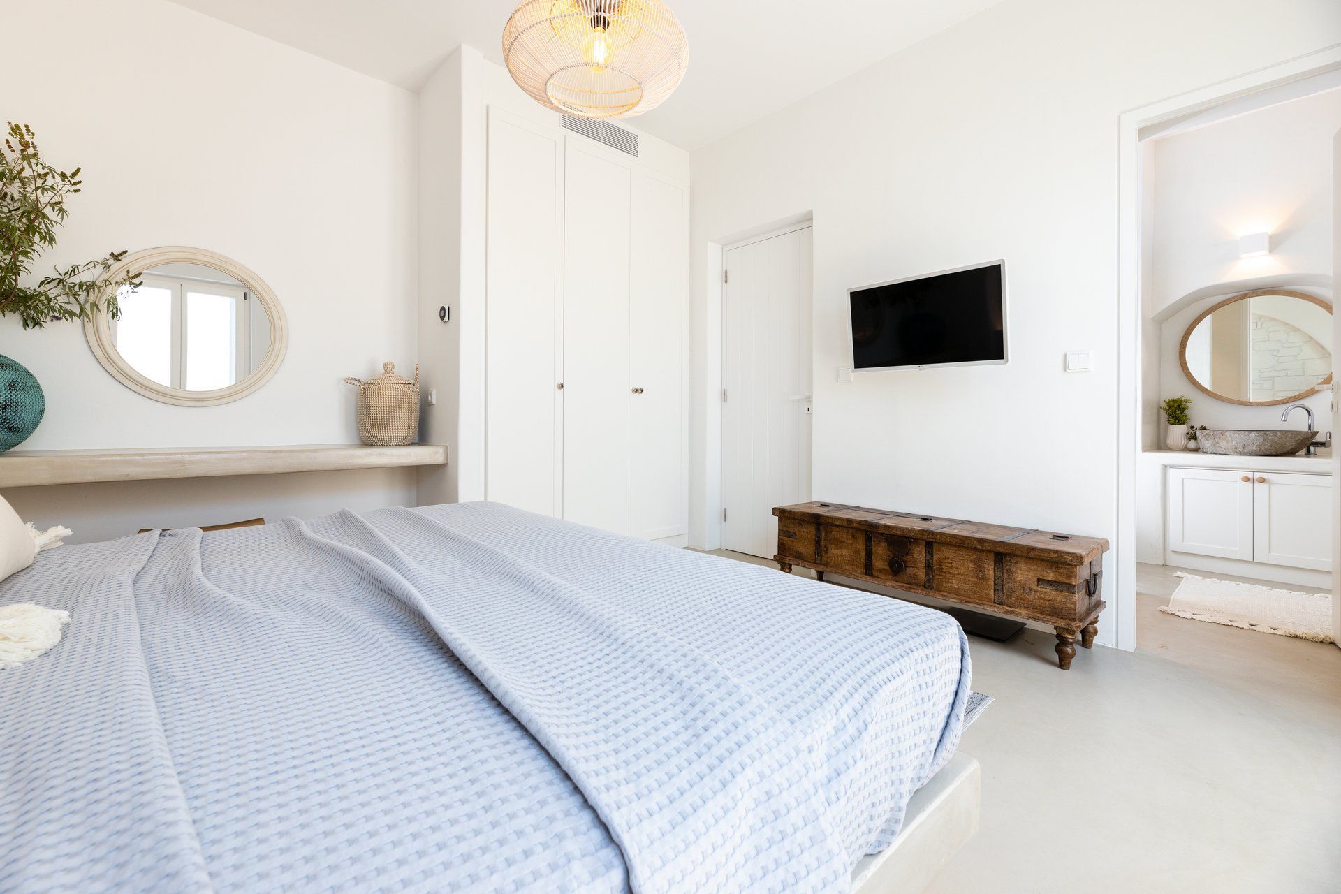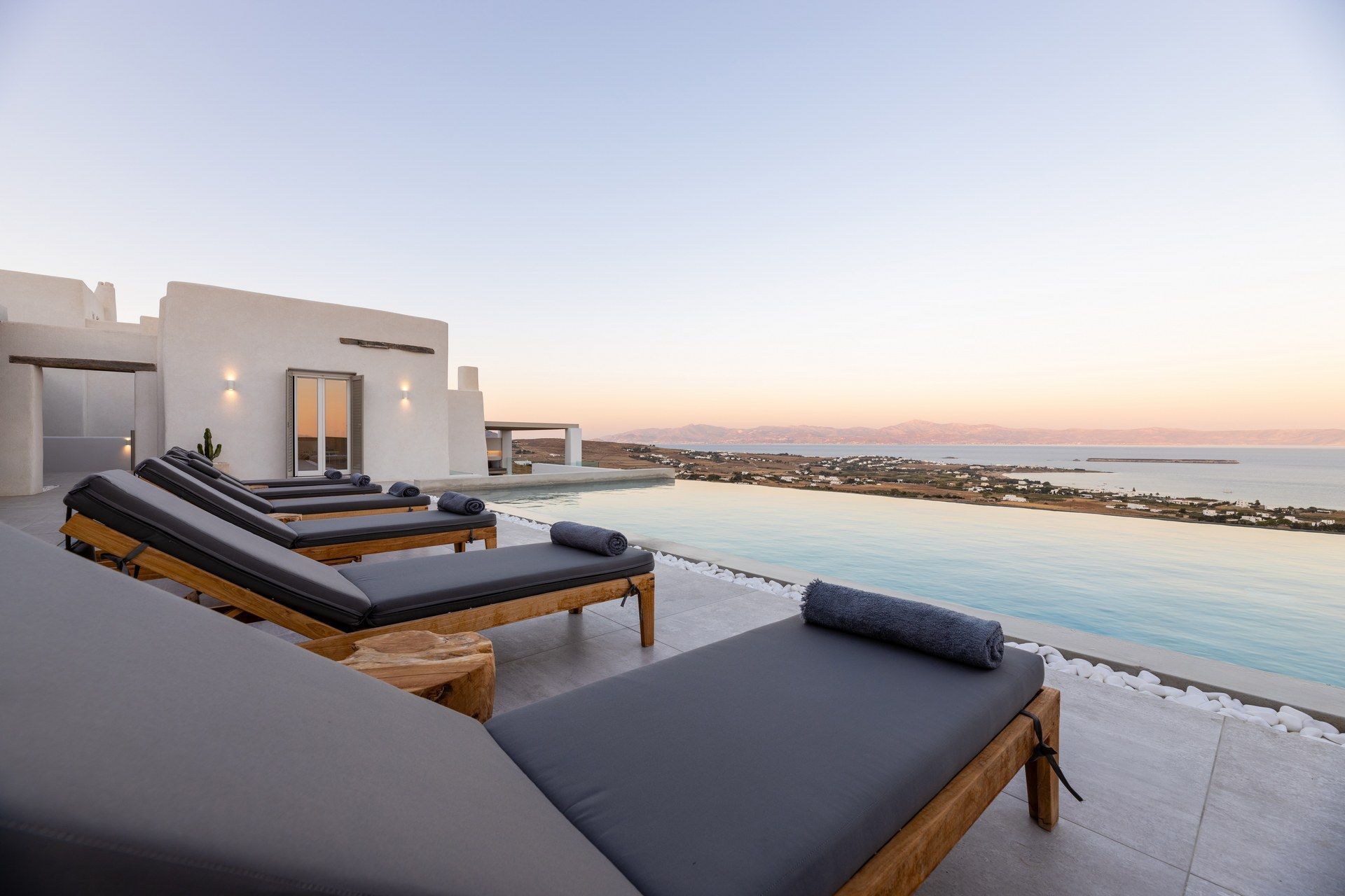 From its privileged position on the hillside, Hollis’ exterior is your private nature space, where the sky and sea blend into the perfect summer backdrop. The swimming pool with panoramic sea views is surrounded by sun loungers, and running along the side of the villa is a wooden portico to provide shade with a view. There is also a stylish alfresco dining area, a lounge area, and a BBQ to test your cooking skills. Designer garden furniture, comfortable cushions, and local stone features blend harmoniously with nature's beauty to create an outdoor summer living space you will not want to leave.
