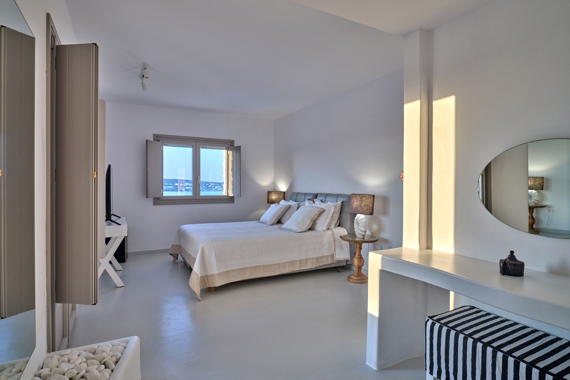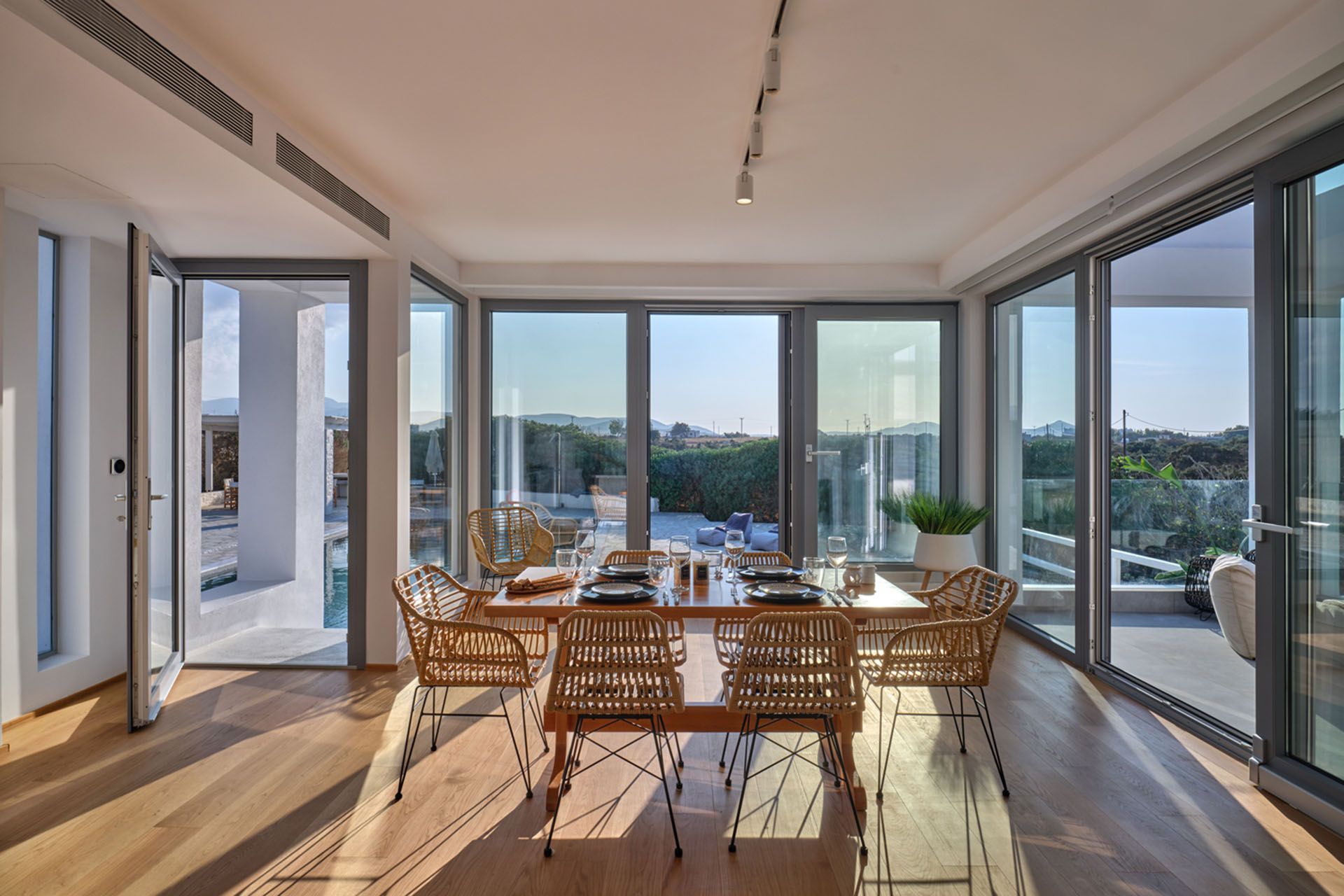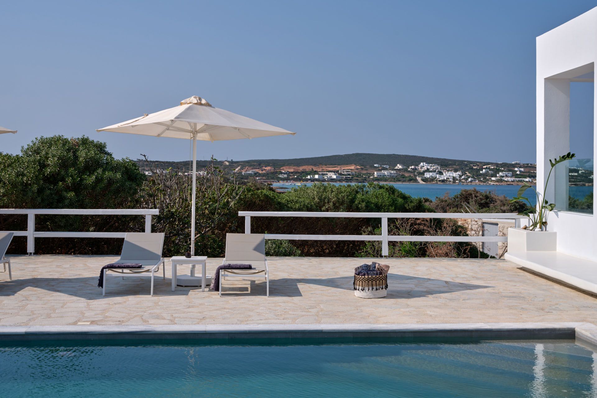 At first, what stands out is the clean white geometry and the large pool in front, but after a little time the real appeal of Villa Magdalena becomes clearer: the beach close by, the ease of the layout, and the way the house seems to support a group without ever feeling crowded. In Santa Maria, with five ensuite bedrooms for up to ten guests, it offers a lighter, more relaxed take on island living that feels true to Paros. The Cycladic language is there, of course, in the white walls and pale stone, but the mood is less postcard and more lived-in summer.