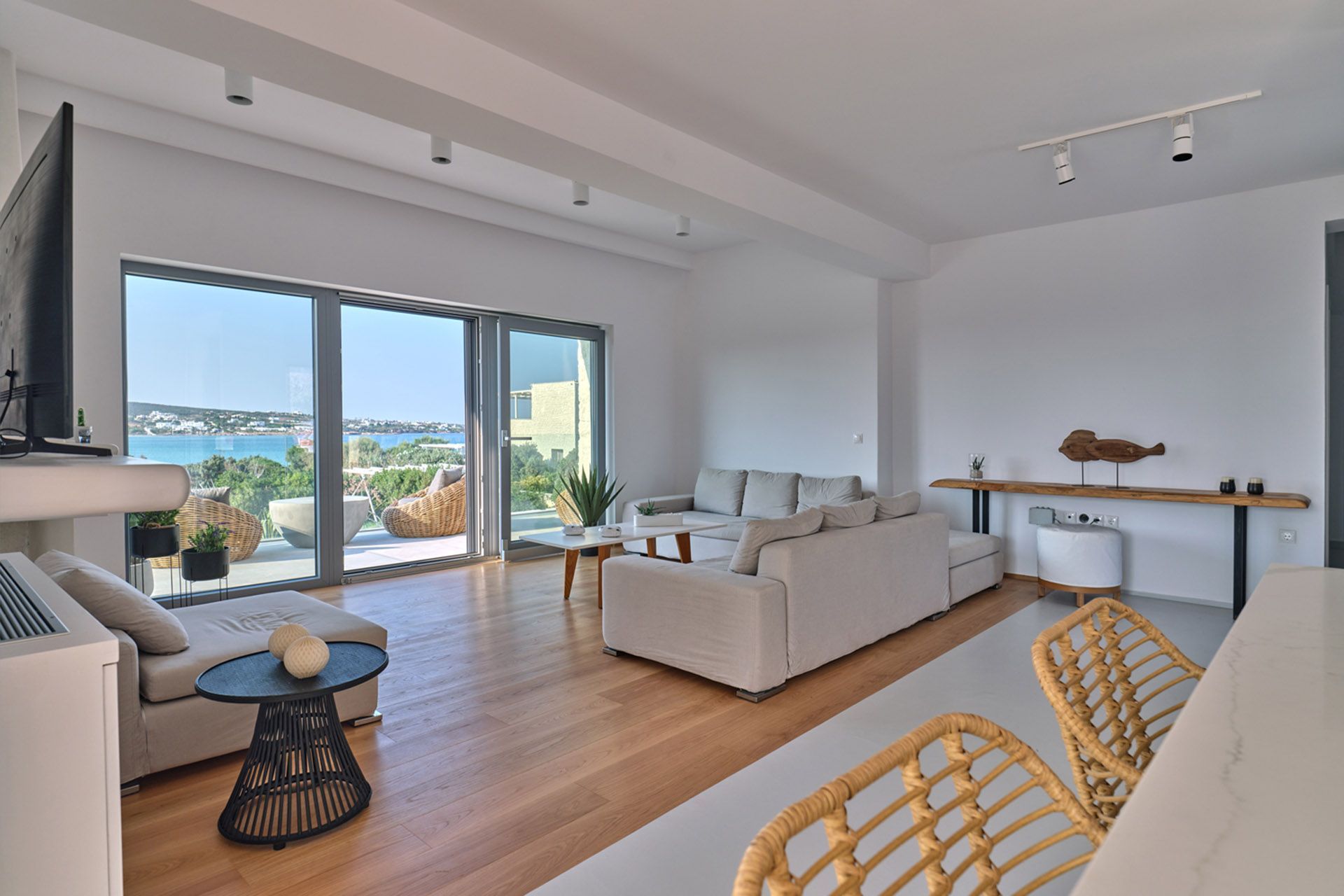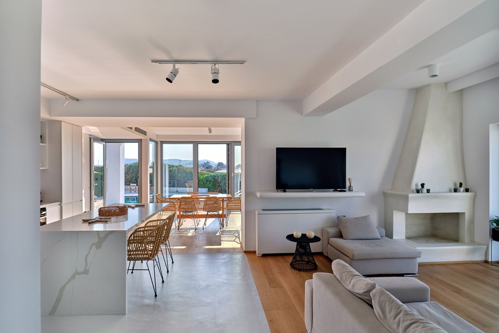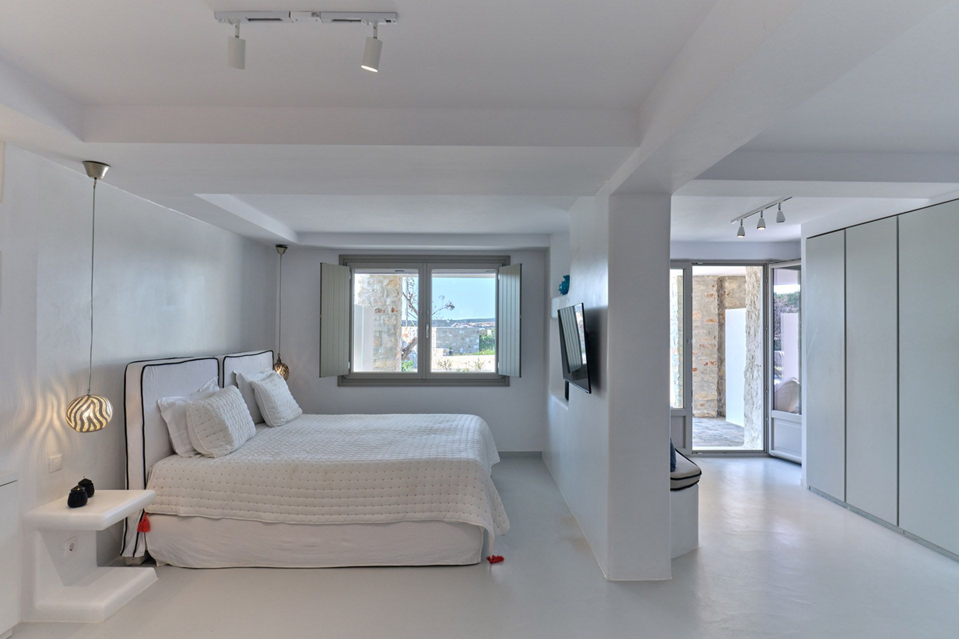 At first, what stands out is the clean white geometry and the large pool in front, but after a little time the real appeal of Villa Magdalena becomes clearer: the beach close by, the ease of the layout, and the way the house seems to support a group without ever feeling crowded. In Santa Maria, with five ensuite bedrooms for up to ten guests, it offers a lighter, more relaxed take on island living that feels true to Paros. The Cycladic language is there, of course, in the white walls and pale stone, but the mood is less postcard and more lived-in summer.