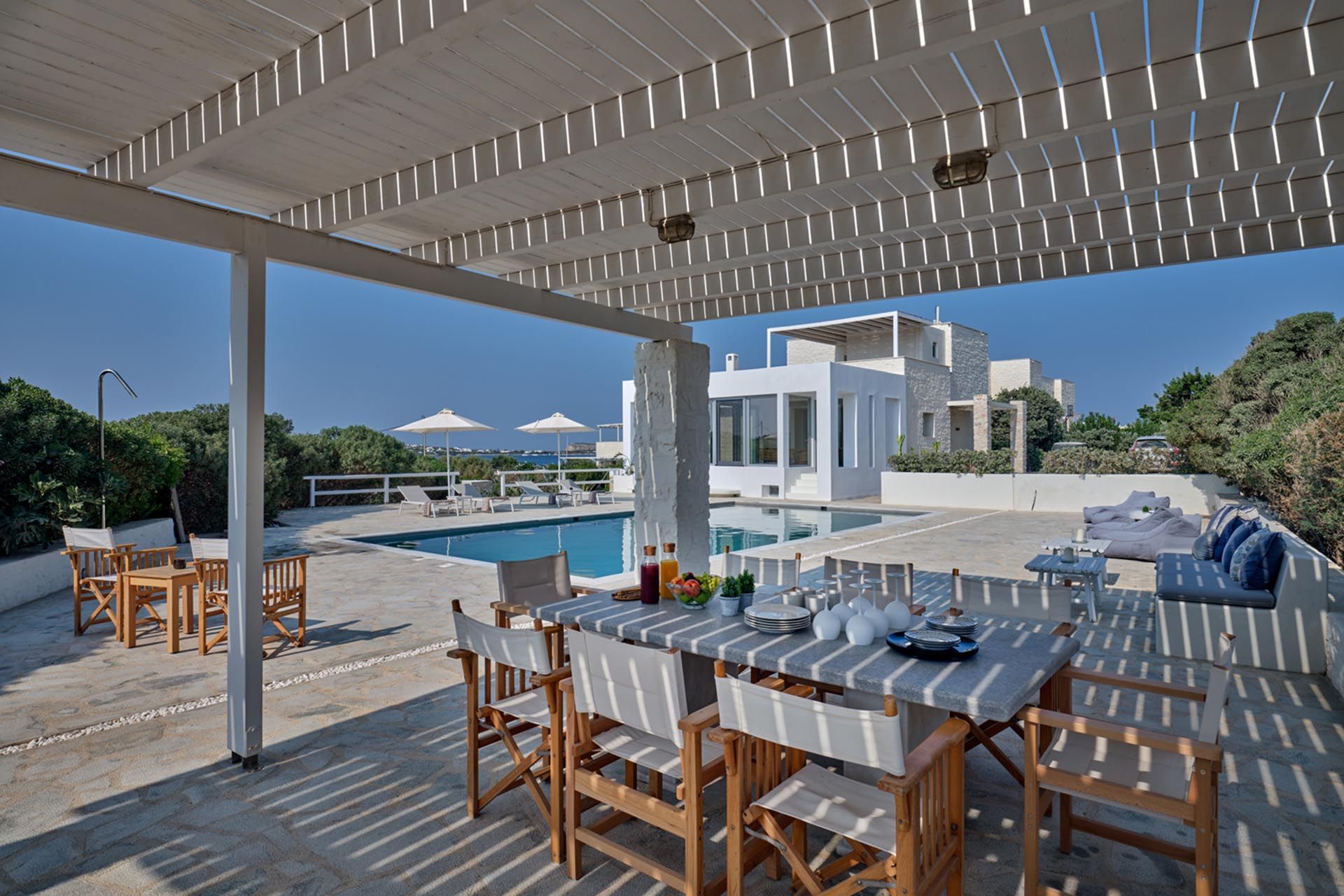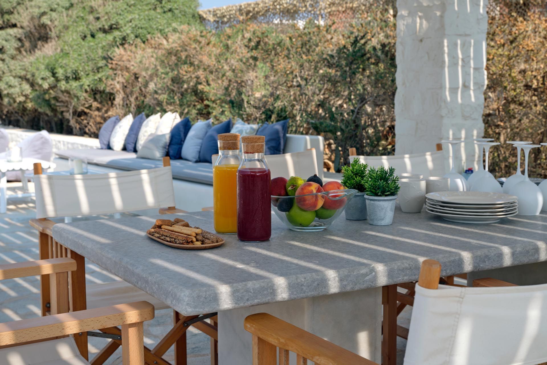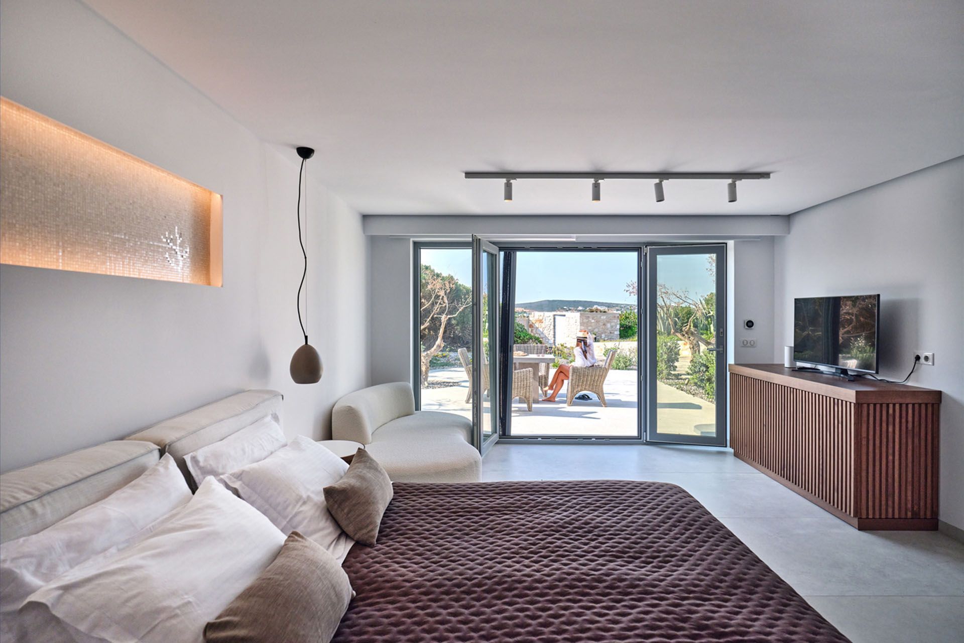 The outdoor spaces are central to the stay and among the villa’s strongest features. The pool terrace is broad and sunlit, with enough room for everyone to spread out, then come back together under the shaded pergola for lunch or dinner from the barbecue. There is a nice balance between openness and shelter here, and that is what makes the space work so well. You can spend the whole day at home, drift down to the beach, or return from Naousa and still feel as though the evening begins again around the pool.