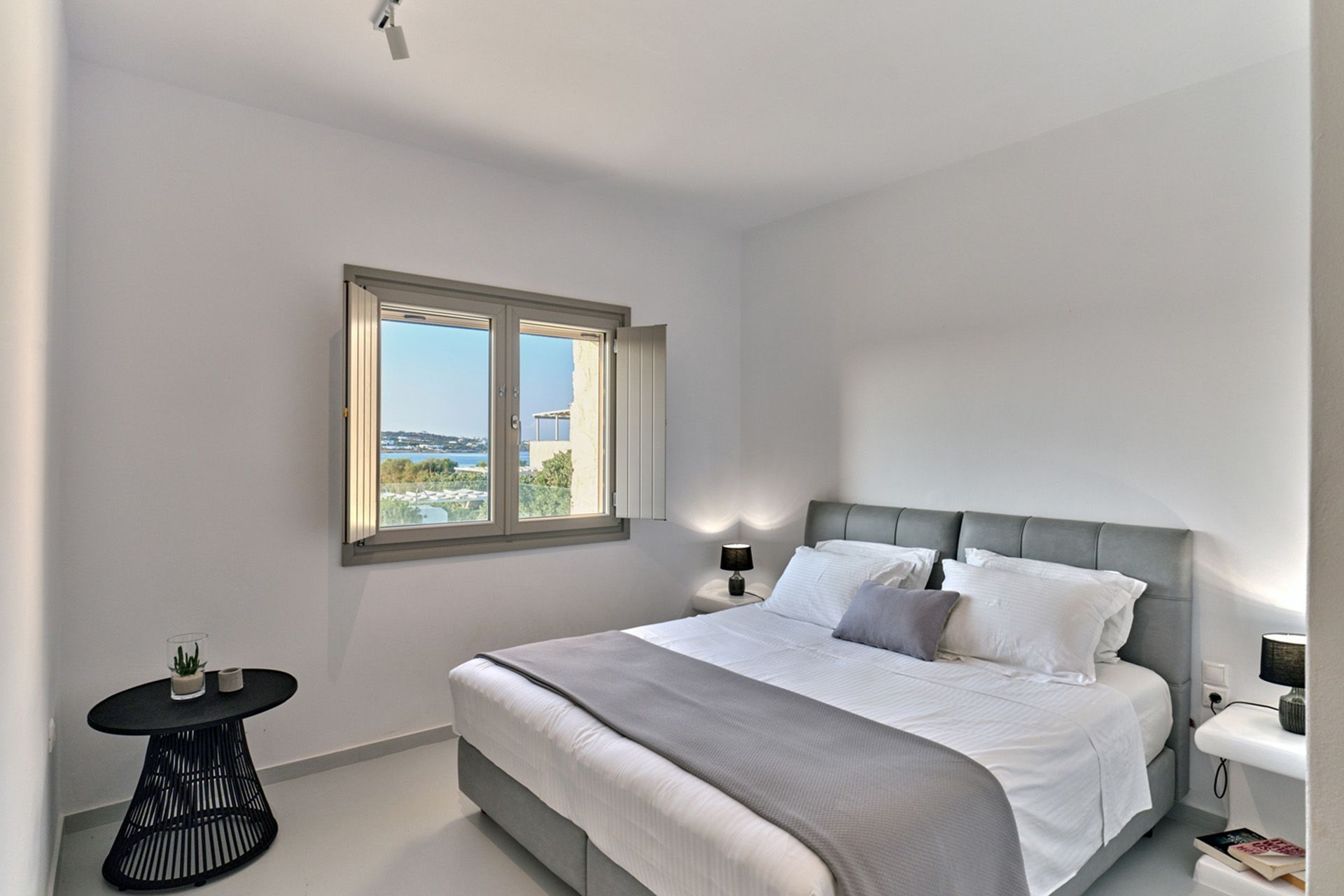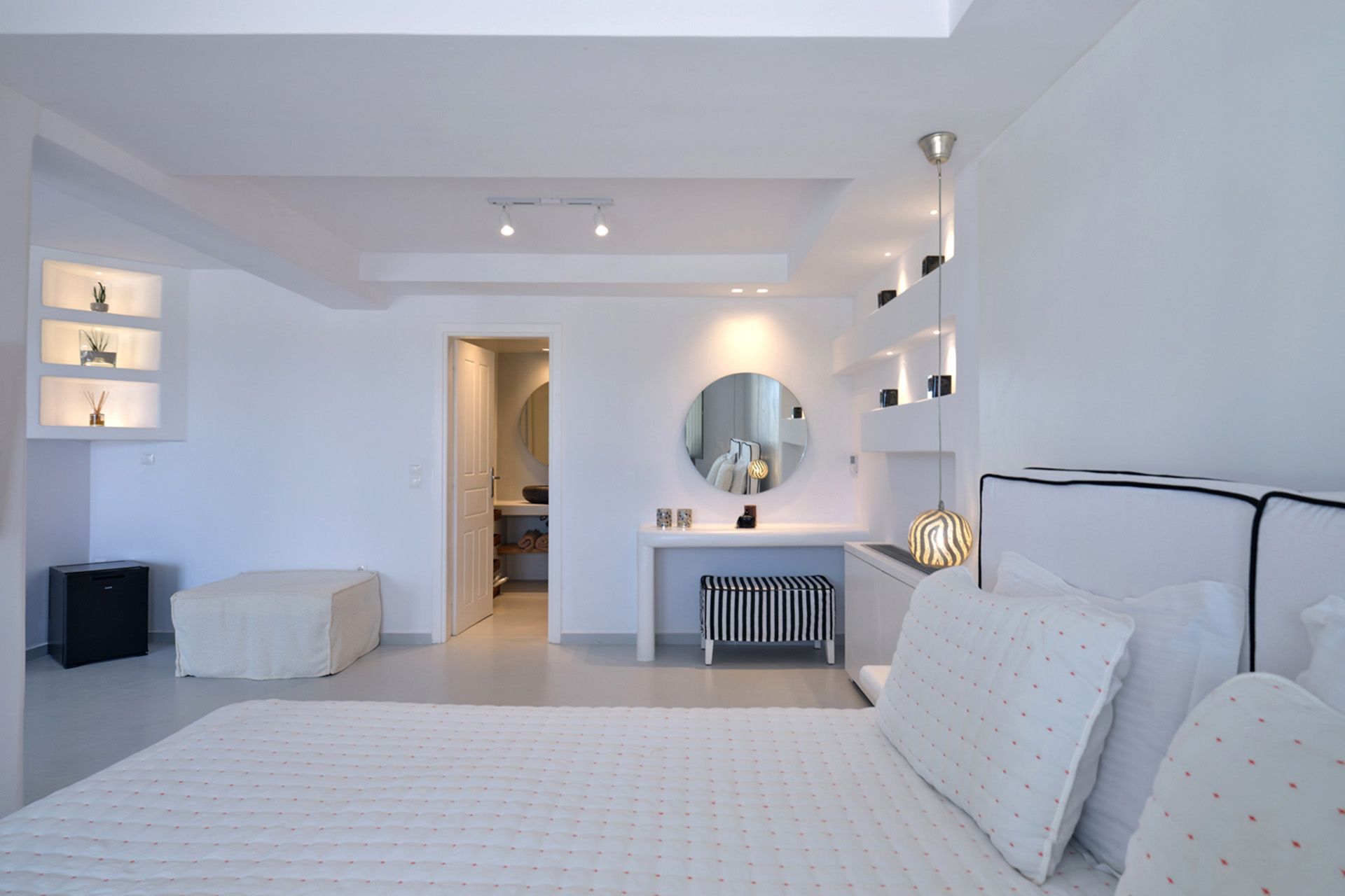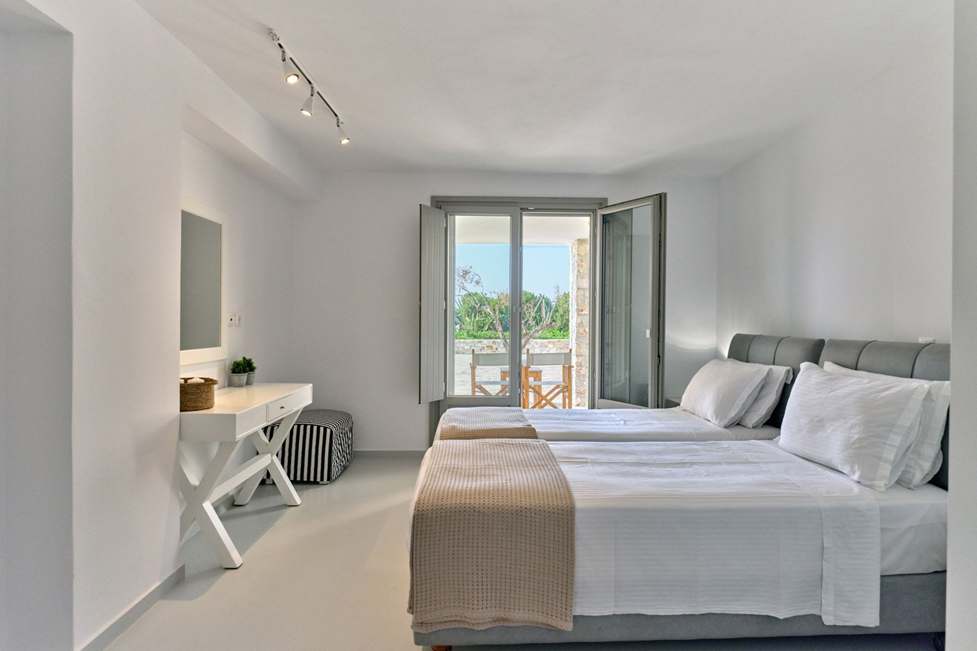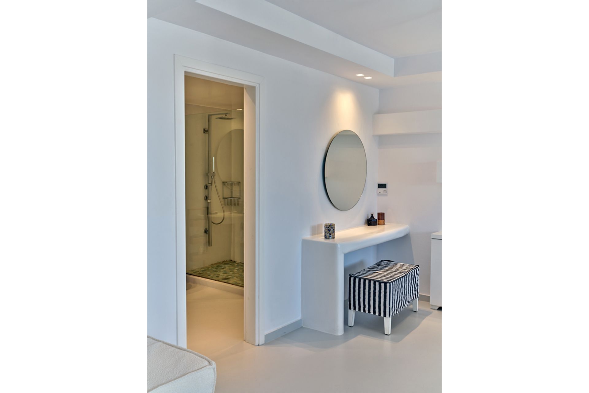 One of the key advantages of staying here is that the day does not need much planning. The nearest sandy beach is just a a few steps away, which gives the villa a more natural connection to the sea, while Naousa remains a short drive further for spontaneous dinners and evenings out. Santa Maria Beach is also nearby, adding another option when the day calls for something more lively.