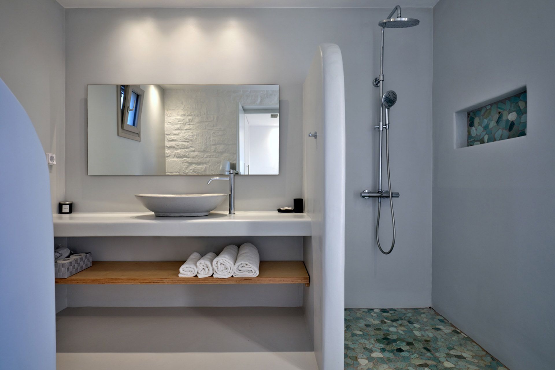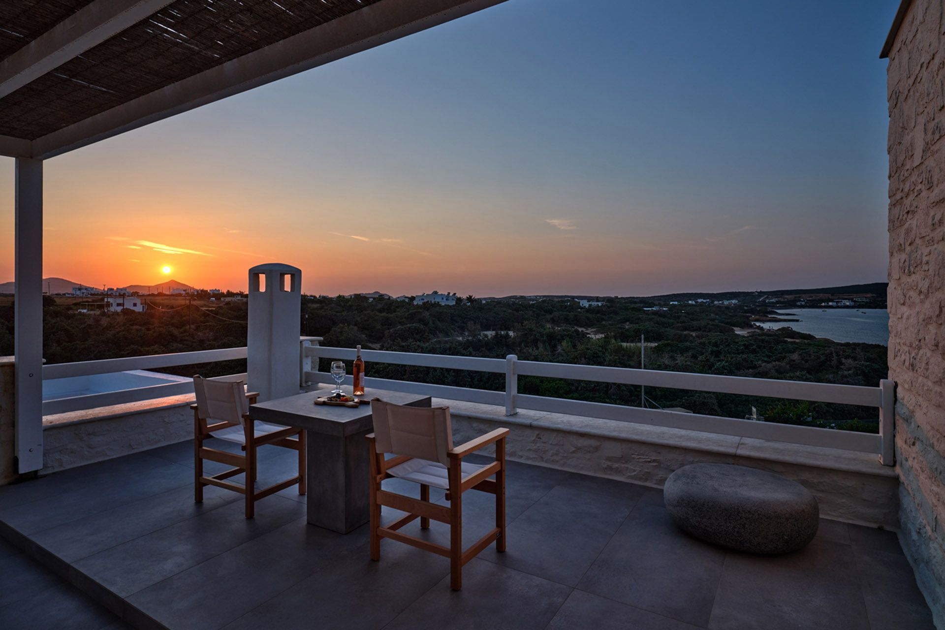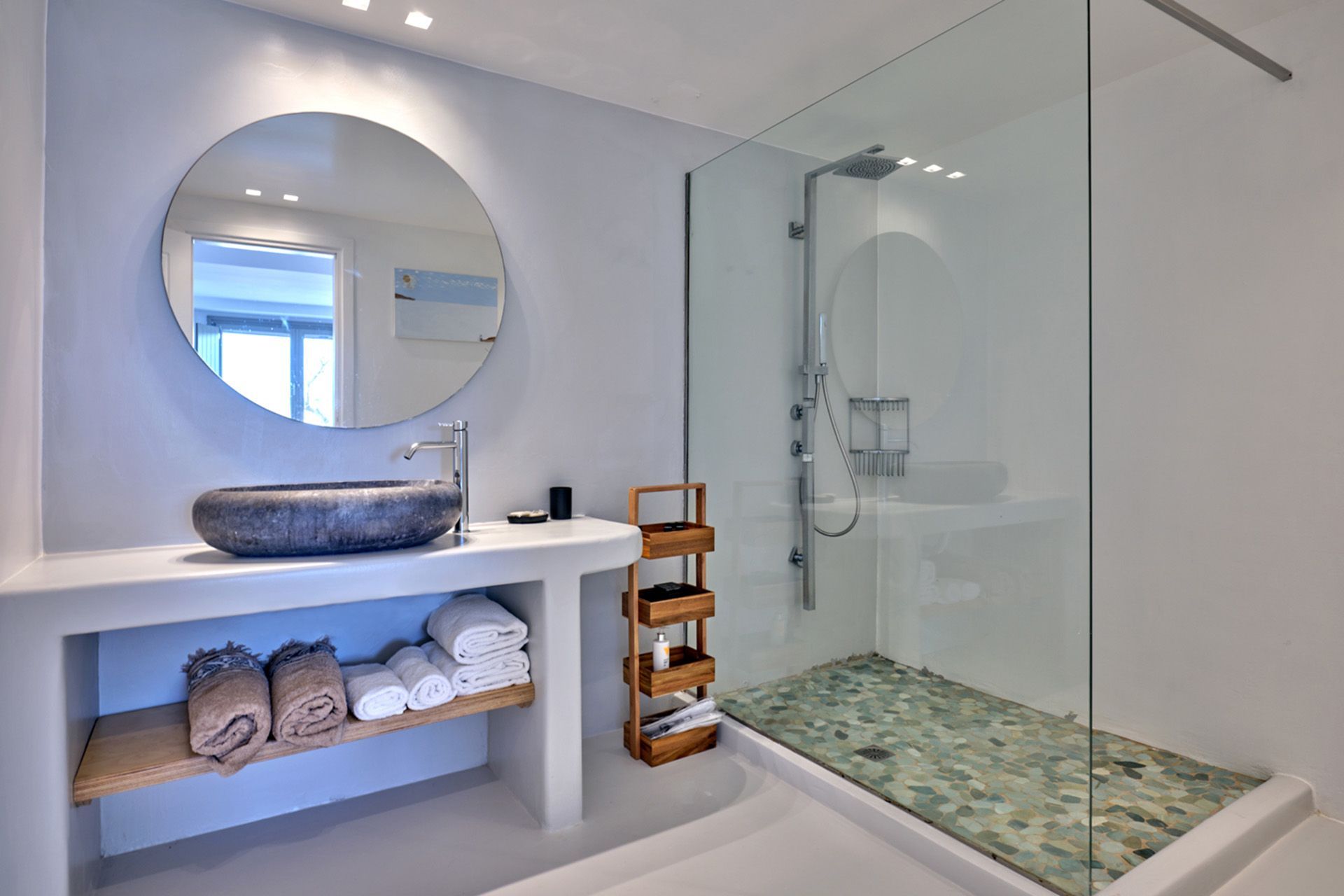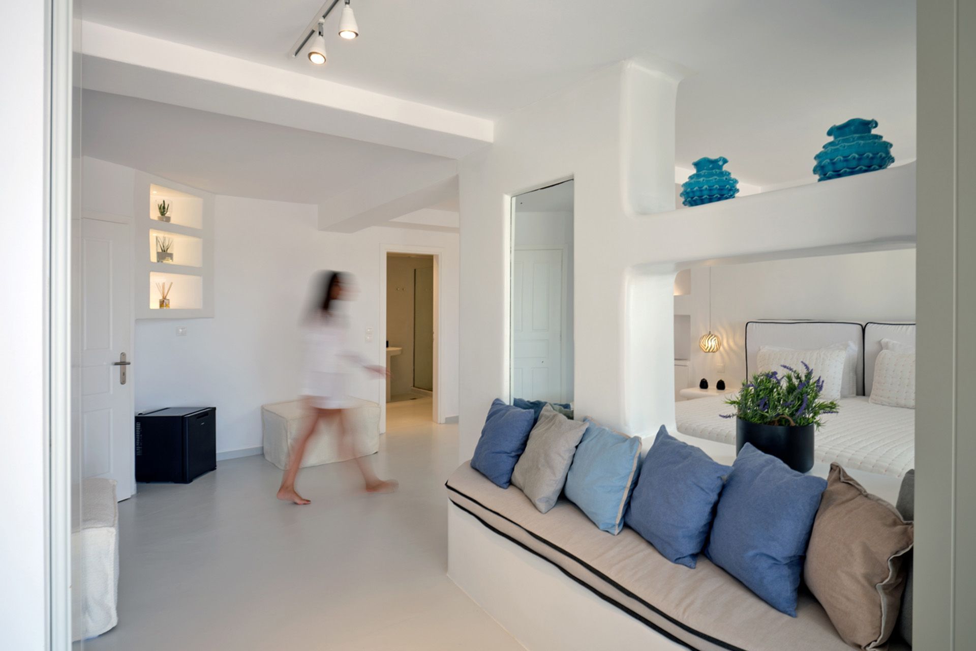 One of the key advantages of staying here is that the day does not need much planning. The nearest sandy beach is just a a few steps away, which gives the villa a more natural connection to the sea, while Naousa remains a short drive further for spontaneous dinners and evenings out. Santa Maria Beach is also nearby, adding another option when the day calls for something more lively.