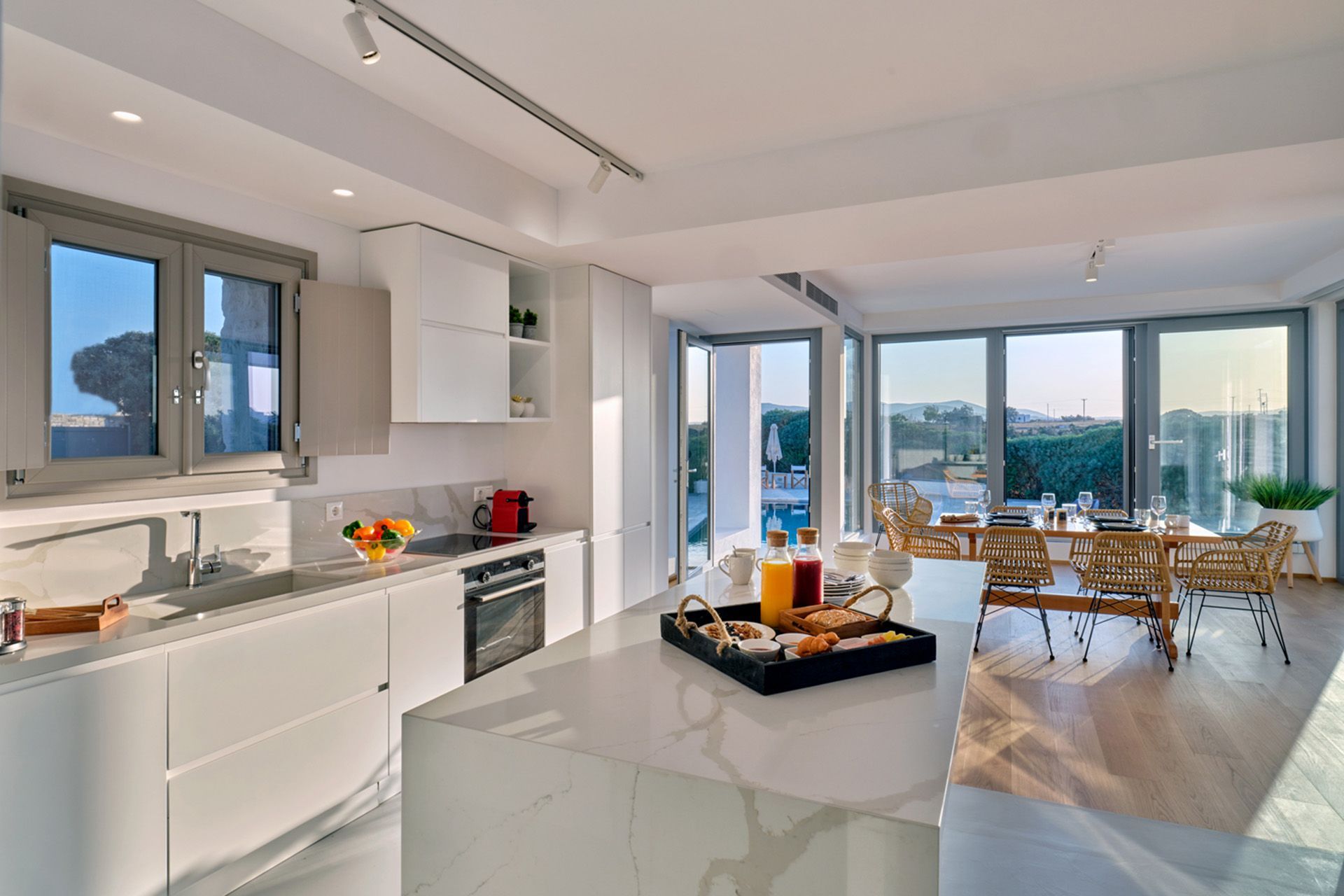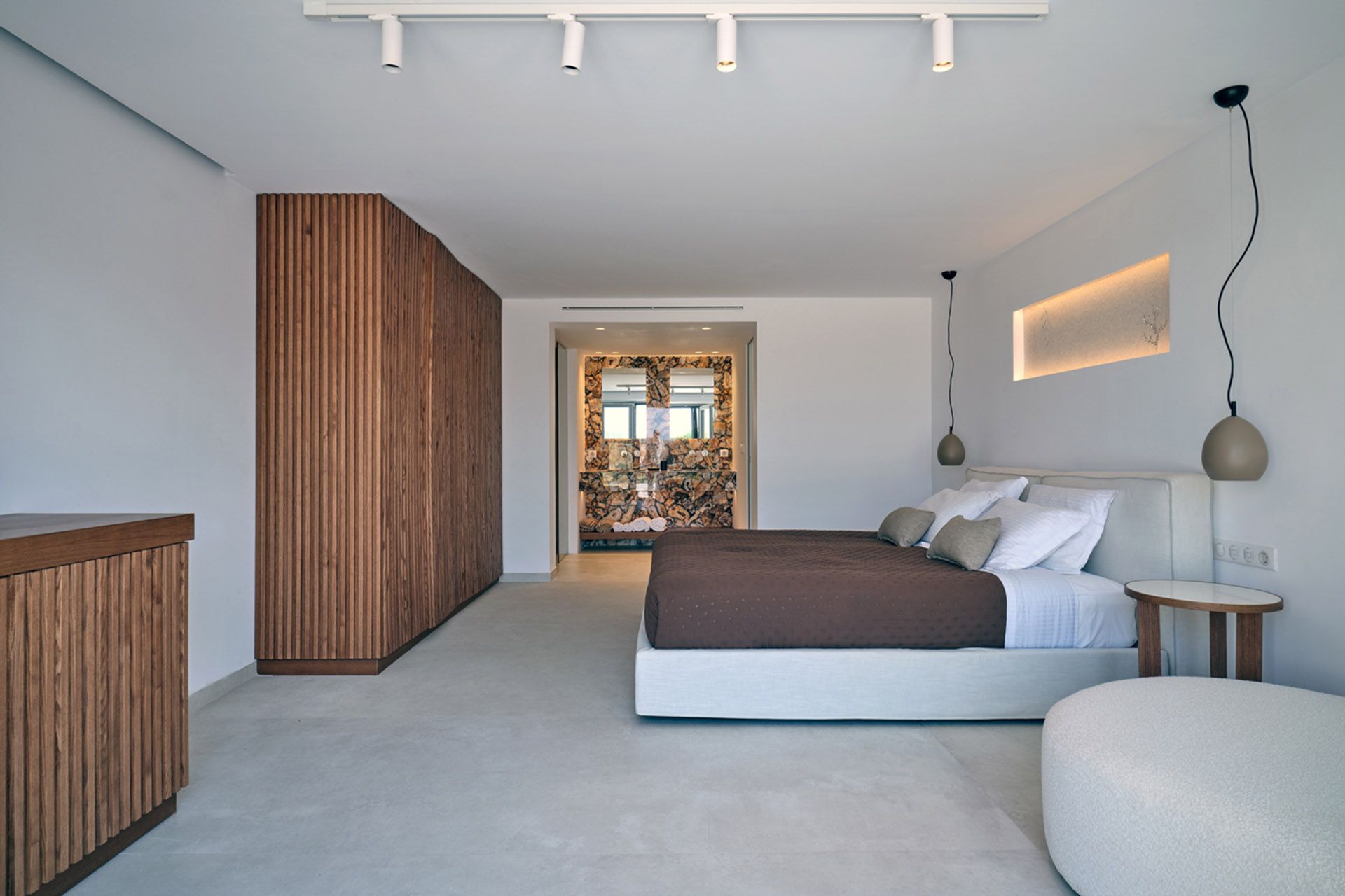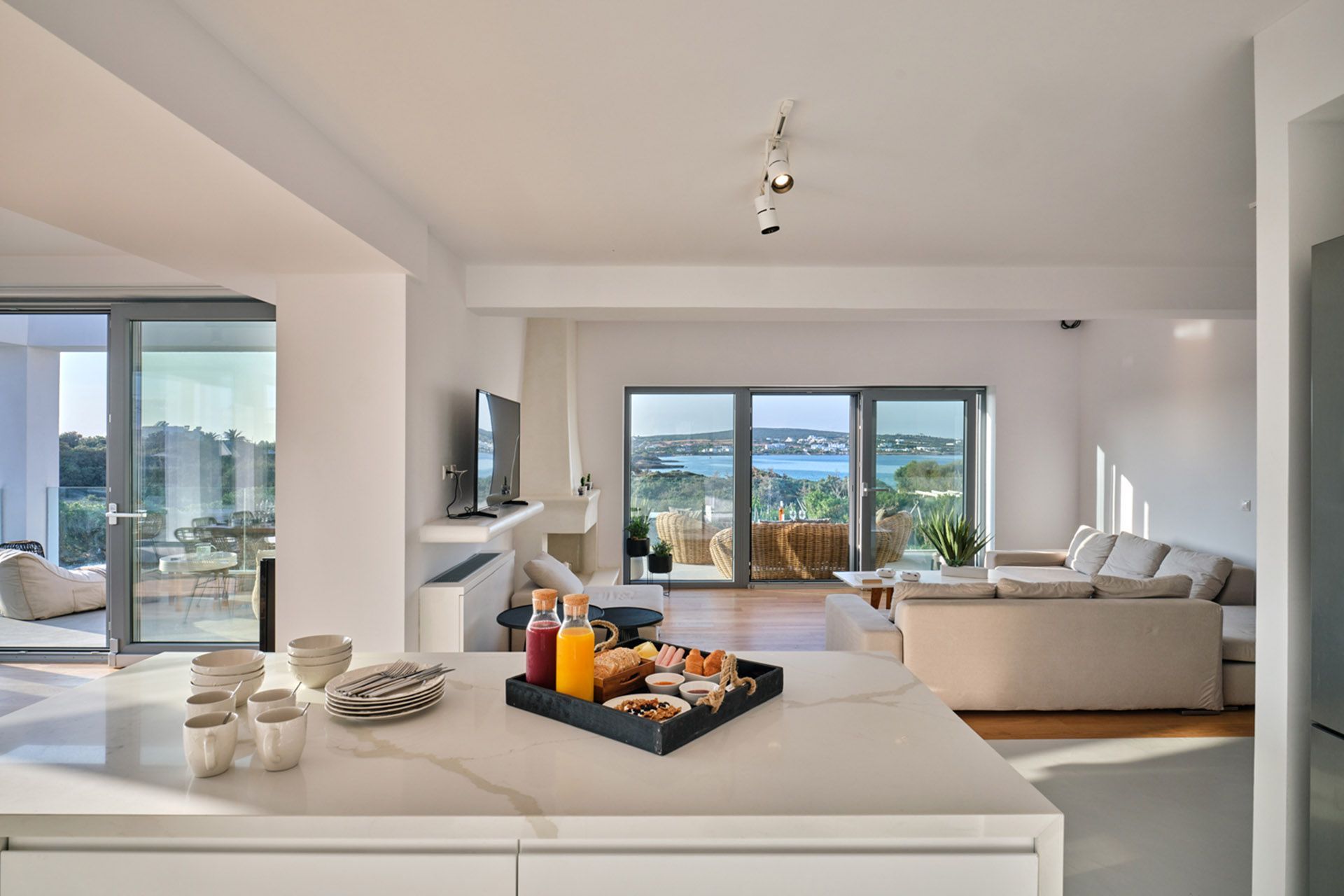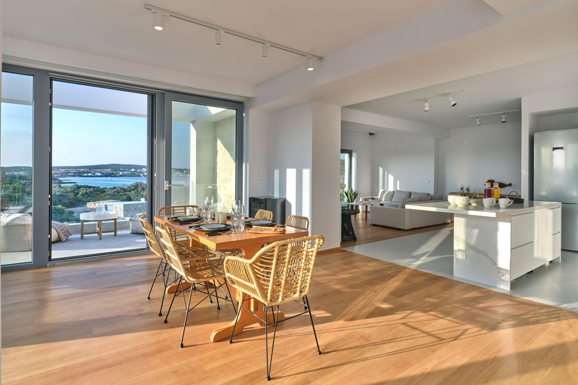 Inside, Magdalena keeps the same calm tone. The main living area, kitchen, and dining space are arranged to stay connected and full of light, with soft whites, pale woods, and a few woven details adding warmth without disturbing the villa’s simplicity. The bedrooms are distributed across several levels, which gives guests a real sense of independence, and the guest room adds another useful layer of privacy. It is a house that feels practical for a group, but still elegant enough to offer a proper luxury escape.