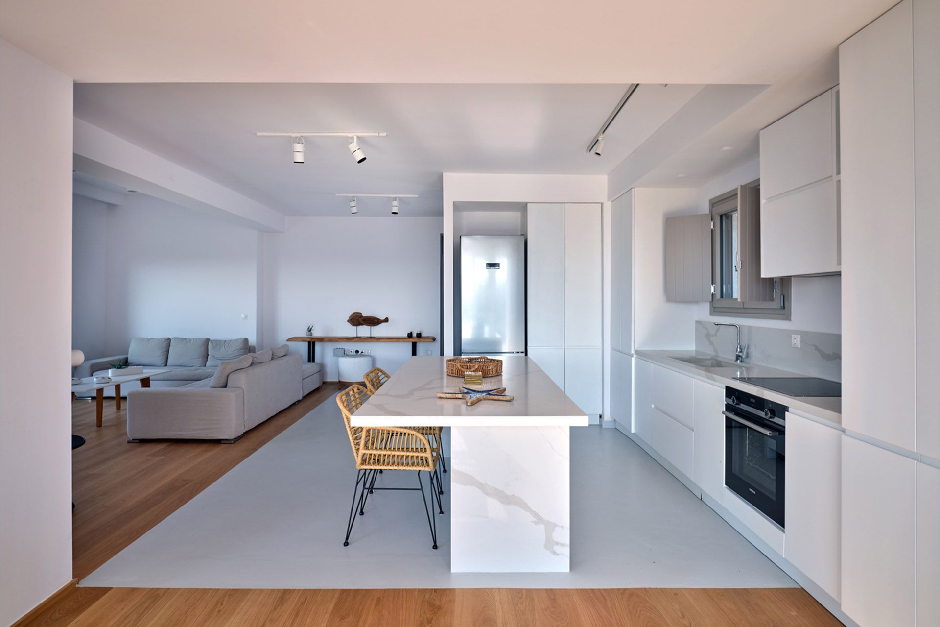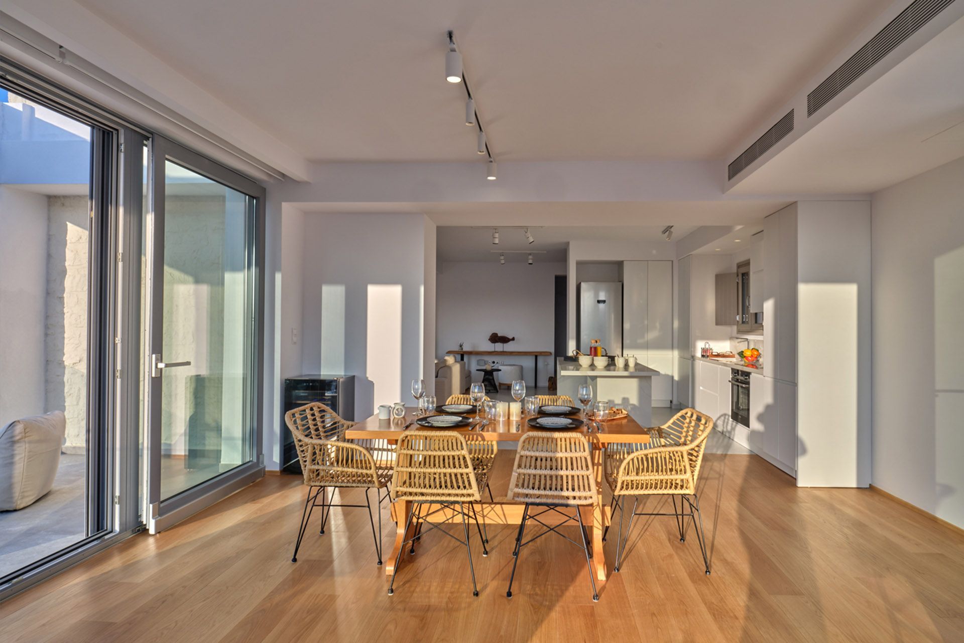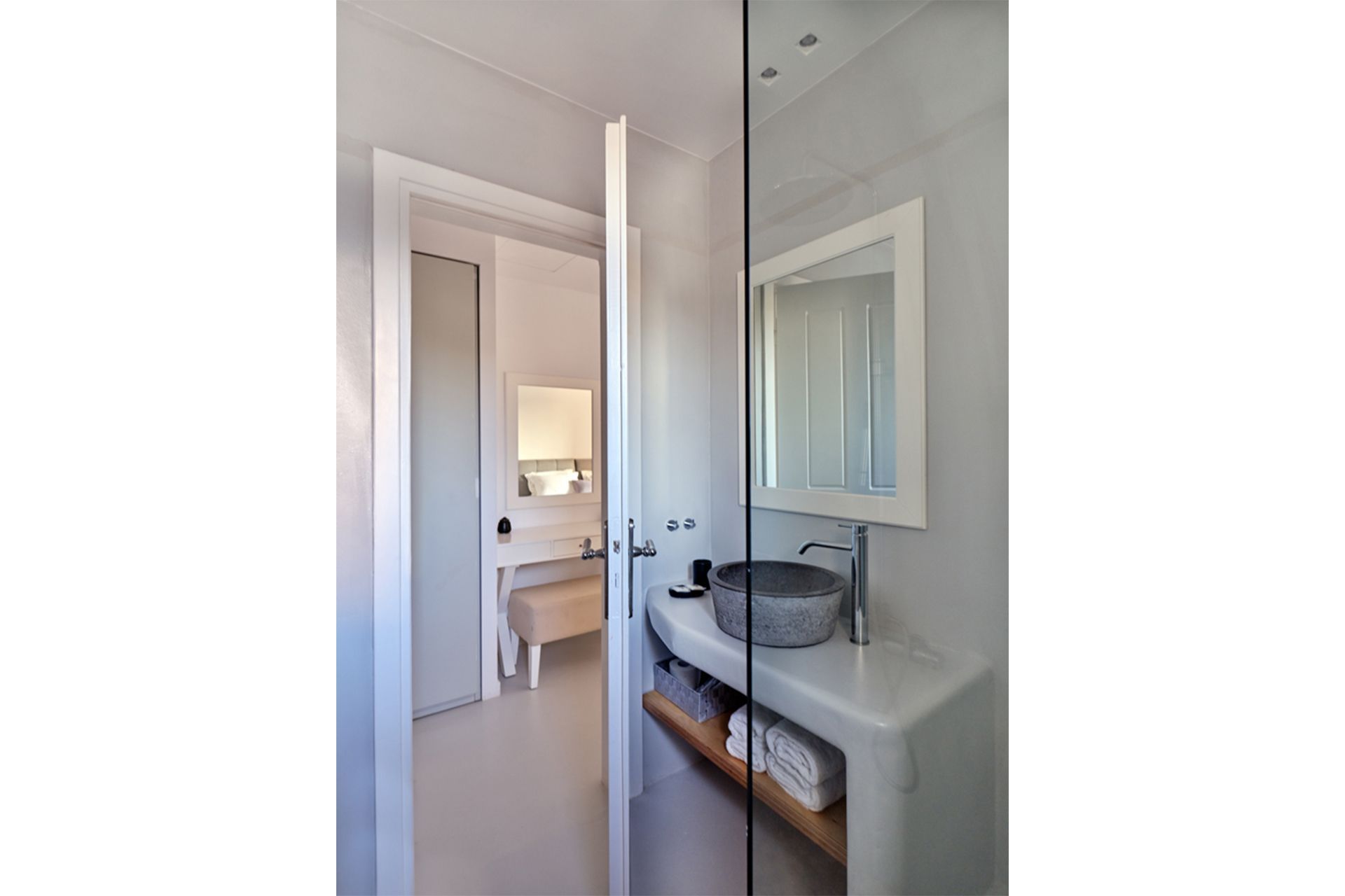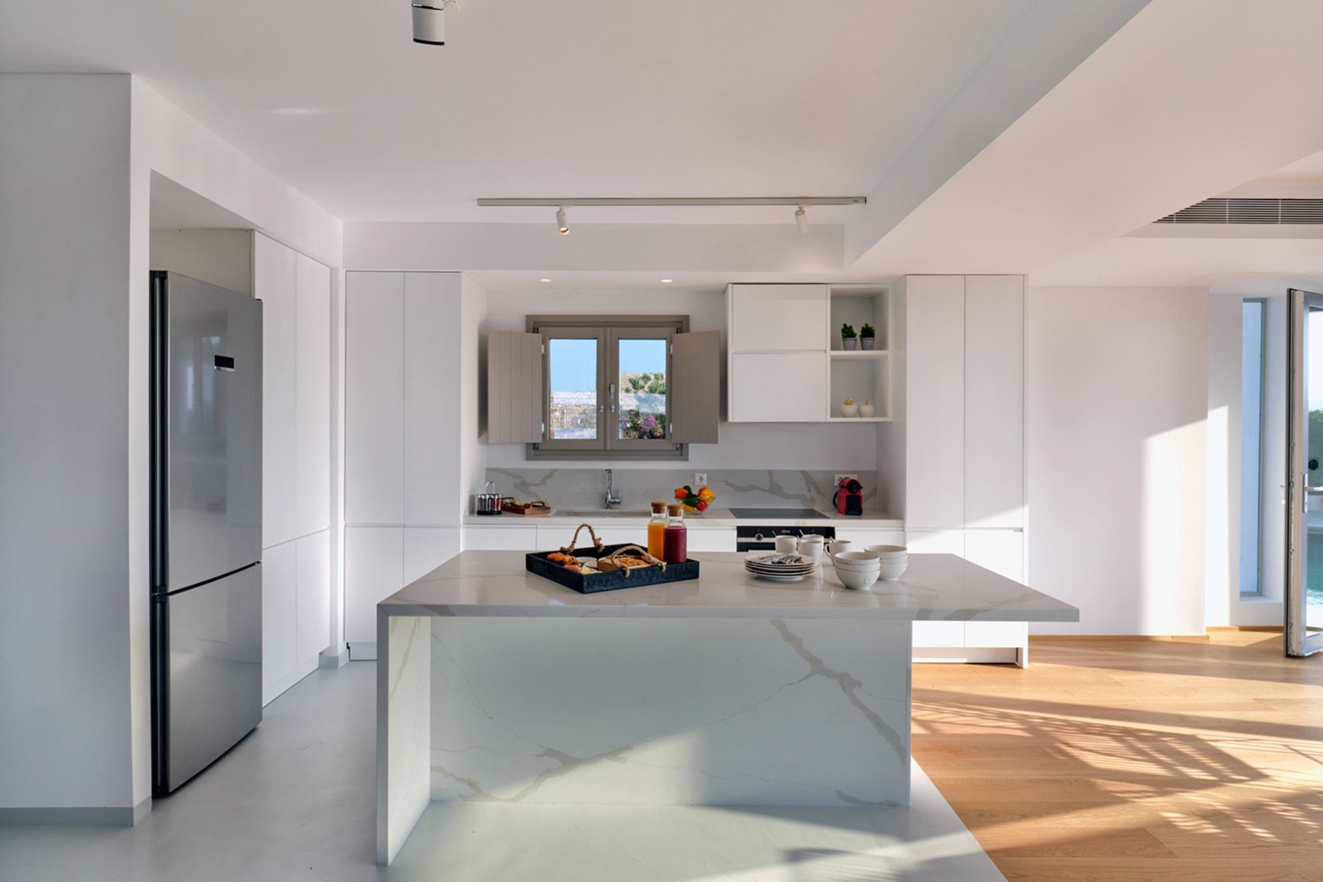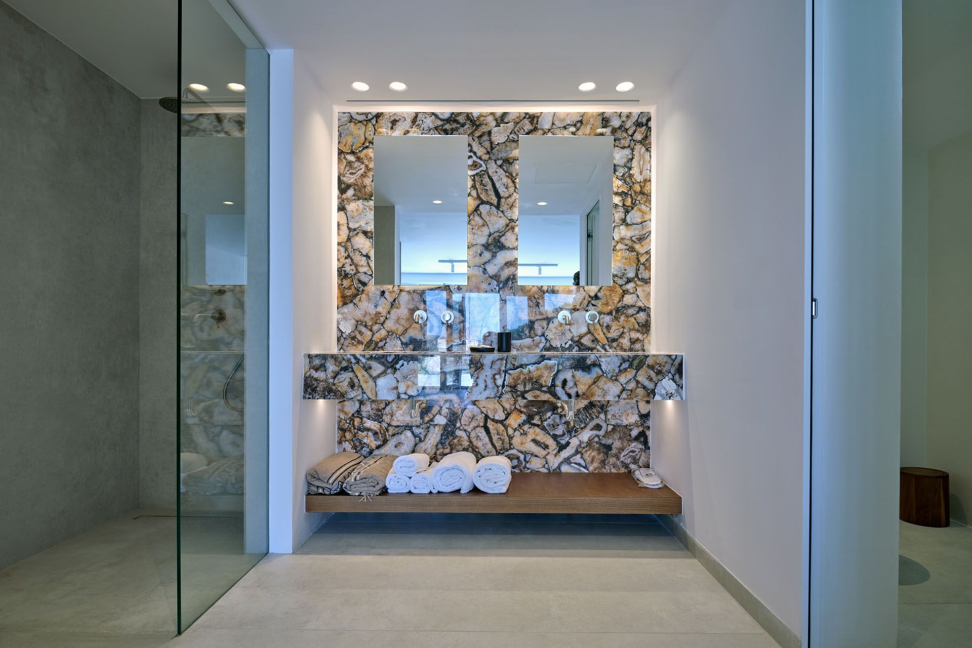 Inside, Magdalena keeps the same calm tone. The main living area, kitchen, and dining space are arranged to stay connected and full of light, with soft whites, pale woods, and a few woven details adding warmth without disturbing the villa’s simplicity. The bedrooms are distributed across several levels, which gives guests a real sense of independence, and the guest room adds another useful layer of privacy. It is a house that feels practical for a group, but still elegant enough to offer a proper luxury escape.