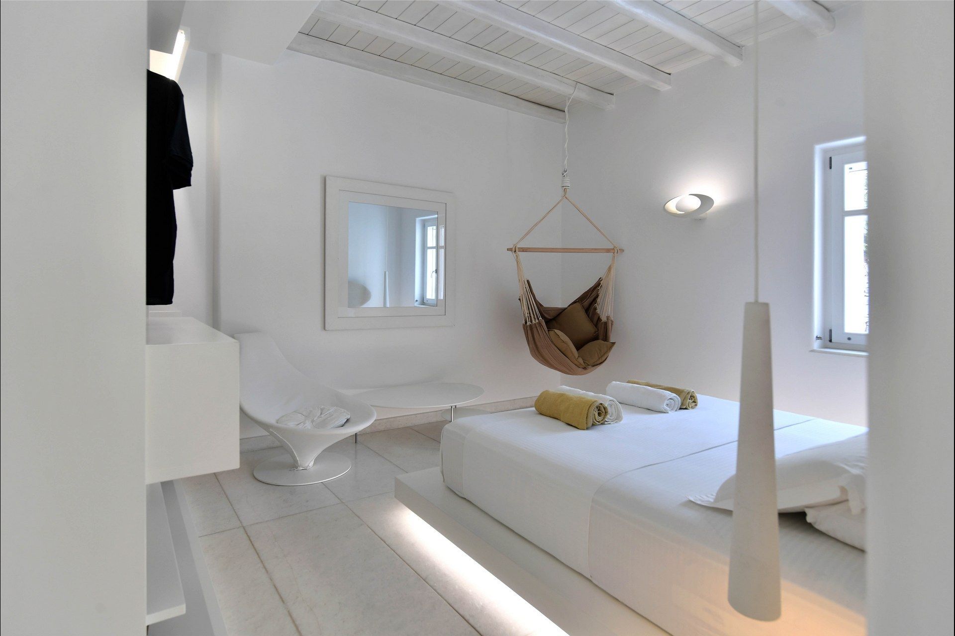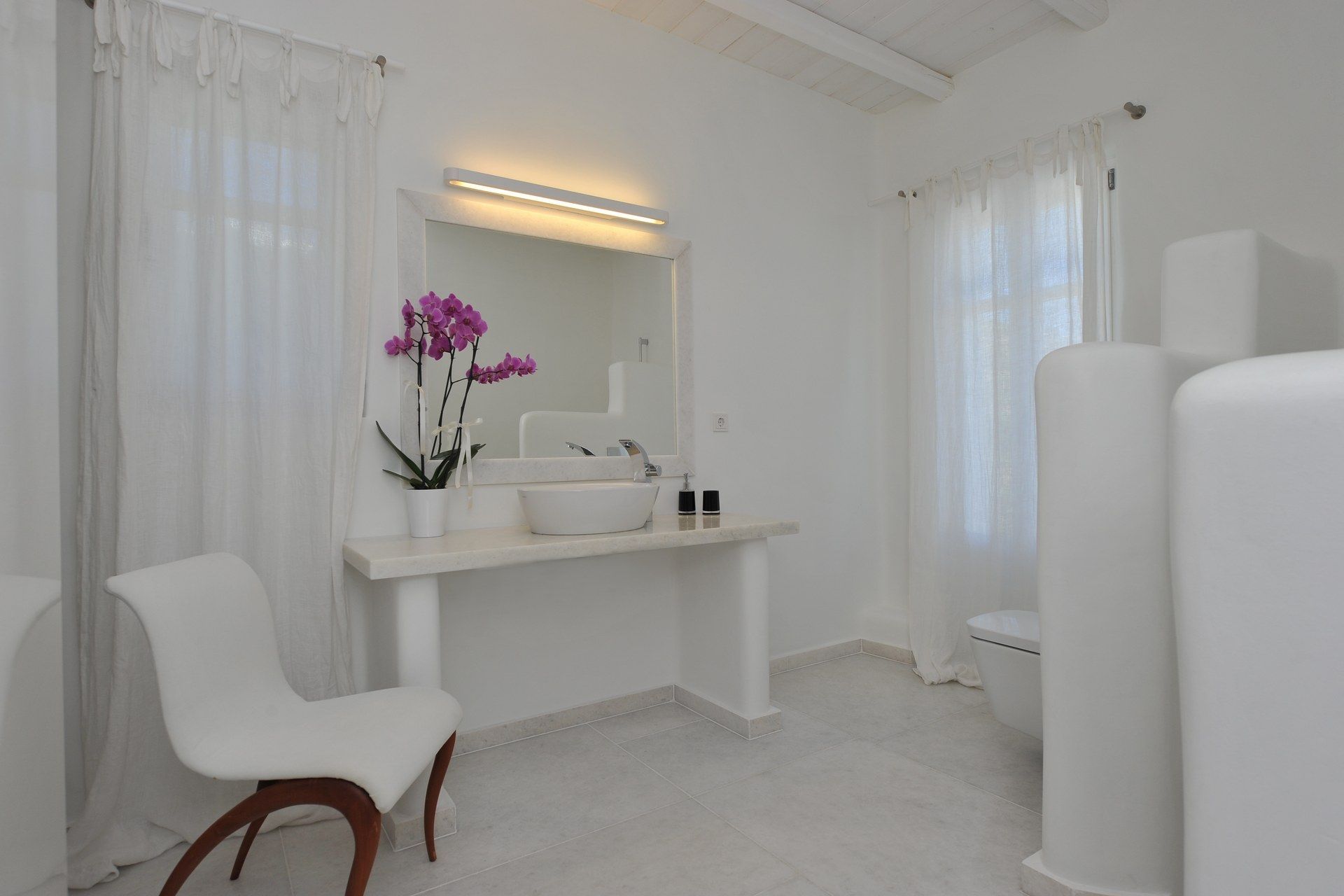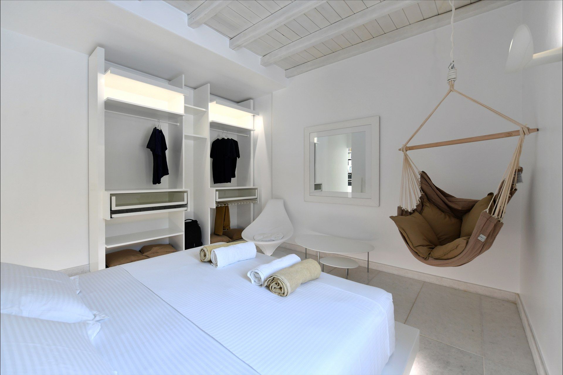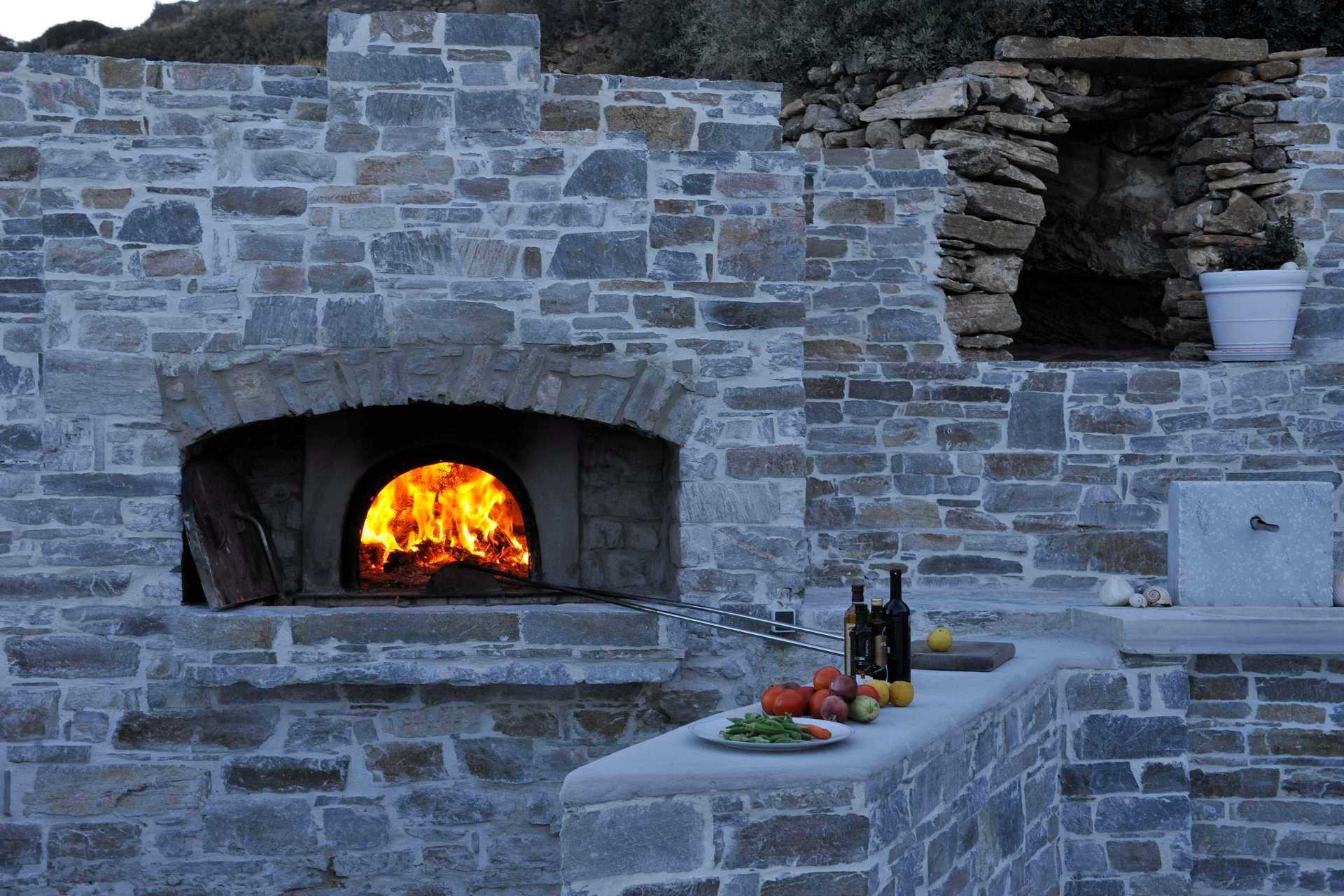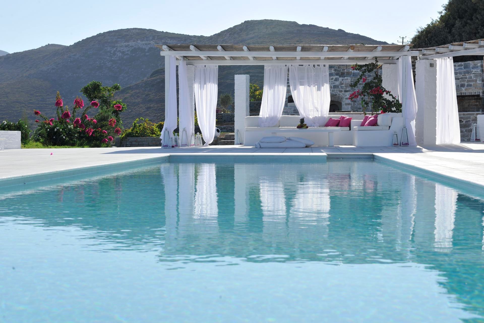 The villa is all-white, marble-accented, and plays beautifully with the island light. Private terraces open to sweeping valley and Aegean views, and the gardens blend wildflowers with aromatic herbs. When you feel energetic, nearby beaches are an easy drive, or you can stay in for a round of padel, soccer, or even a yoga session. Afterward, cool off in the pool, then gather under the shaded pergola for wood-fired-oven or BBQ dinners as the full moon casts a silver glow across the estate.