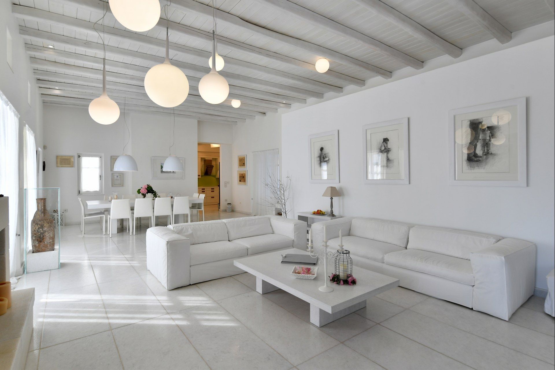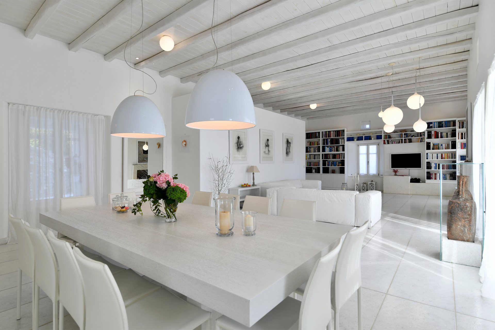 Spacious high-ceiling living area with satellite TV, sound system, large white sofas leading up to a minimalistic dining area for 12 guests, access to pool, pool and sea view