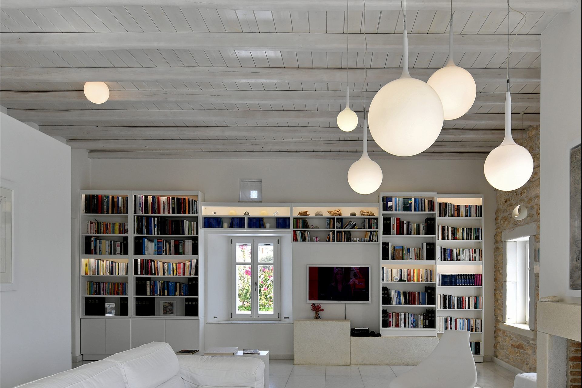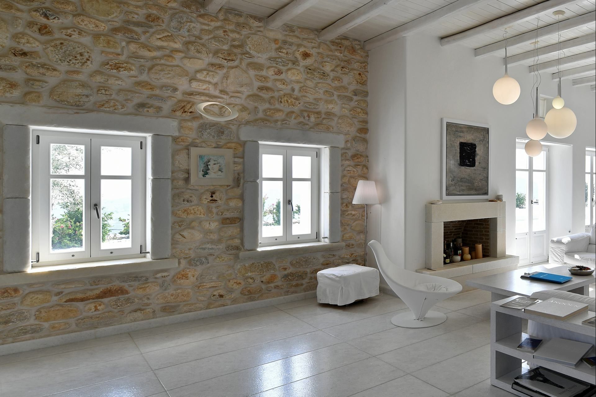 Luxury villa Mirabella was built as a family home; therefore, space and privacy come naturally. The villa is divided into the main house—sleeping 10 guests plus 2 staff members—and a stone-built guest house for 2 more. Interiors are minimal with beach-house touches, and every room enjoys underfloor cooling and comfortable beds. The living room features satellite TV and an open layout that flows to the 12-seat dining area; in case you feel like spending the night in.