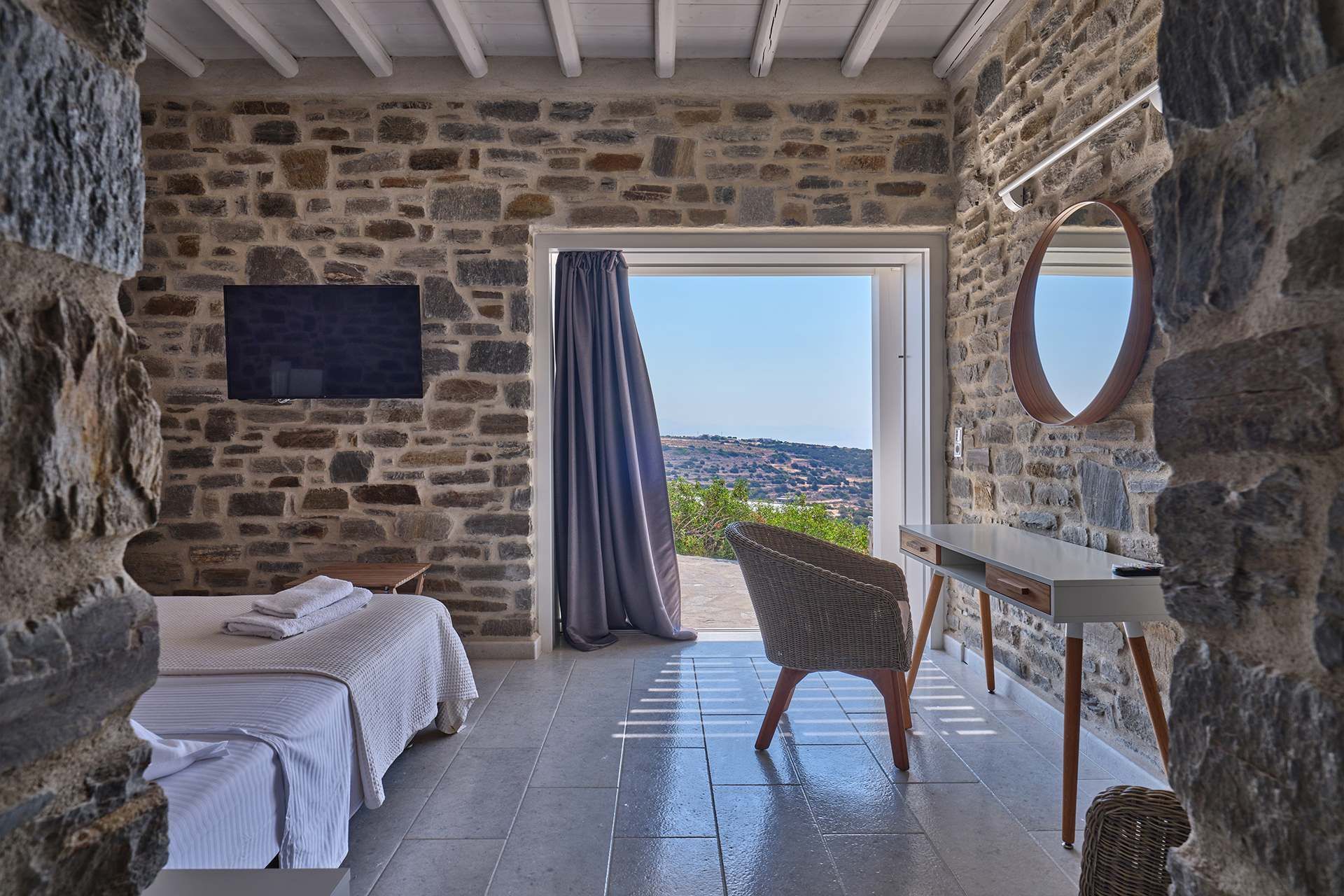 1 bedroom with double bed, A/C, en-suite bathroom with shower, hairdryer, Wi-Fi, access to balcony, Aegean Sea view