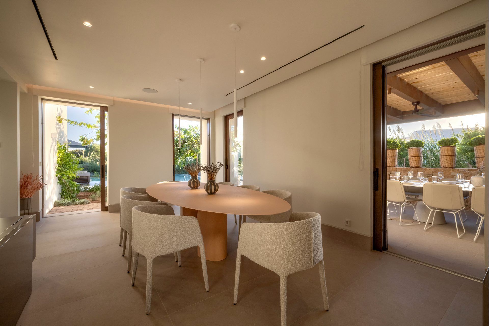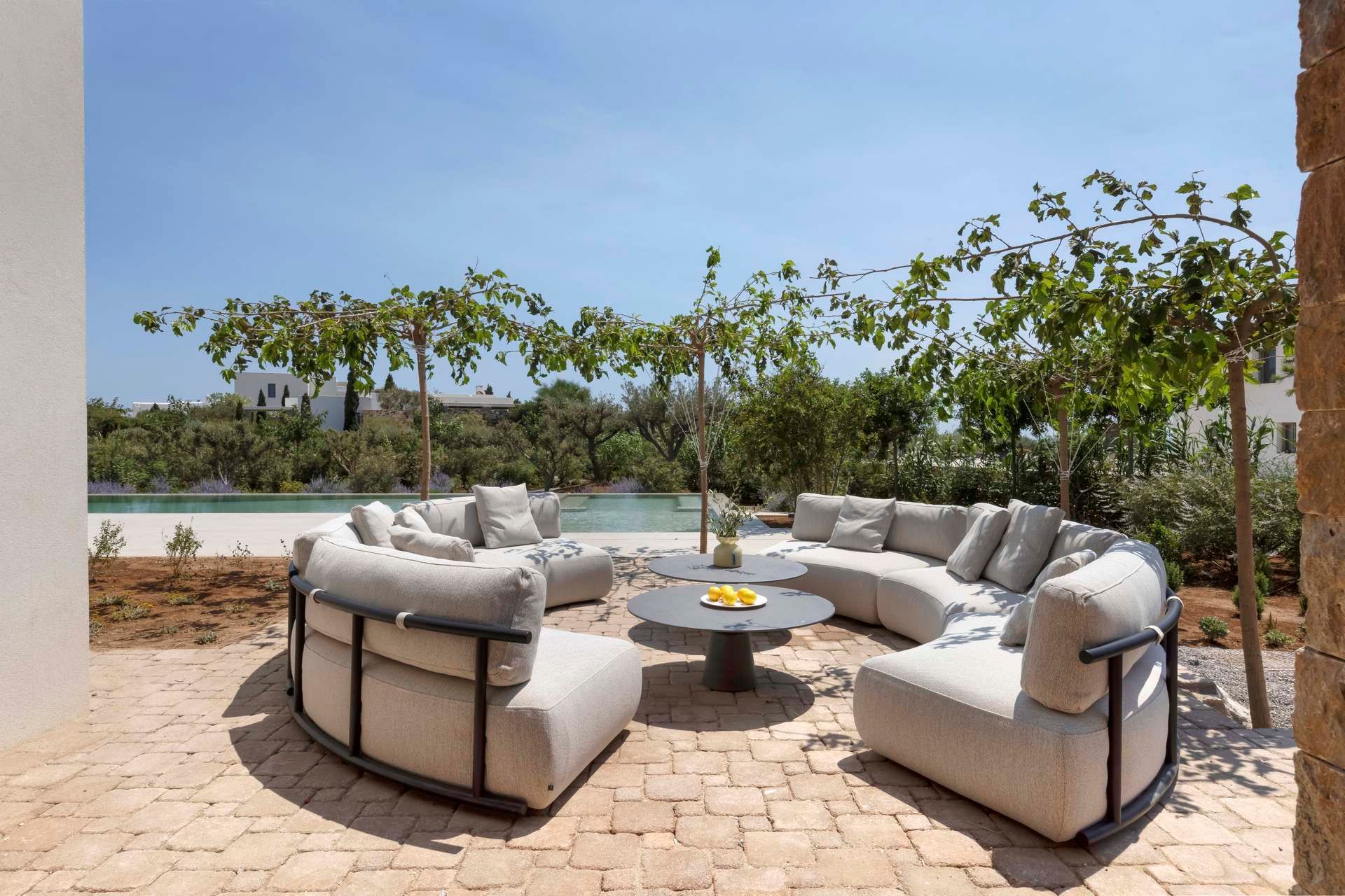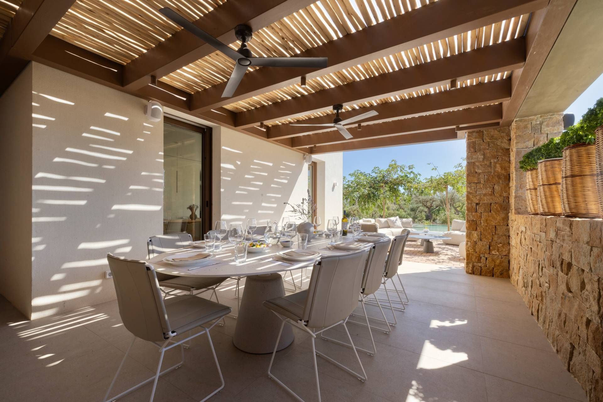 Terraces step toward the natural landscape with four infinity pools placed for light and breeze, including one with jacuzzi jets for late-hour rituals. Dining corners tuck beneath pergolas, umbrellas draw islands of shade, and a roof garden turns the evening into a quiet event. You feel the island most in the small things: a barbecue after a swim, the sound system playing low at lunch, the short barefoot walk to the shore when the water starts calling.