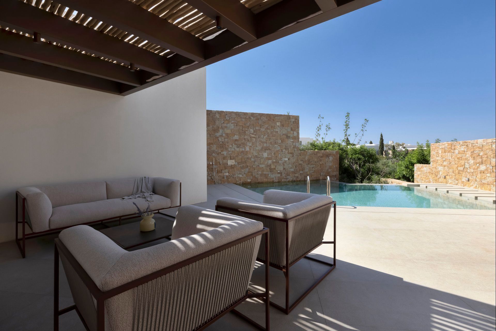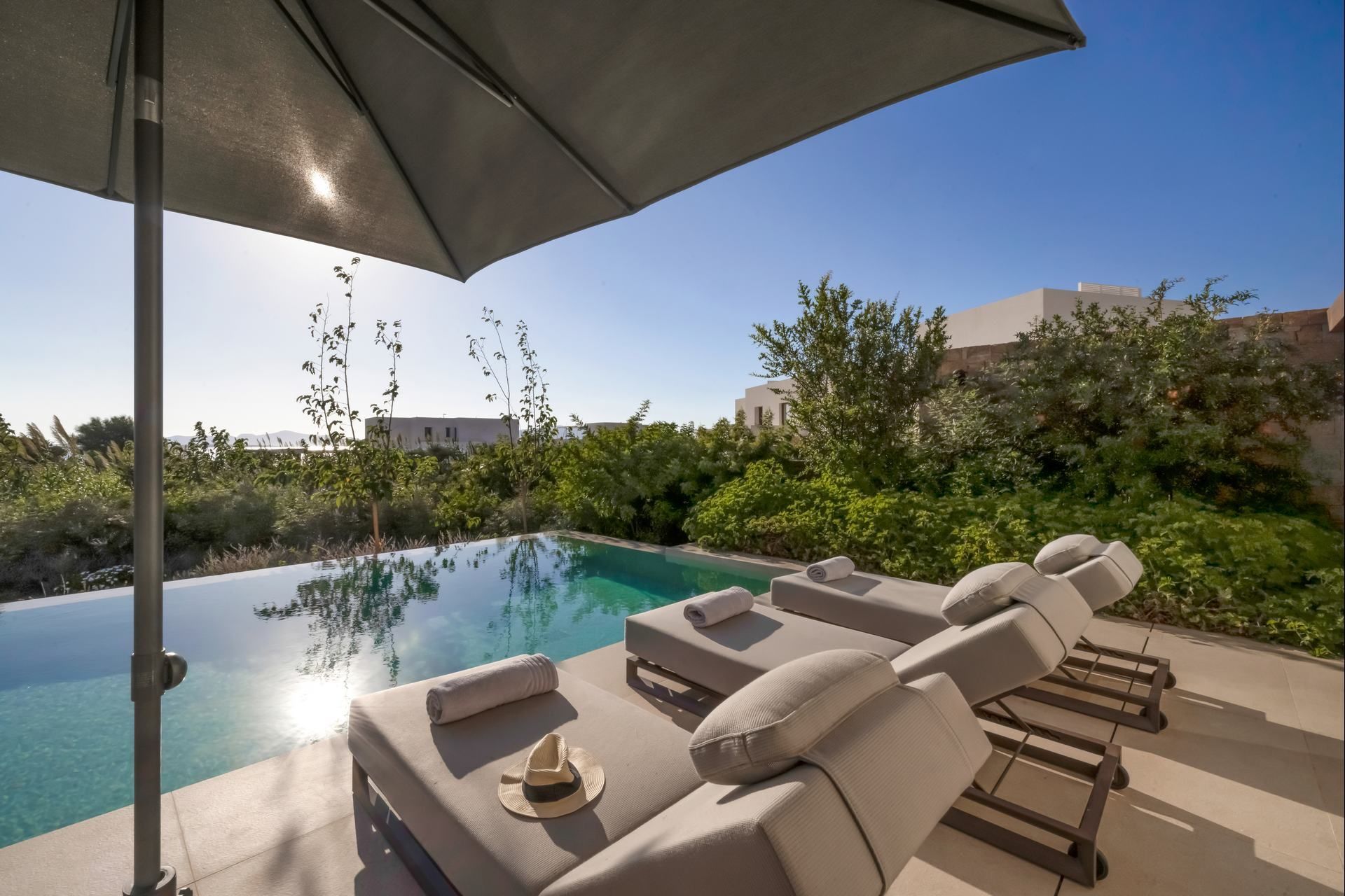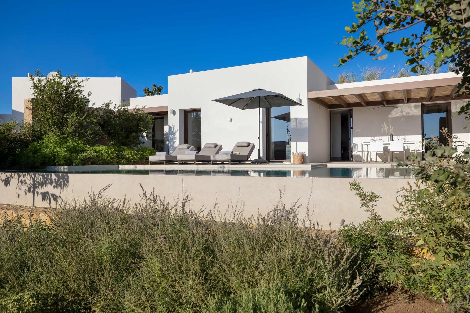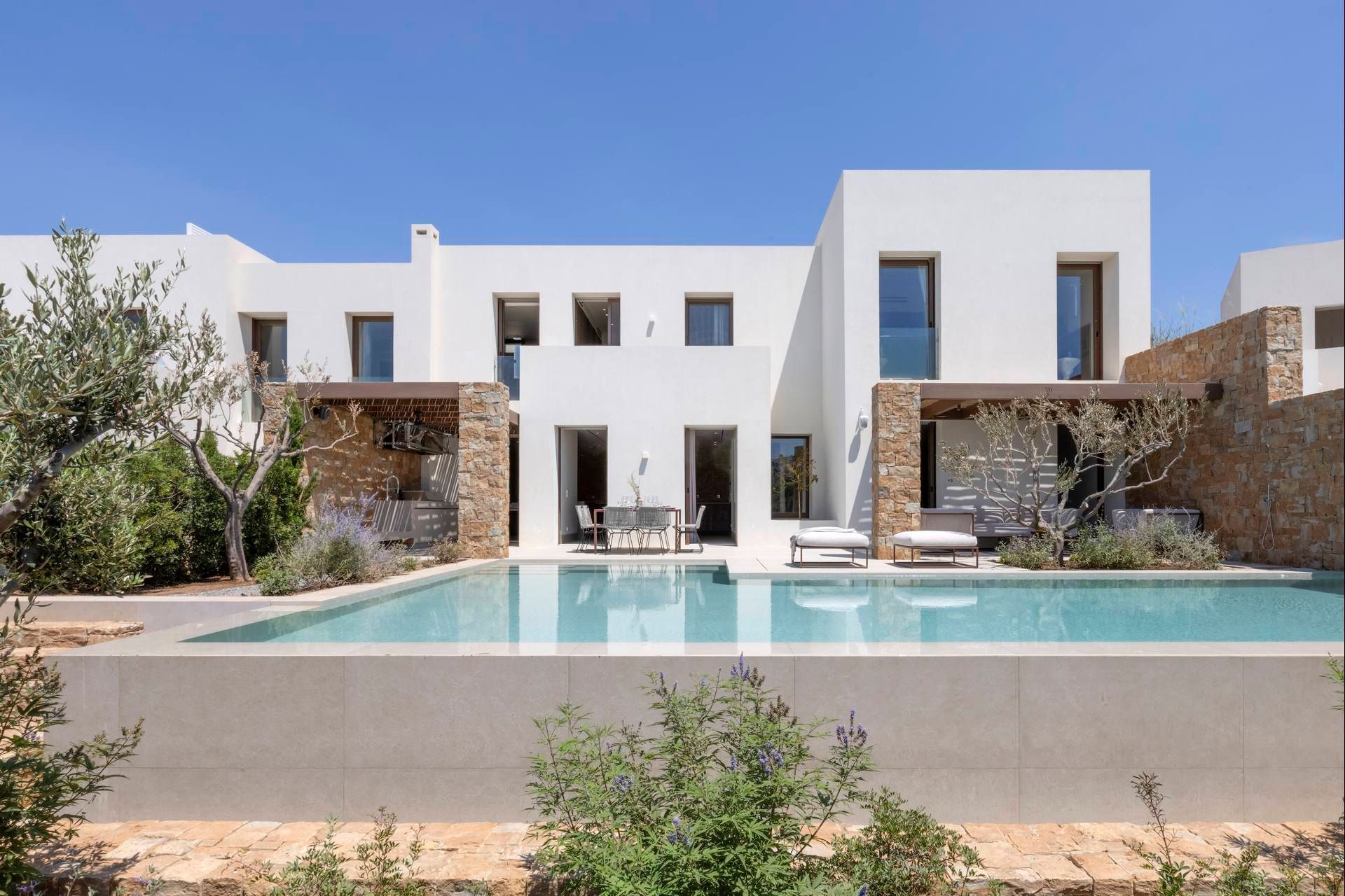 Inside, the villas echo each other in design and ease. Kitchens are fully equipped and sized for groups, living areas open wide to the pool terraces, and dining rooms stretch to keep conversation moving. A few upper suites come with private balconies and bathtubs, while the rest keep a clean, restful finish with comfy double beds and ensuite bathrooms. The design is Cycladic-simple and contemporary—linen, timber, stone—built to breathe and last.