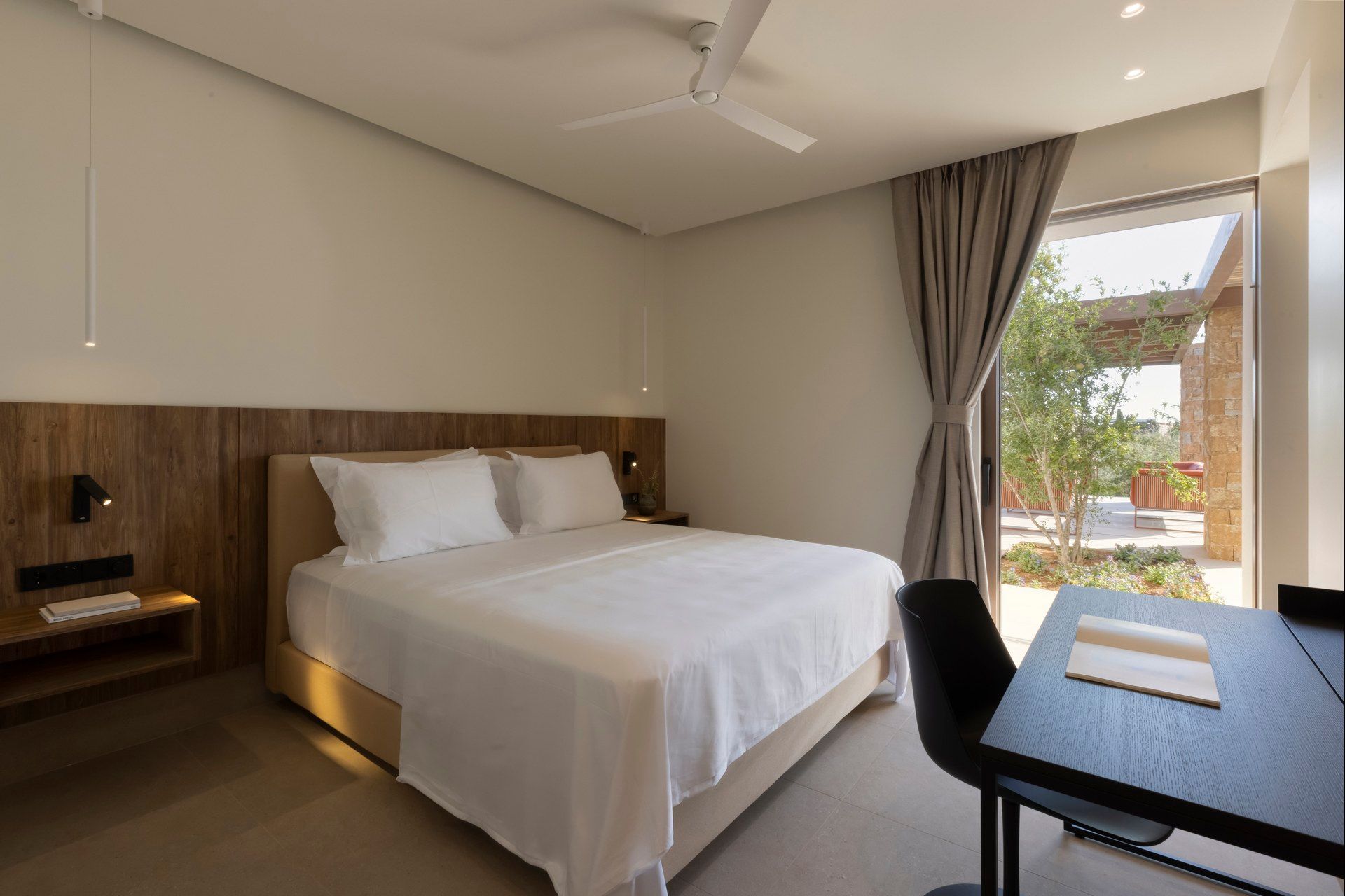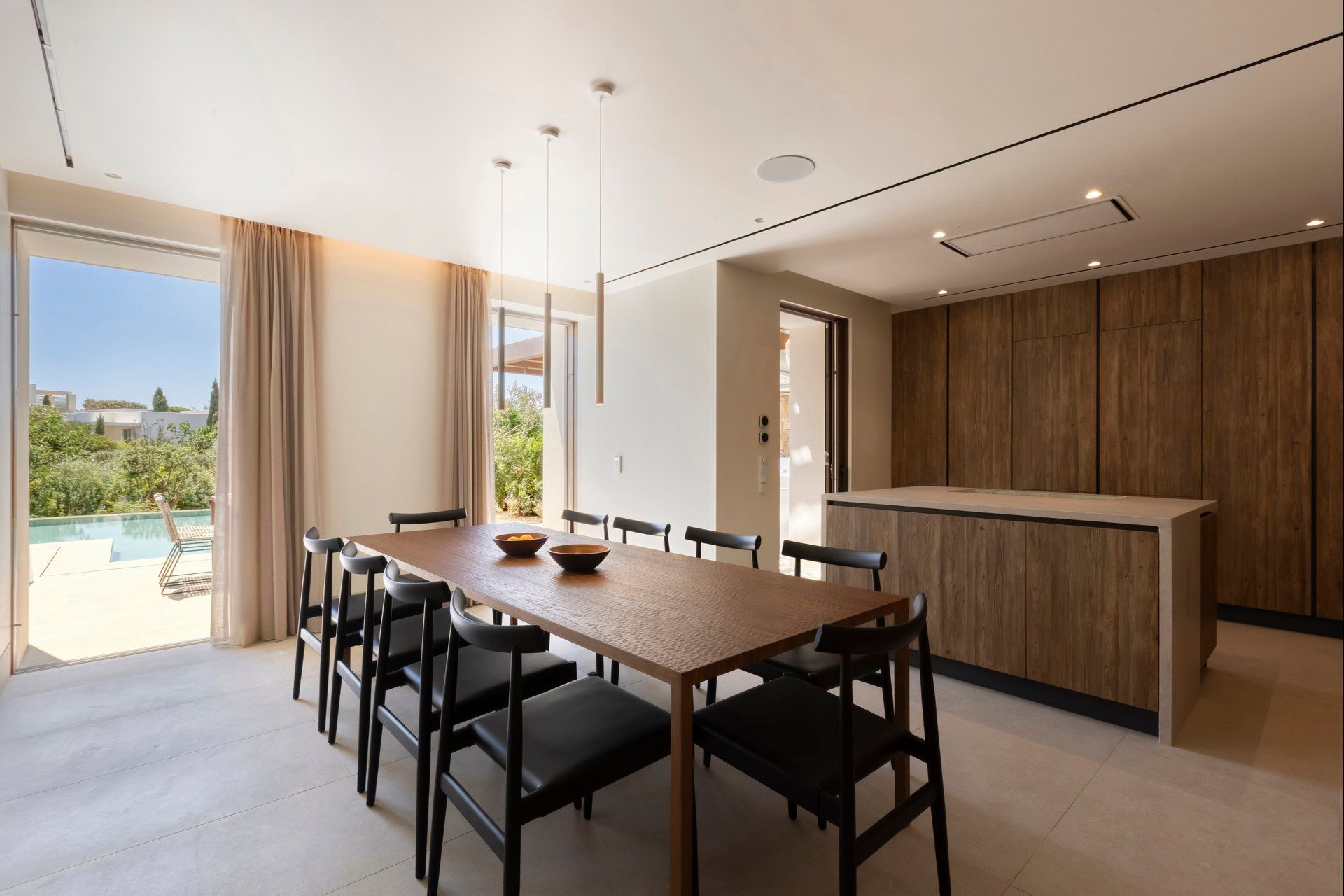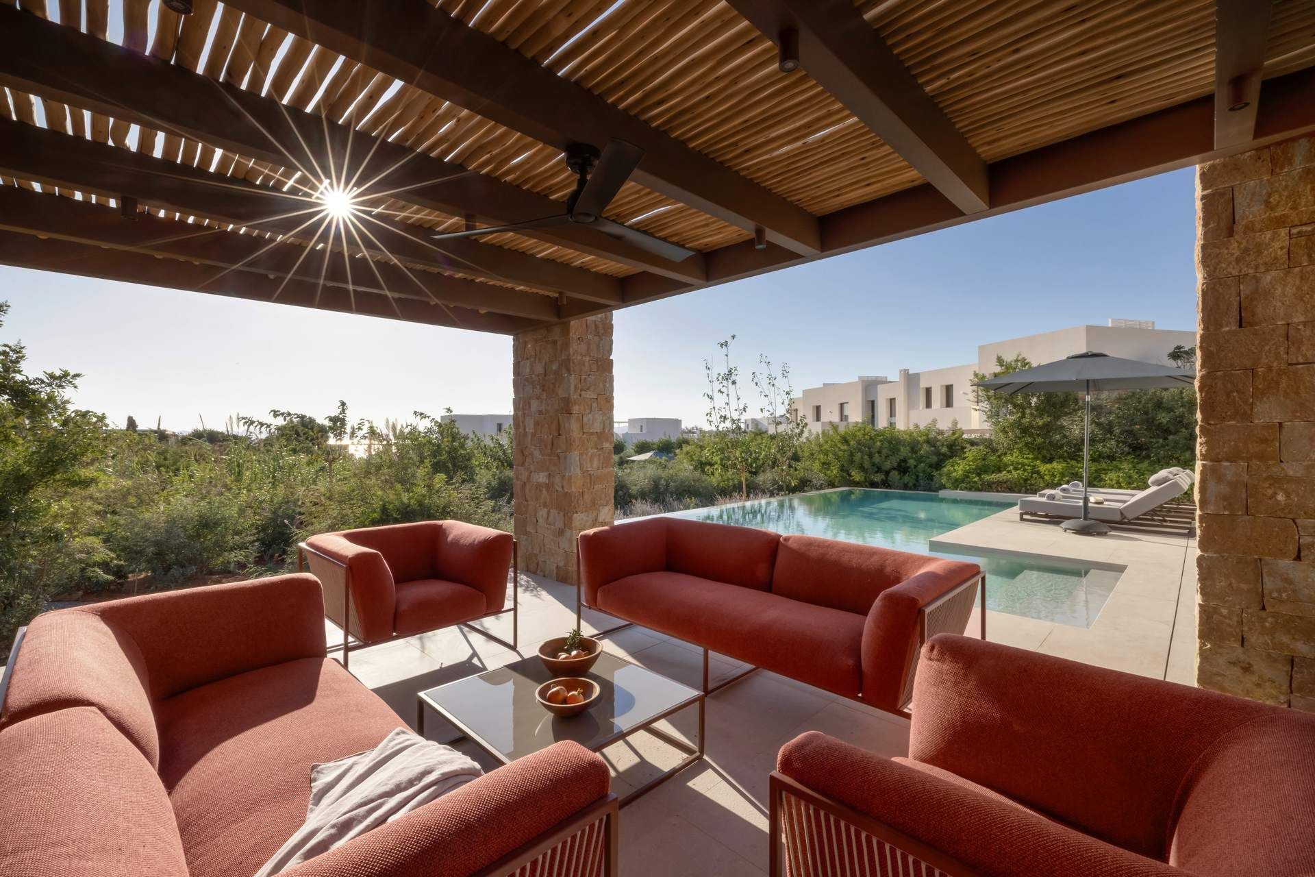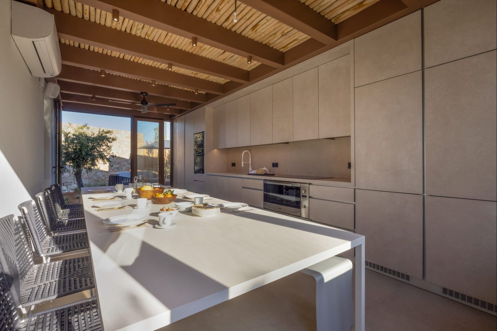 Inside, the villas echo each other in design and ease. Kitchens are fully equipped and sized for groups, living areas open wide to the pool terraces, and dining rooms stretch to keep conversation moving. A few upper suites come with private balconies and bathtubs, while the rest keep a clean, restful finish with comfy double beds and ensuite bathrooms. The design is Cycladic-simple and contemporary—linen, timber, stone—built to breathe and last.