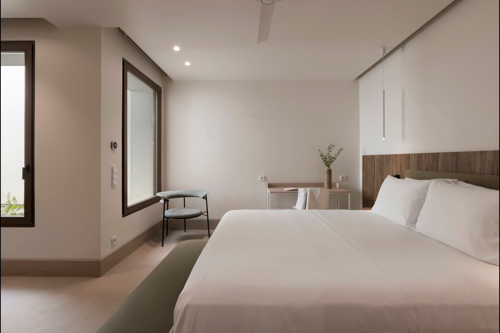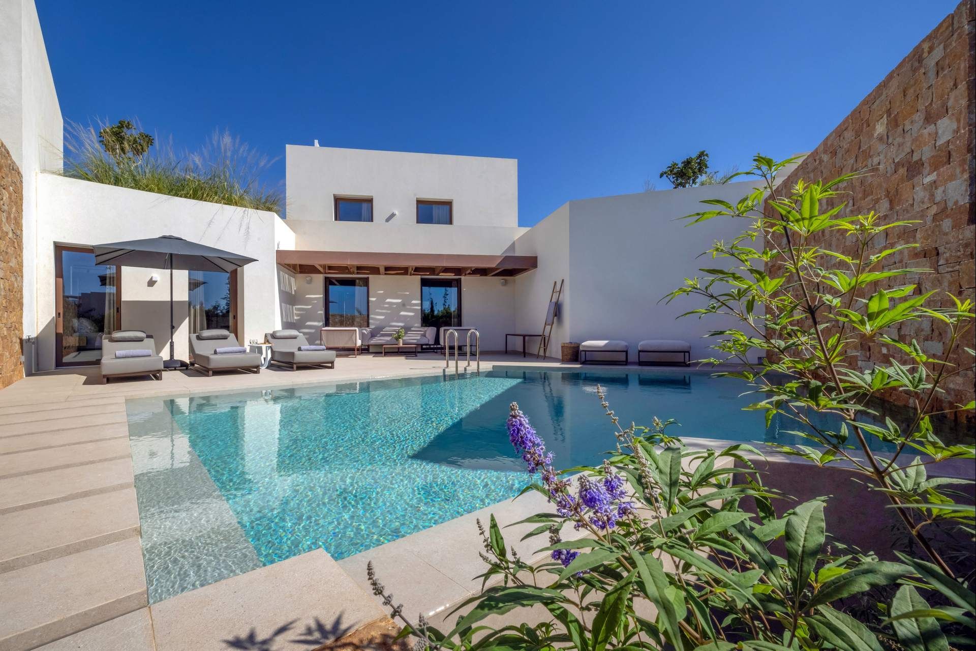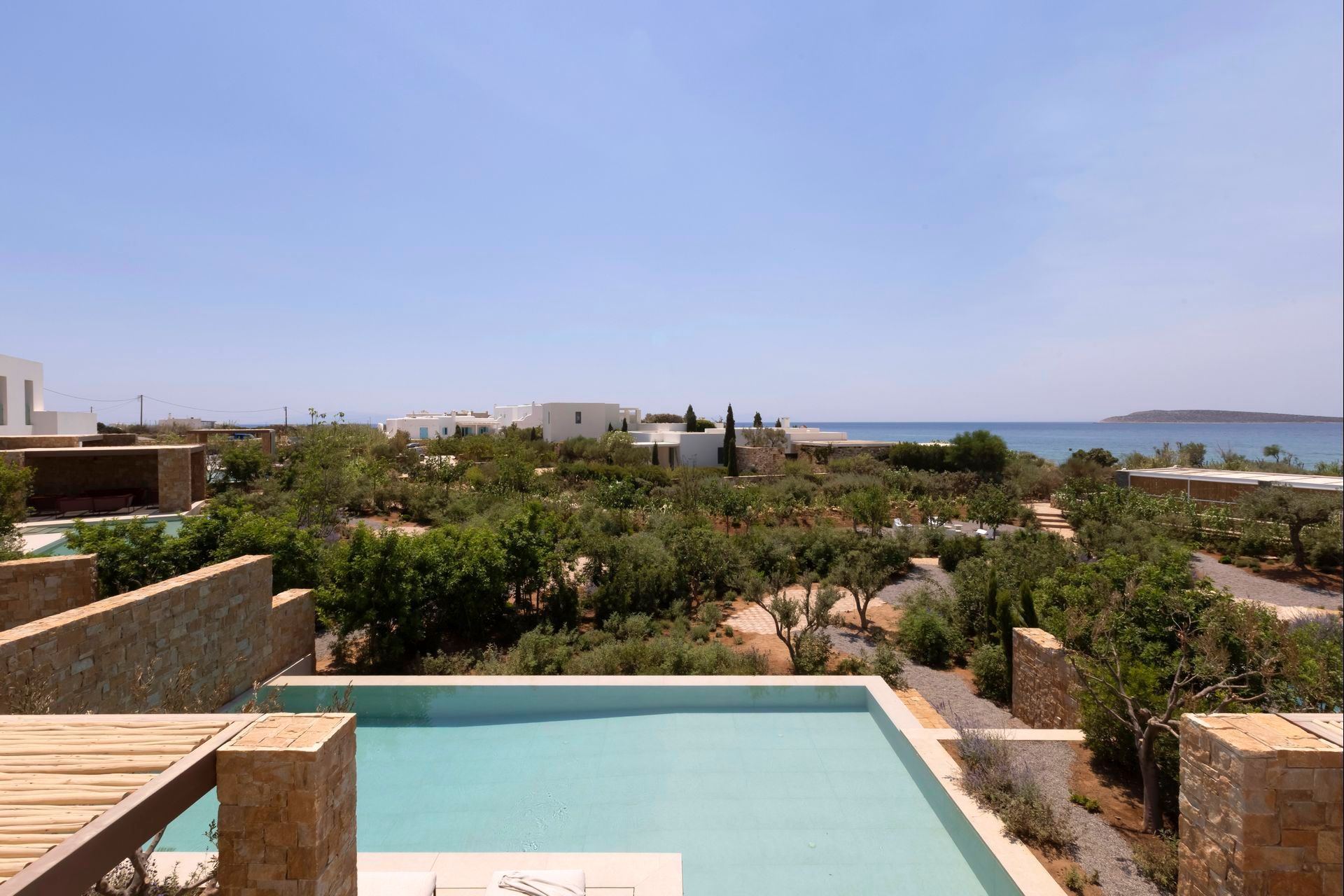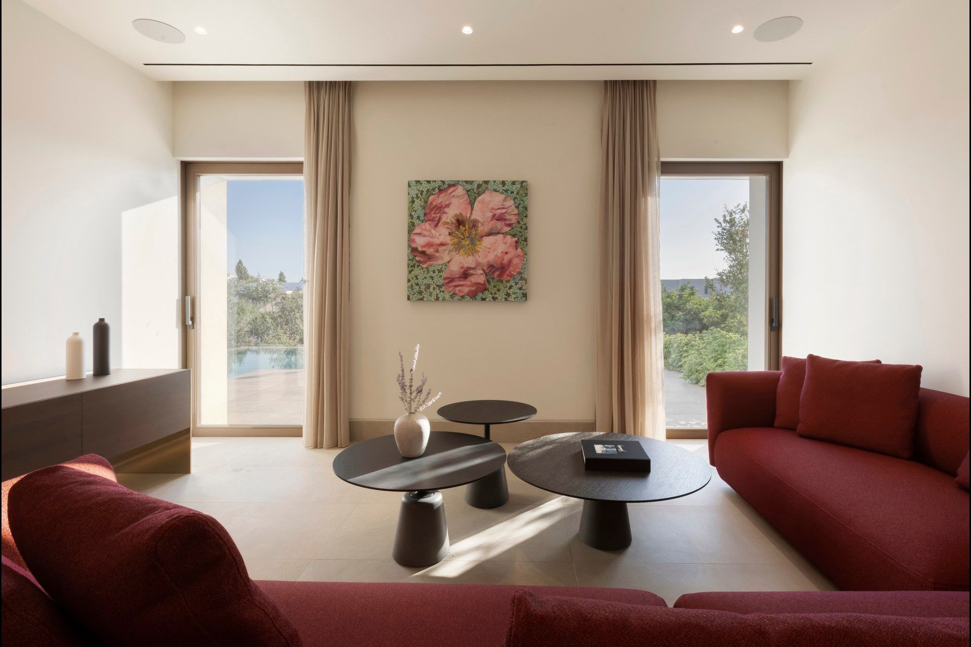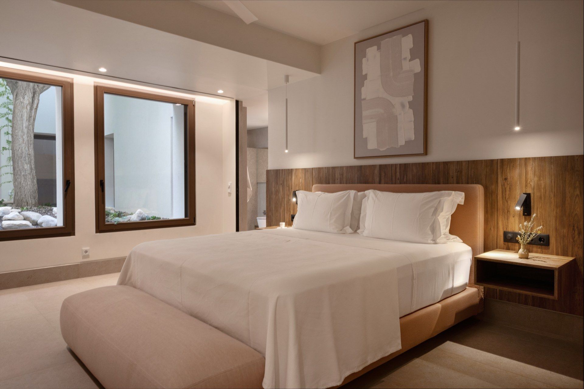 Inside, the villas echo each other in design and ease. Kitchens are fully equipped and sized for groups, living areas open wide to the pool terraces, and dining rooms stretch to keep conversation moving. A few upper suites come with private balconies and bathtubs, while the rest keep a clean, restful finish with comfy double beds and ensuite bathrooms. The design is Cycladic-simple and contemporary—linen, timber, stone—built to breathe and last.