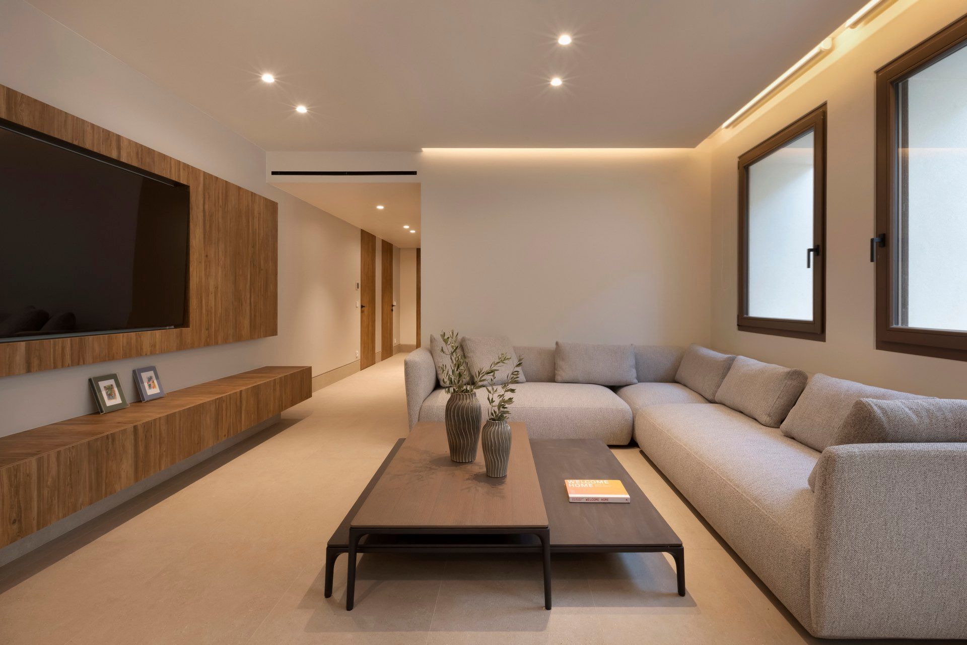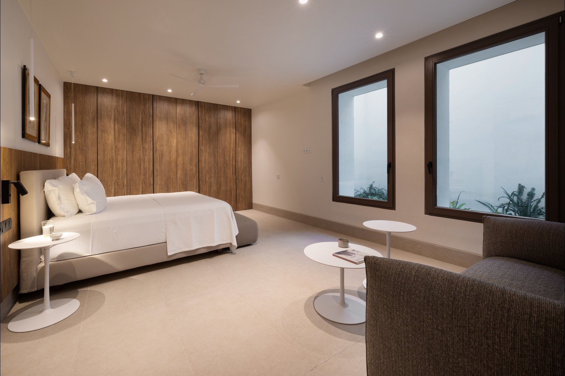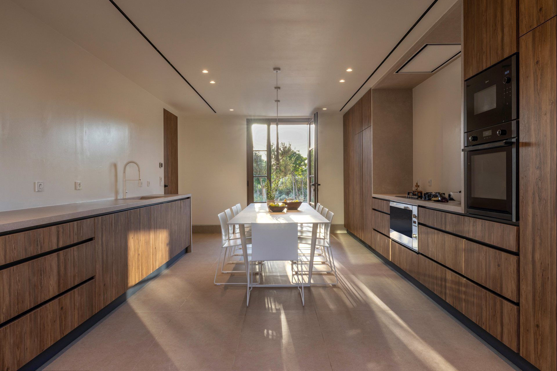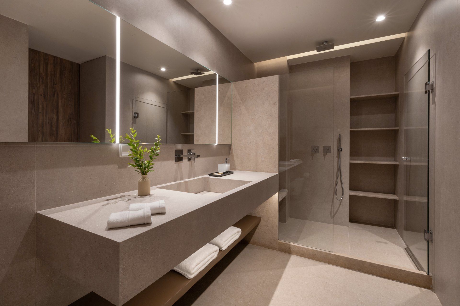 Inside, the villas echo each other in design and ease. Kitchens are fully equipped and sized for groups, living areas open wide to the pool terraces, and dining rooms stretch to keep conversation moving. A few upper suites come with private balconies and bathtubs, while the rest keep a clean, restful finish with comfy double beds and ensuite bathrooms. The design is Cycladic-simple and contemporary—linen, timber, stone—built to breathe and last.