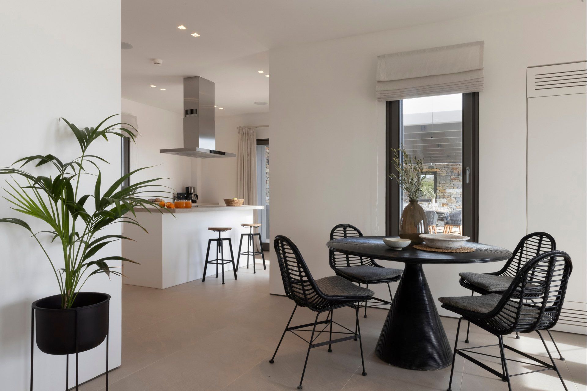 Odelia is built around the idea that a large group stay should still leave room for privacy, quiet, and personal rhythm. Set near Santa Maria in Paros, it accommodates up to thirty-four guests across three villas and a guesthouse, but what makes it memorable is not simply the number of rooms. Sea-view masters, sleeping zones, staff rooms, playrooms, and multiple shared spaces are arranged so that the estate can adapt naturally to any group. Architecturally, it stays close to the Cycladic landscape through whitewashed walls, stone surfaces, and a direct relationship with the terraces and the coast beyond.