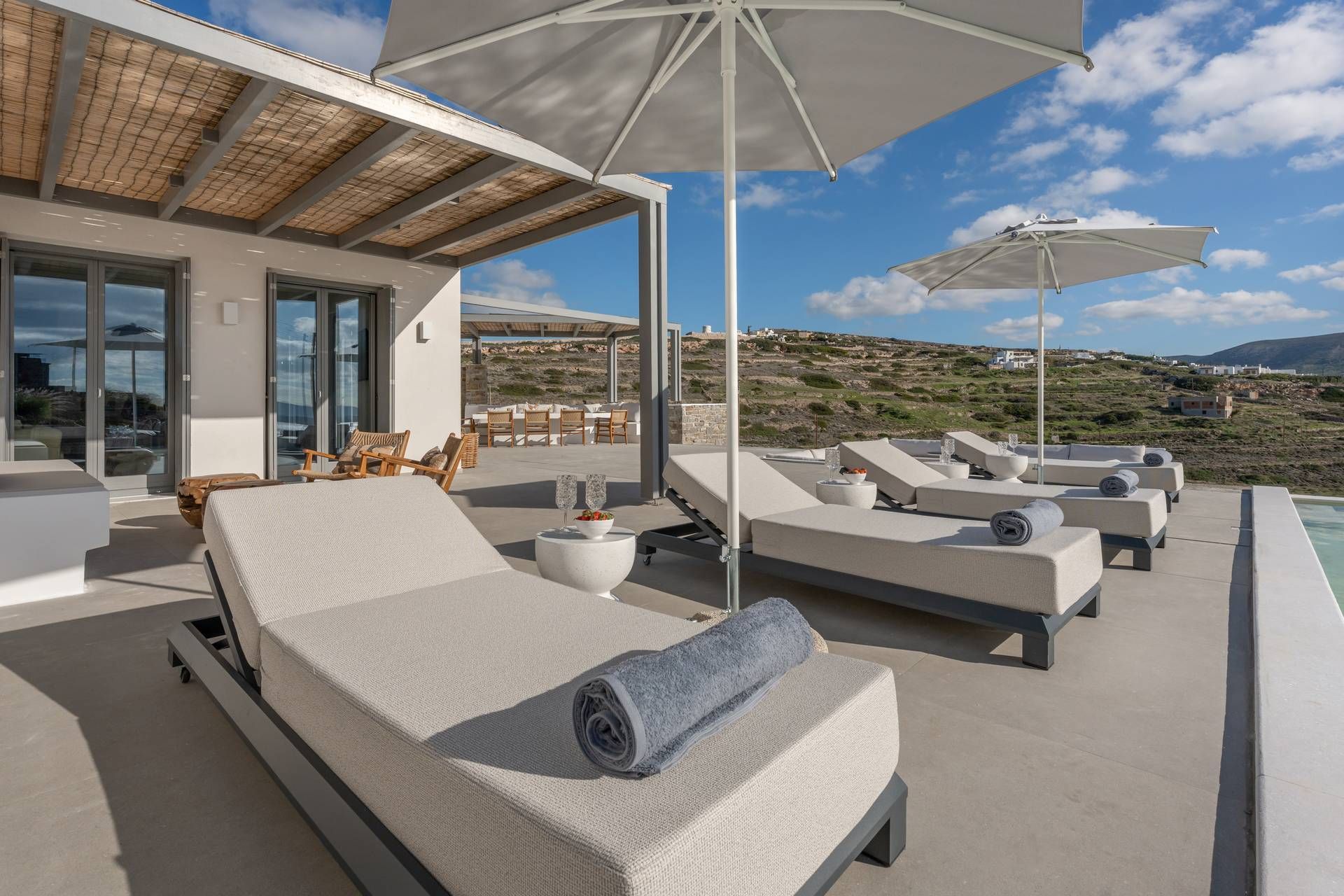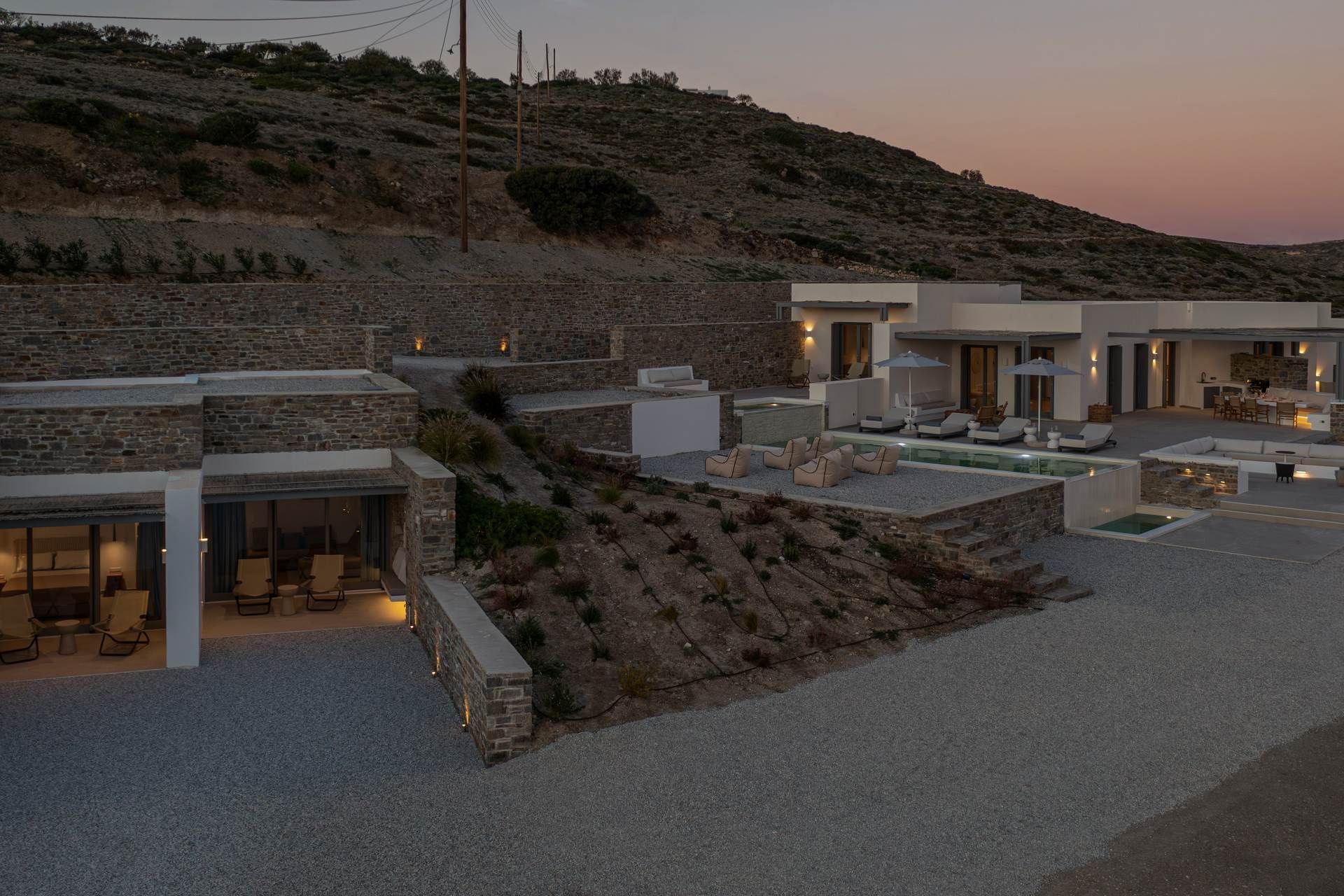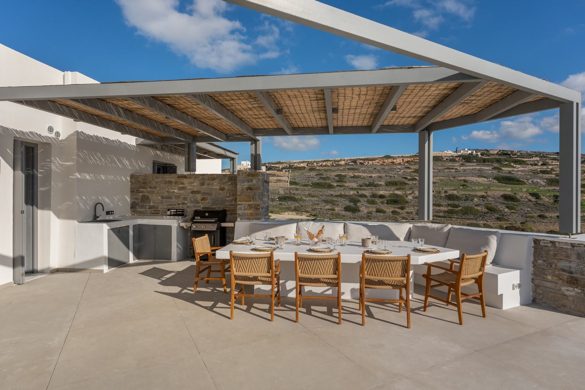 Parikia is only a short drive away, which means the port, shops, and everyday essentials all remain close at hand, while Krios Beach is easy to reach for swimming and relaxed lunches by the sea. The location also makes it simple to head north toward Kolympethres or Naousa without turning the outing into a full journey, so the villa works beautifully as a base for exploring different sides of the island. It is a setting that keeps daily logistics light while still preserving a sense of retreat.