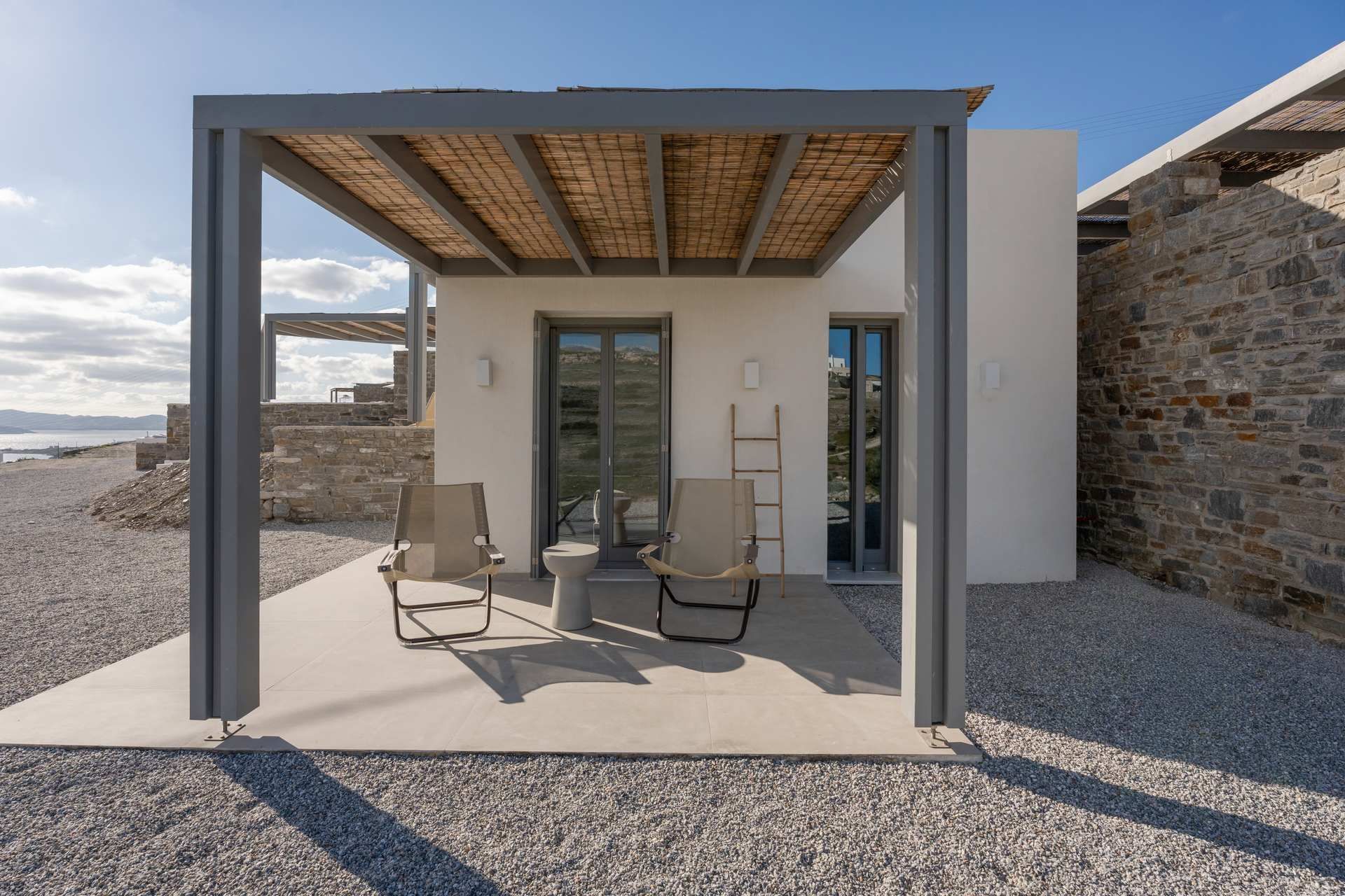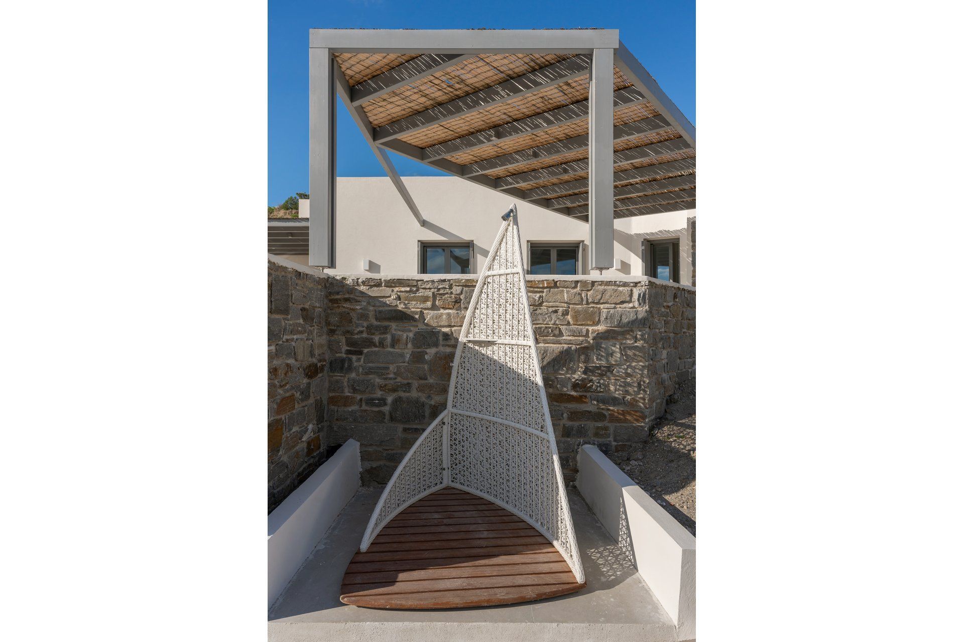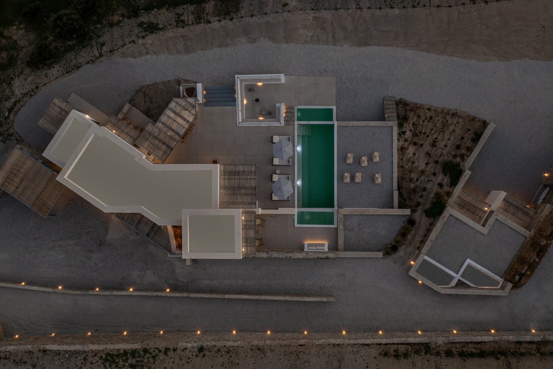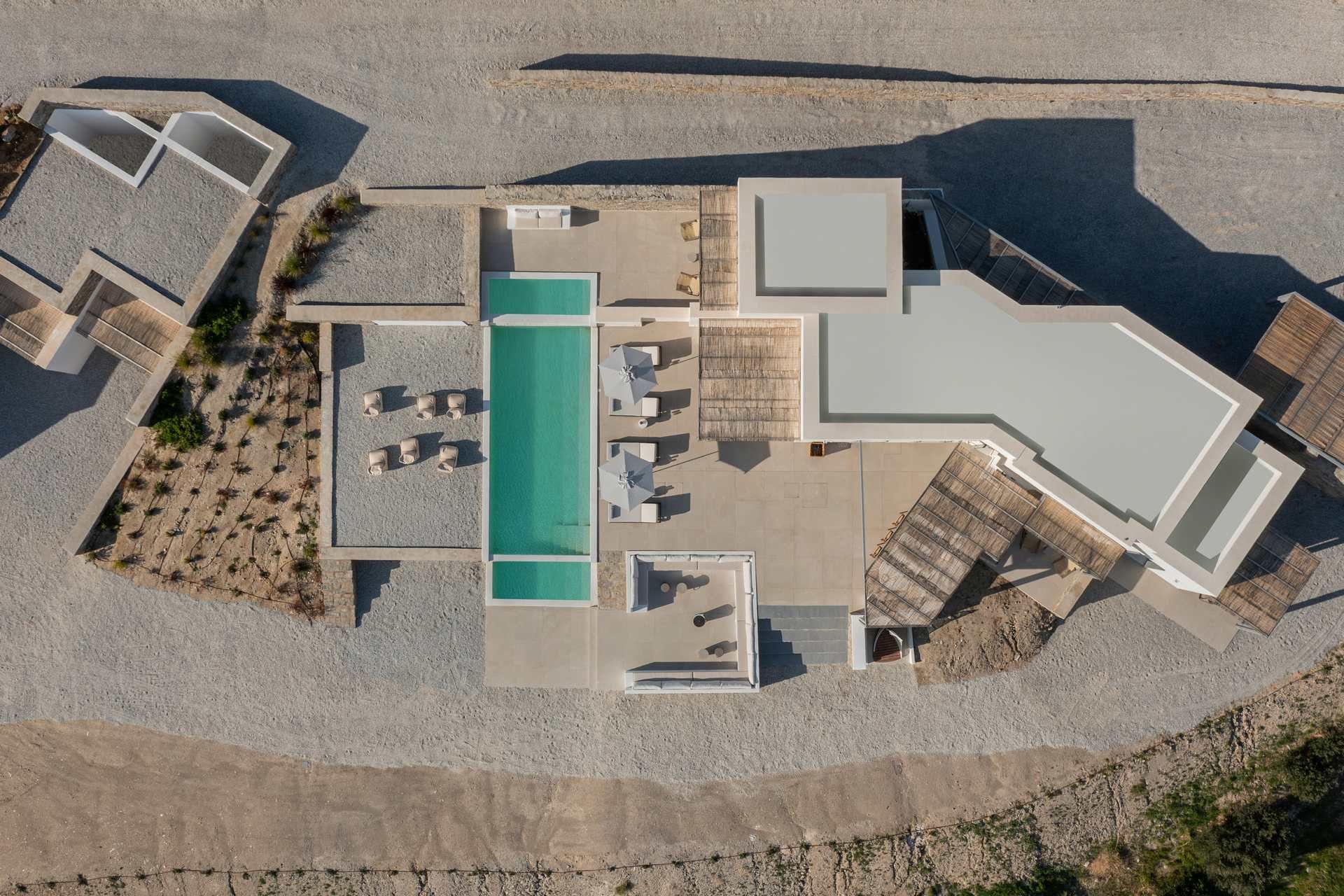 Villa Saltrose sits a short drive from Parikia, in a landscape that keeps it closely tied to Paros' character, even as the architecture remains minimal and contemporary. Designed for up to ten guests, it combines clean-lined interiors with a more layered spatial layout, including a guesthouse that can adapt easily to the rhythm of each stay. What gives the property its particular character is the way it balances shared living and personal space through levels, verandas, and outdoor corners, while the sea remains present in the background.