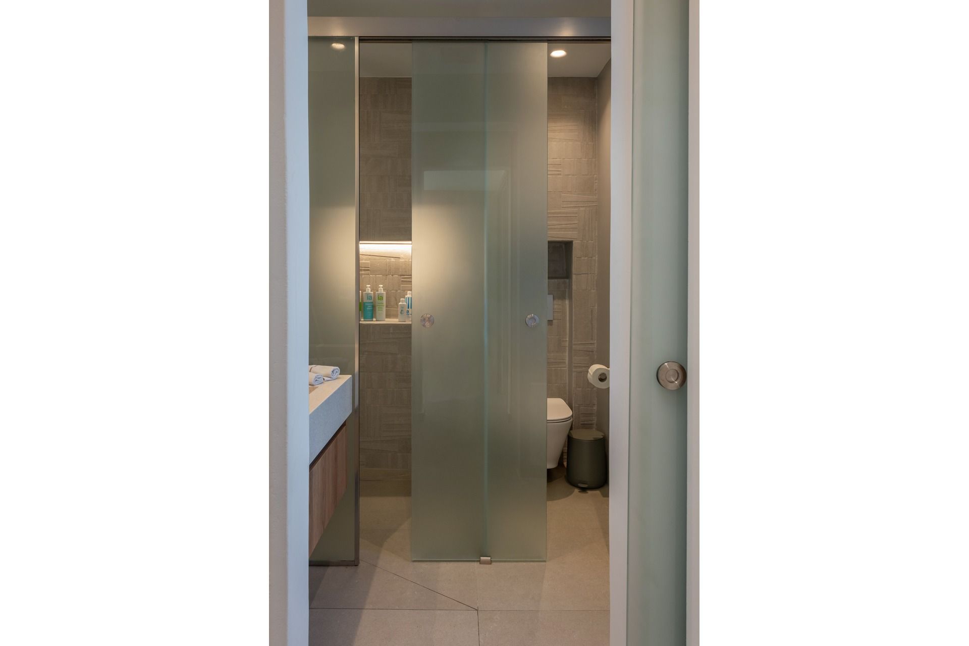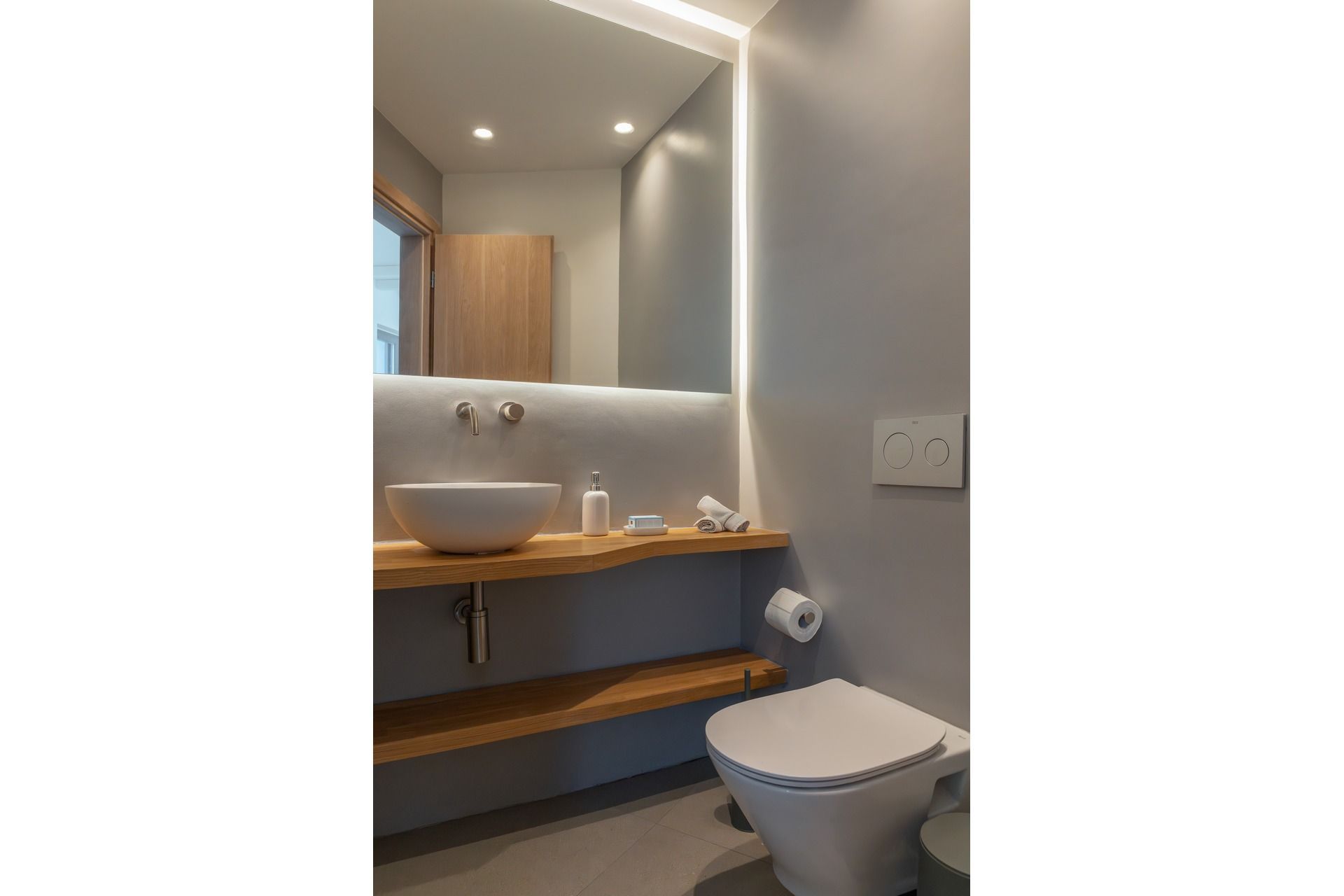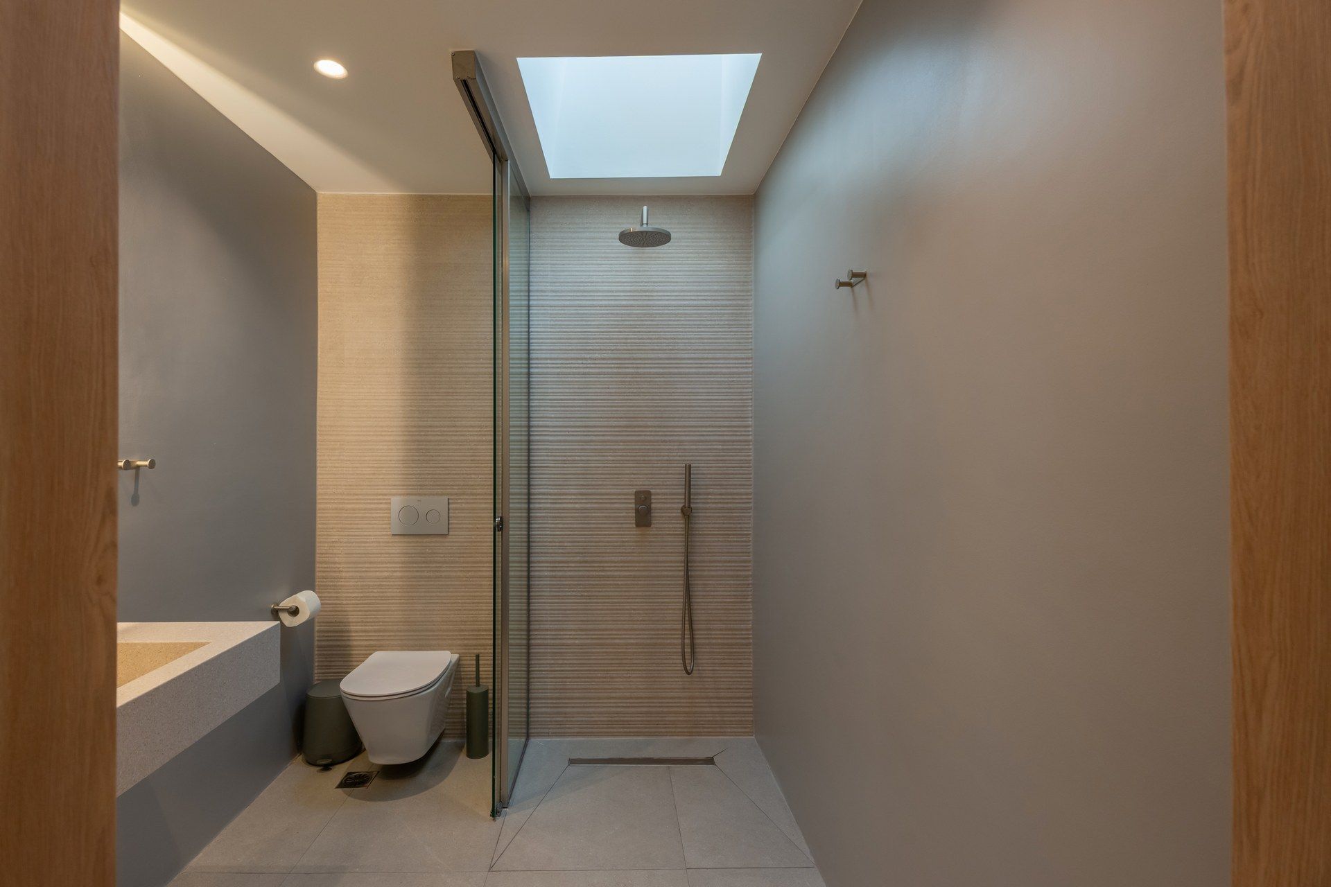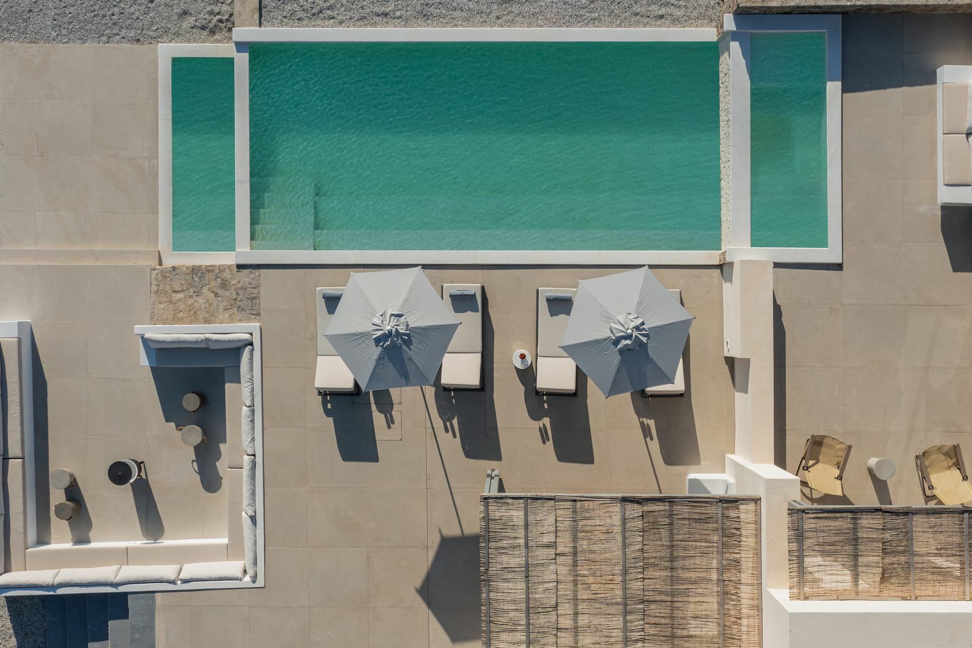 The terrace is arranged in distinct zones that follow the natural slope of the land, giving each moment of the day its own setting. The infinity pool stretches toward the view, while around it, sunbeds, shaded dining, and built-in lounge areas complete the scene. The pool bar, BBQ, and open-air cinema bring a more social dimension as the day turns into evening. Everything is designed to let you move easily between quiet and shared time without ever leaving the view behind.