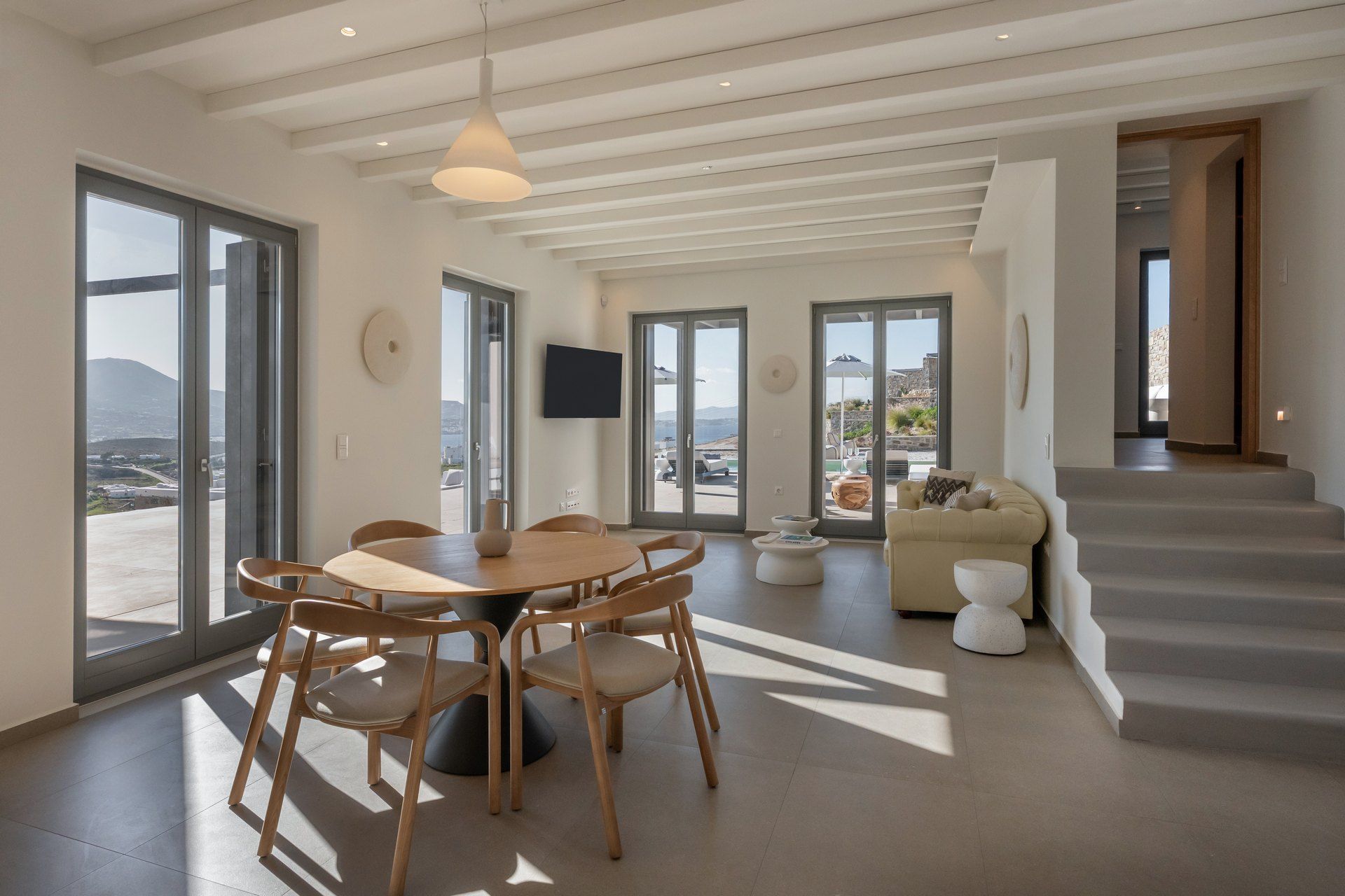 Open-plan living area with TV, access to pool terrace, sea view