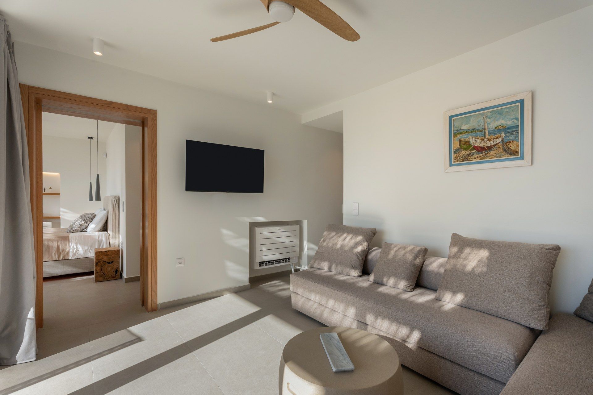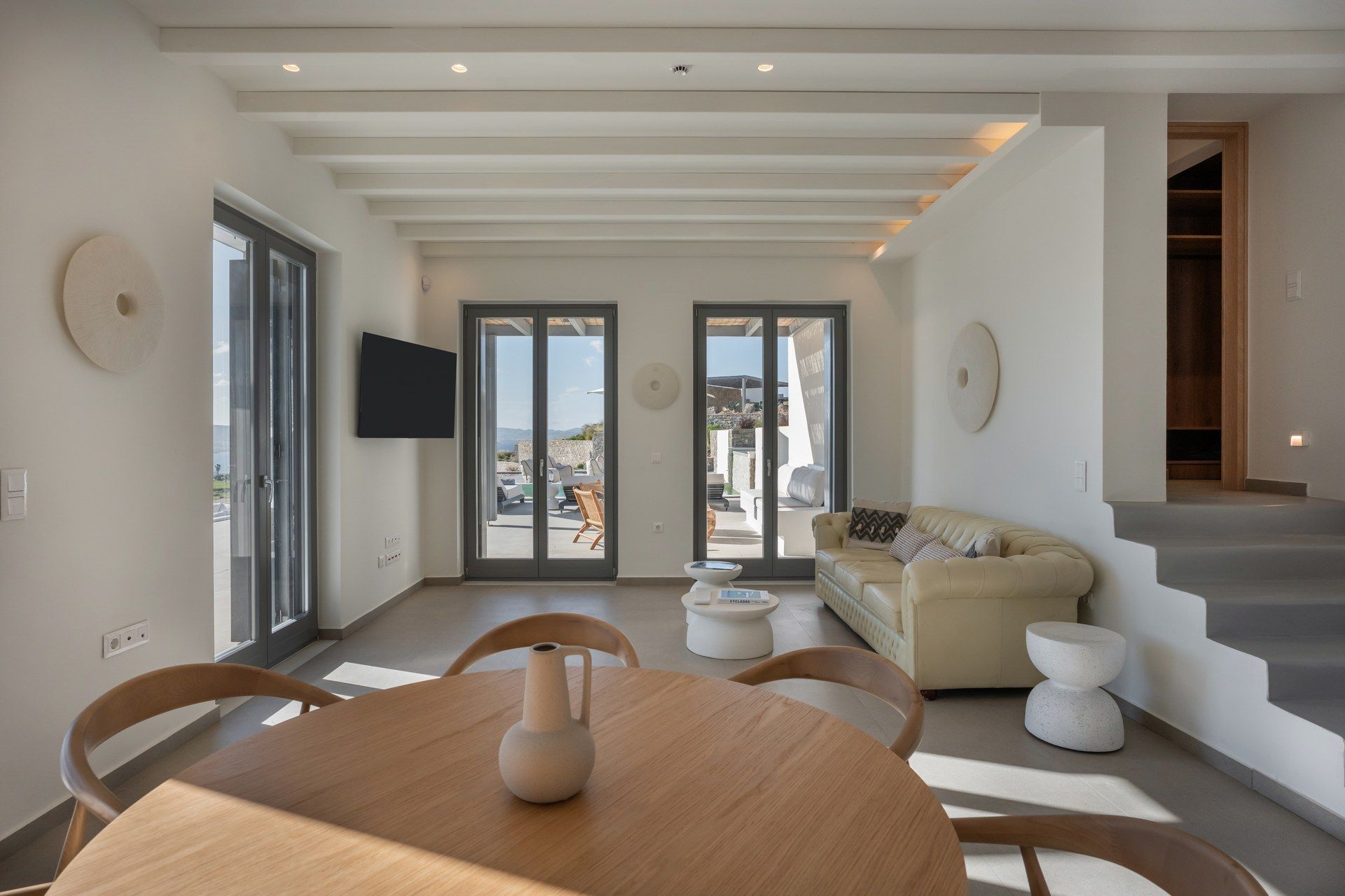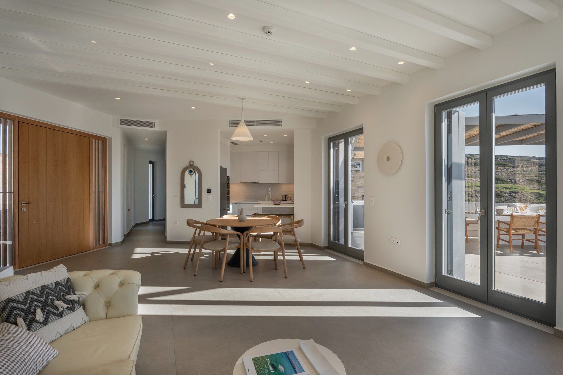 The interiors follow a restrained Cycladic approach, with warm minimalism, soft textures, and an easy connection to the outdoors. The main living space connects directly to the terrace, the master suite stands out with its private jacuzzi veranda, and one of the bedrooms has been thoughtfully designed for wheelchair access. The guesthouse adds another layer of flexibility, functioning either as a separate suite or two sleeping areas, making the layout adaptable for bigger groups.