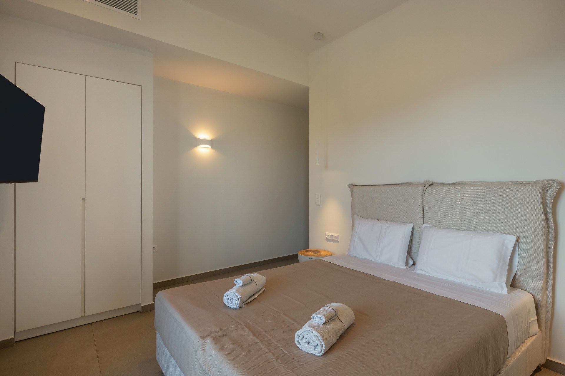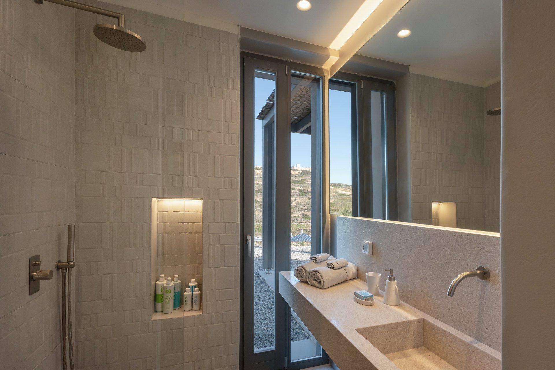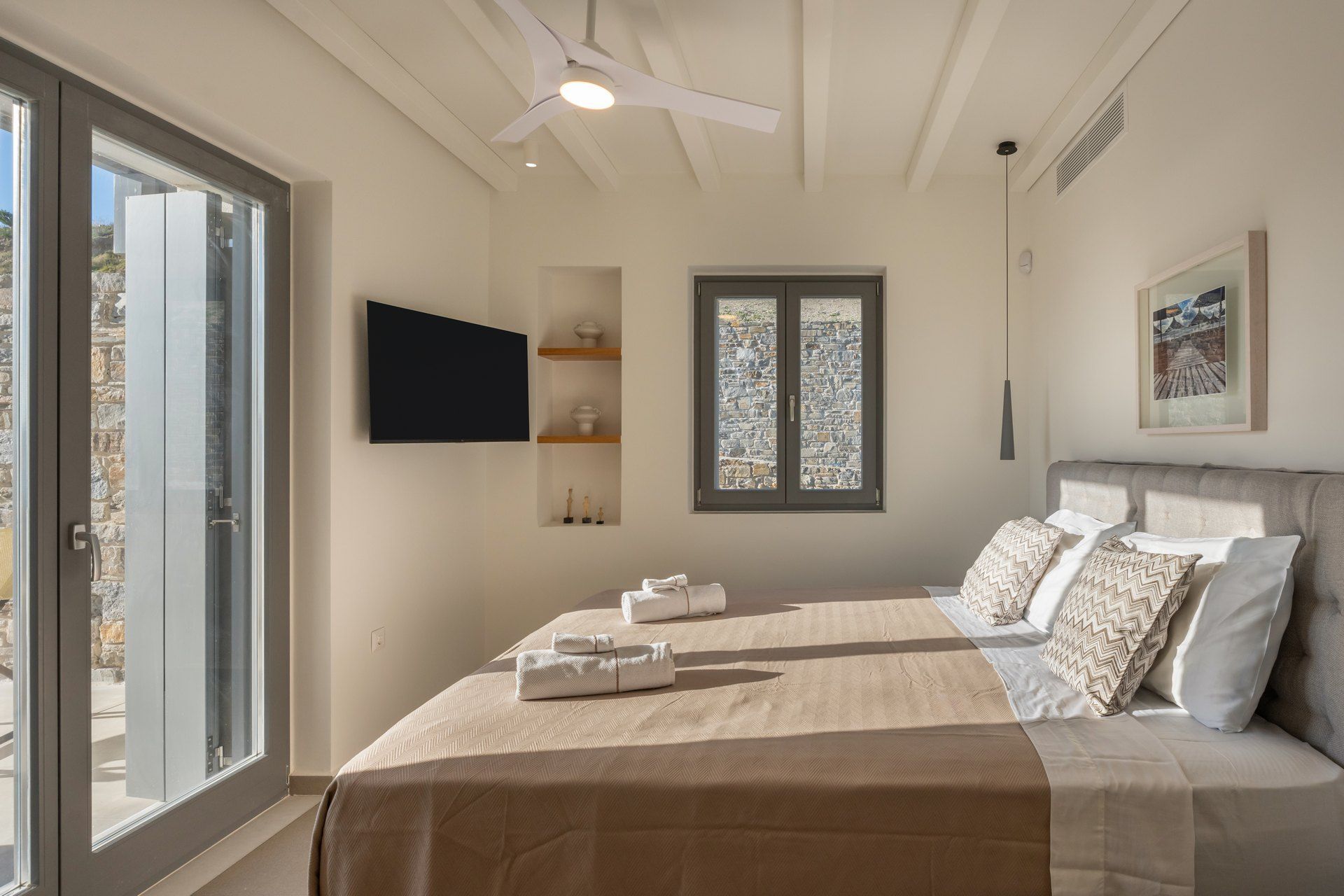 The interiors follow a restrained Cycladic approach, with warm minimalism, soft textures, and an easy connection to the outdoors. The main living space connects directly to the terrace, the master suite stands out with its private jacuzzi veranda, and one of the bedrooms has been thoughtfully designed for wheelchair access. The guesthouse adds another layer of flexibility, functioning either as a separate suite or two sleeping areas, making the layout adaptable for bigger groups.