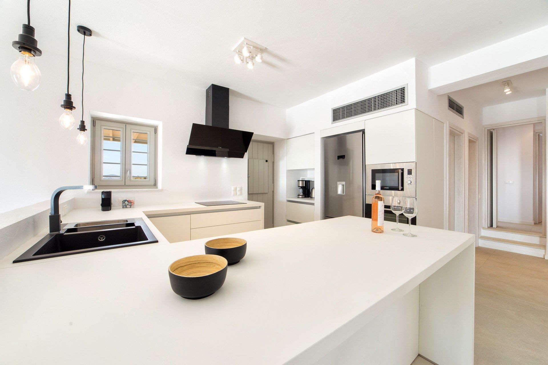Open-plan fully equipped kitchen with dining area for 8 guests, espresso machine, toaster, kettle, sea view