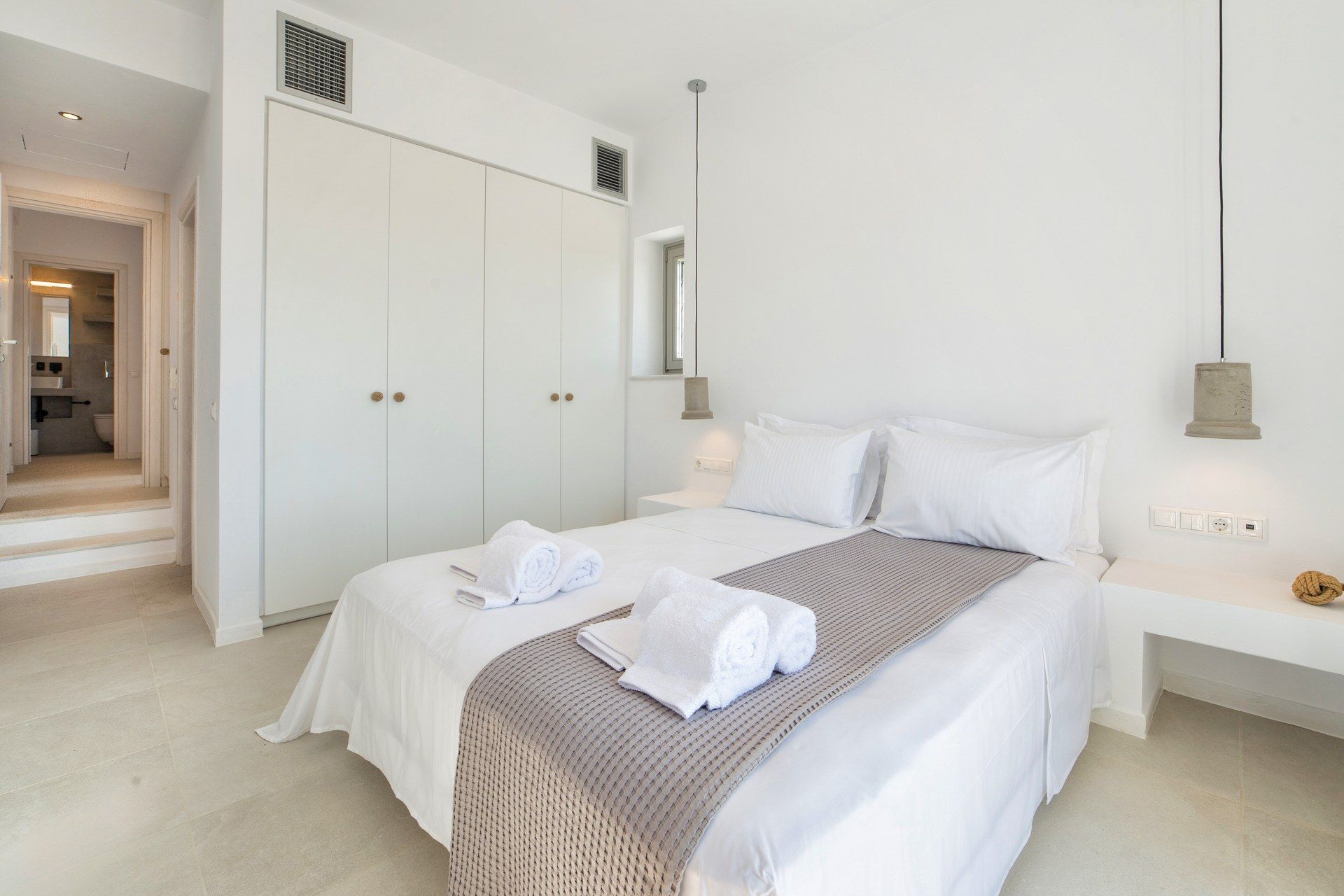 Clean, simple lines, natural colors, and carefully selected materials, like wood and stone, set a calm, understated tone inside. The villa hosts four spacious bedrooms and is arranged around an open-plan living and dining area with a fully equipped kitchen. For families, there’s also a playroom, alongside a small fitness area for guests who like to keep up a light routine. Overall, the interiors feel bright and contemporary, with Cycladic restraint and a soft sense of texture that carries through the spaces.