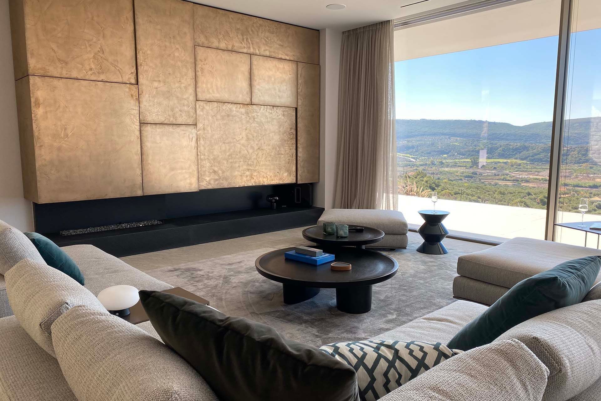 Living area with sofa, TV, fireplace, access to the pool terrace, pool and sea view