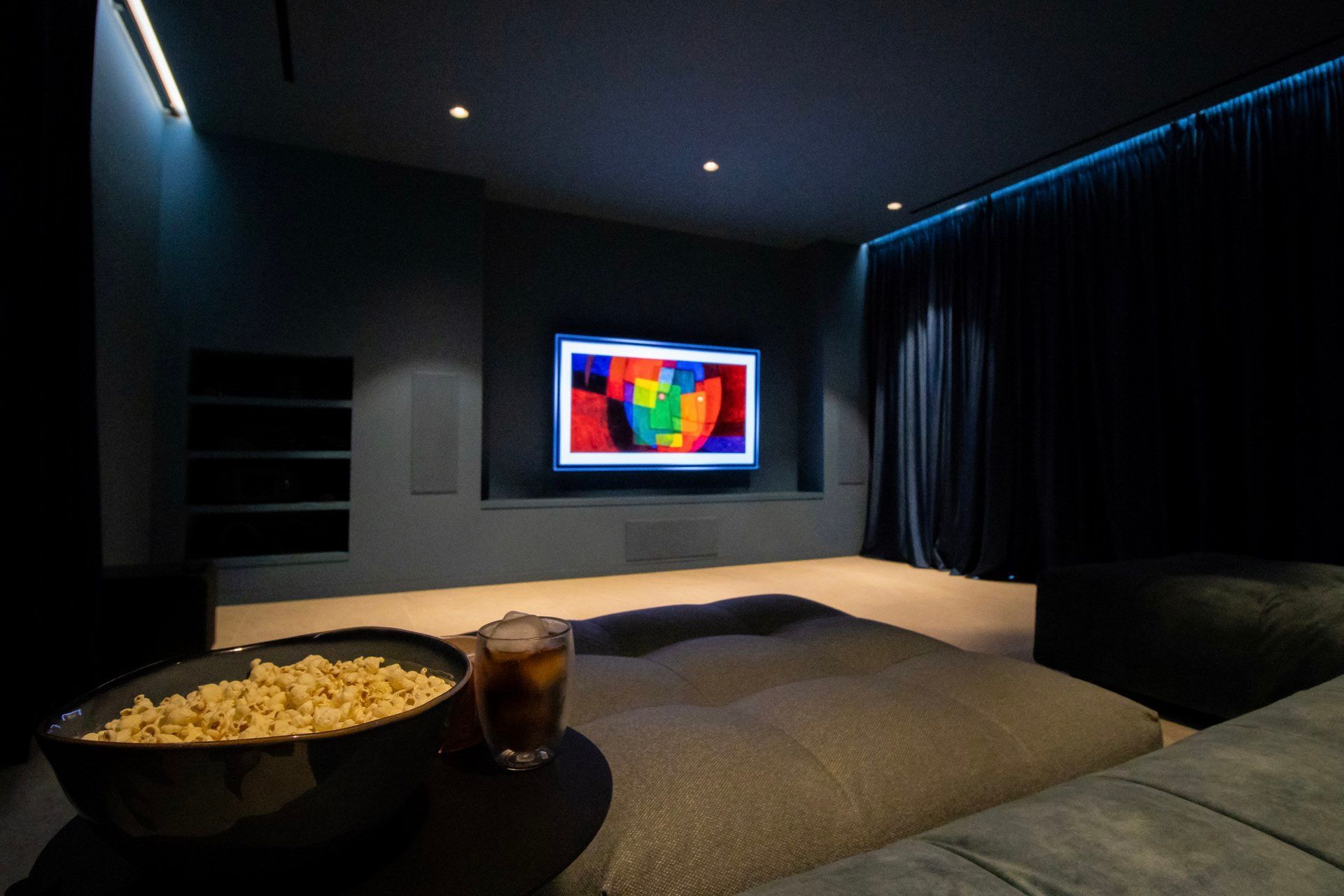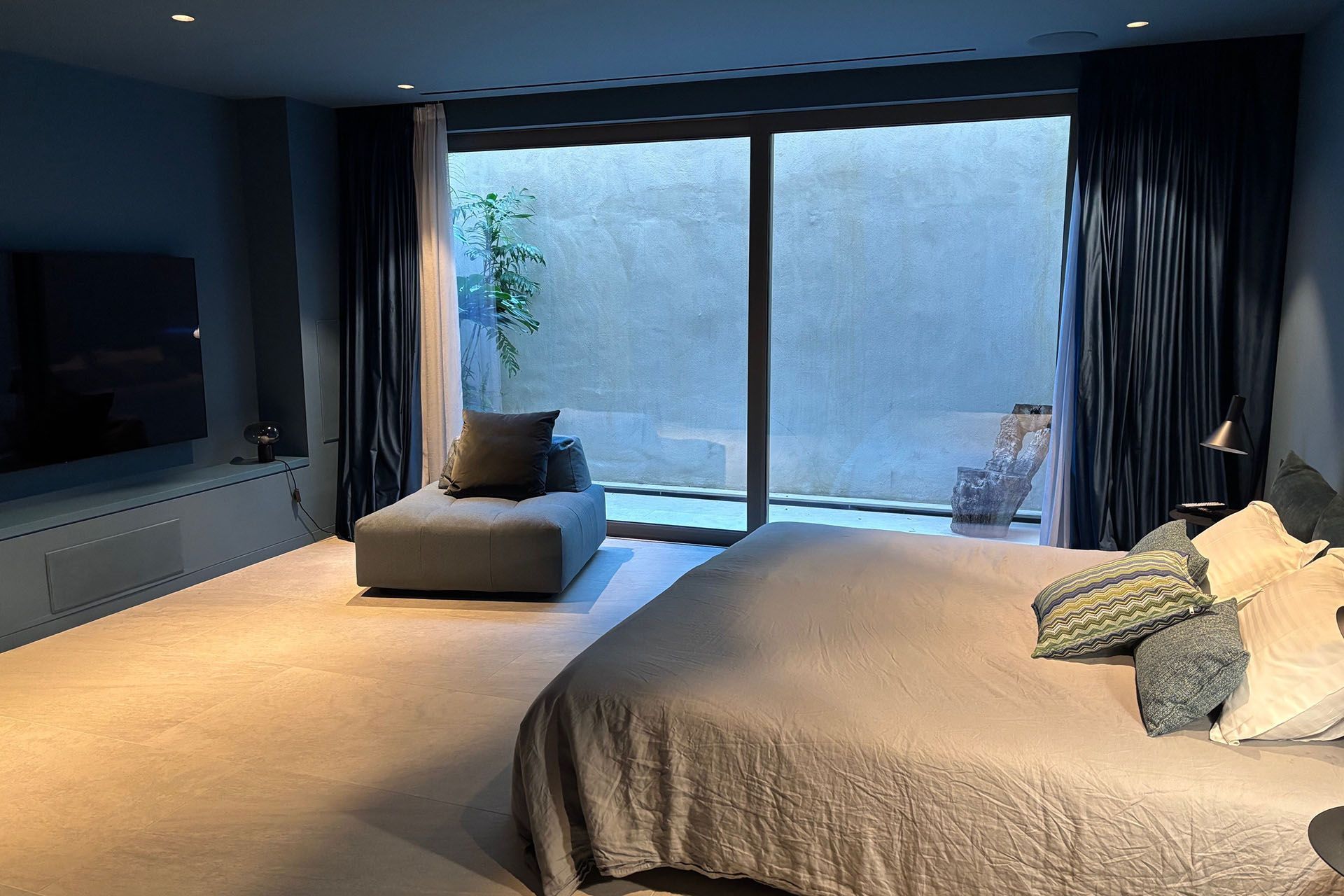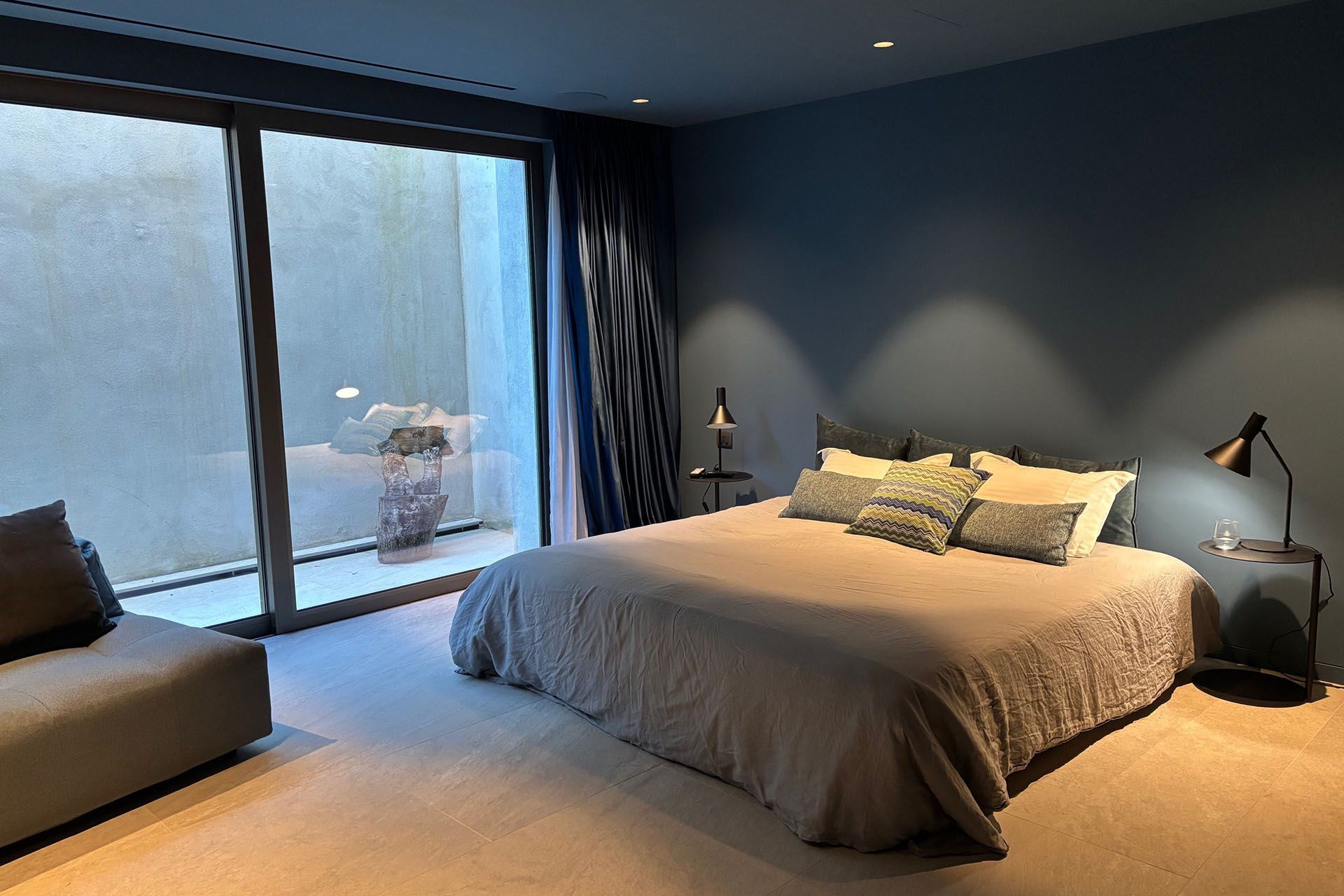 The interiors follow a sleek, minimal line. An open-plan living and dining area sits beside a fully equipped kitchen, and floor-to-ceiling doors open straight to the pool terrace. Three en-suite bedrooms come with comfortable bedding and direct access outdoors, so everyone has a private corner. However, the best part of the villa is the private cinema room on the lower level, ready to host the ultimate family movie night.