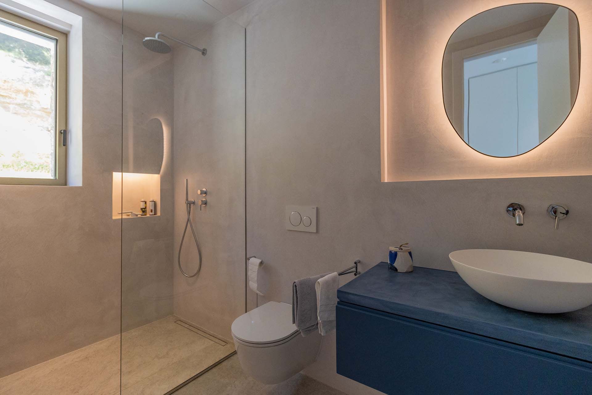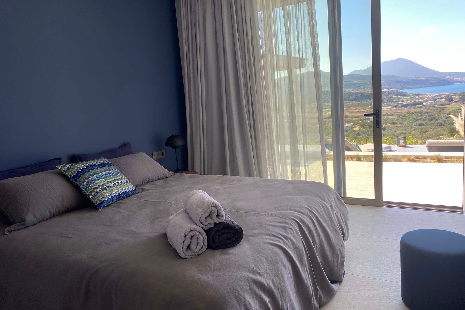 1 guest bedroom with a double bed or twin beds, A/C, en-suite bathroom with shower, safe box, access to the pool terrace, sea view