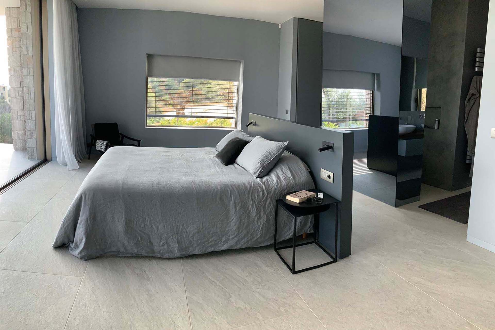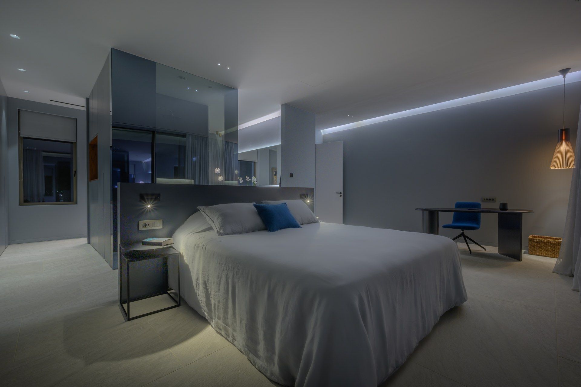 1 master bedroom with a king-size bed, A/C, en-suite bathroom with shower, dressing room, safe box, office area, access to the pool terrace, sea view