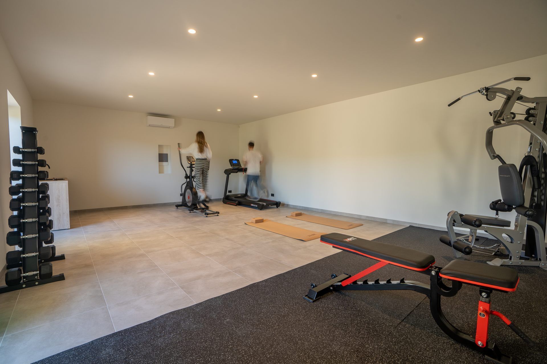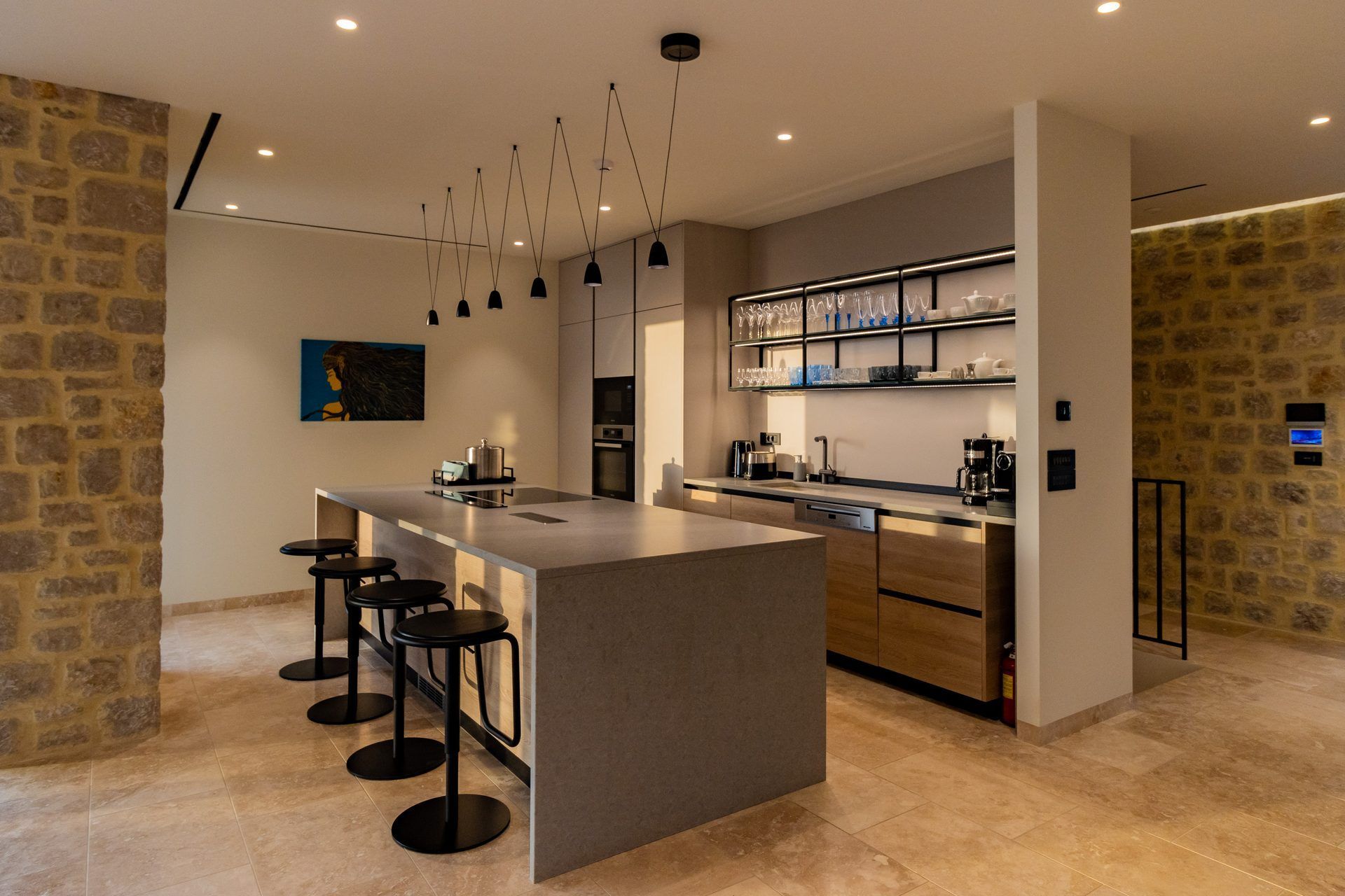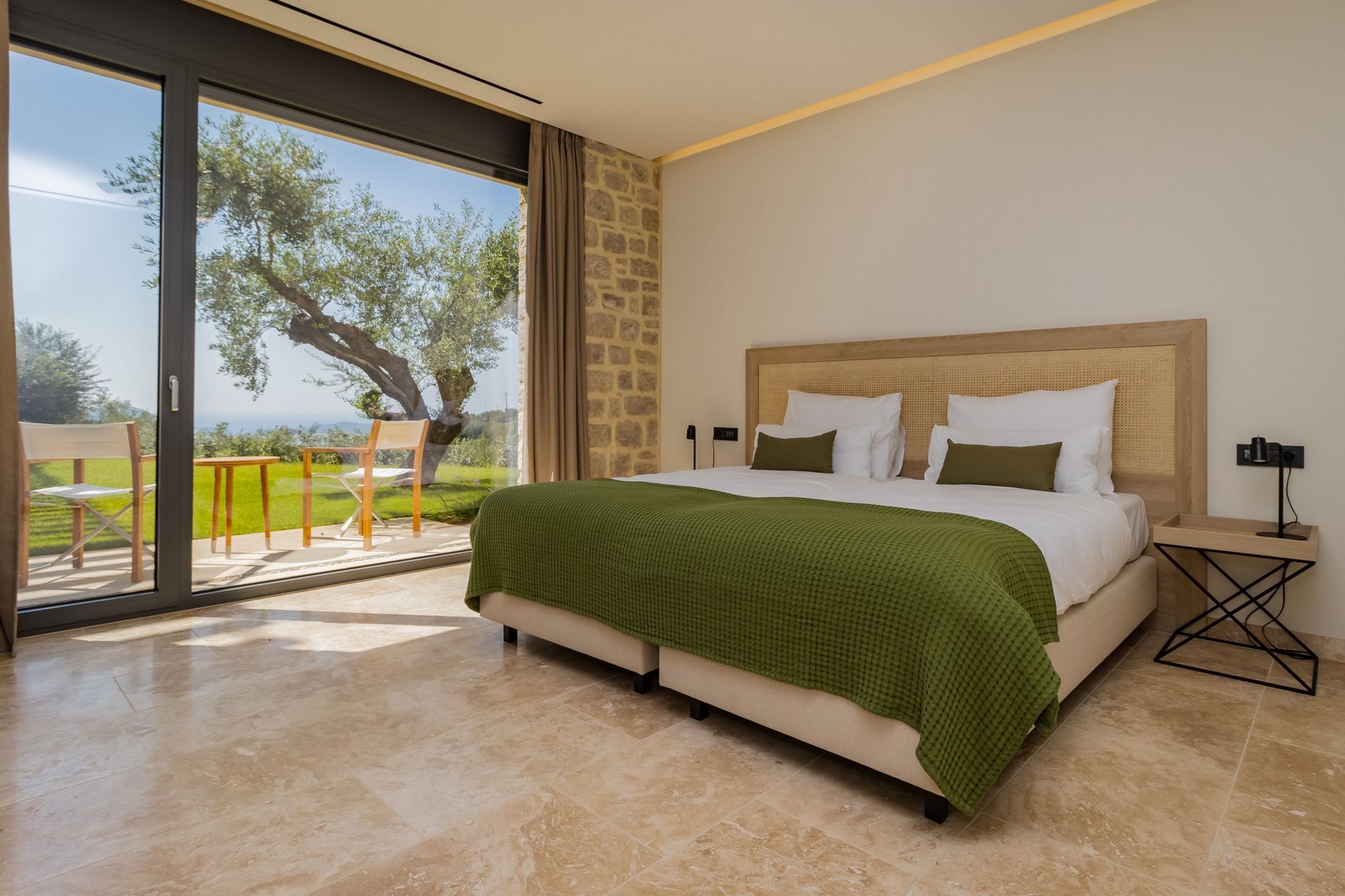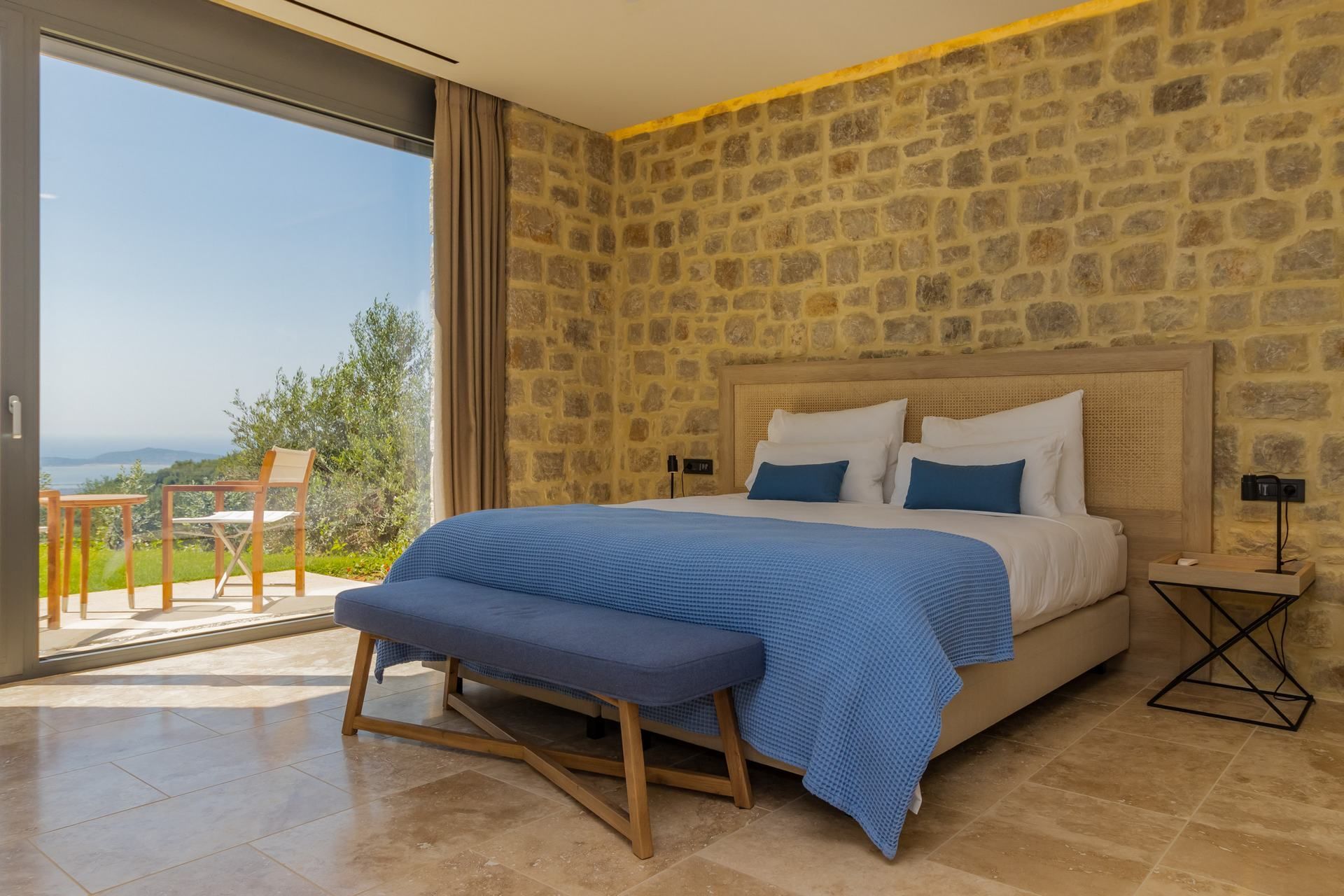 The interior of Lillian is adorned with vivid, earthy colors and minimal furnishing that, along with the floor-to-ceiling doors, create a bright and inviting ambiance. Four luxury bedrooms are spread over 2 levels, along with a fully equipped gym downstairs, for those who like to keep up with their workout routine. The open-plan living area invites you to relax, while the fully equipped kitchen has what you need for easy breakfasts and espresso-in-hand mornings with a view. Trust us, everything is simple, functional, and designed for summertime.