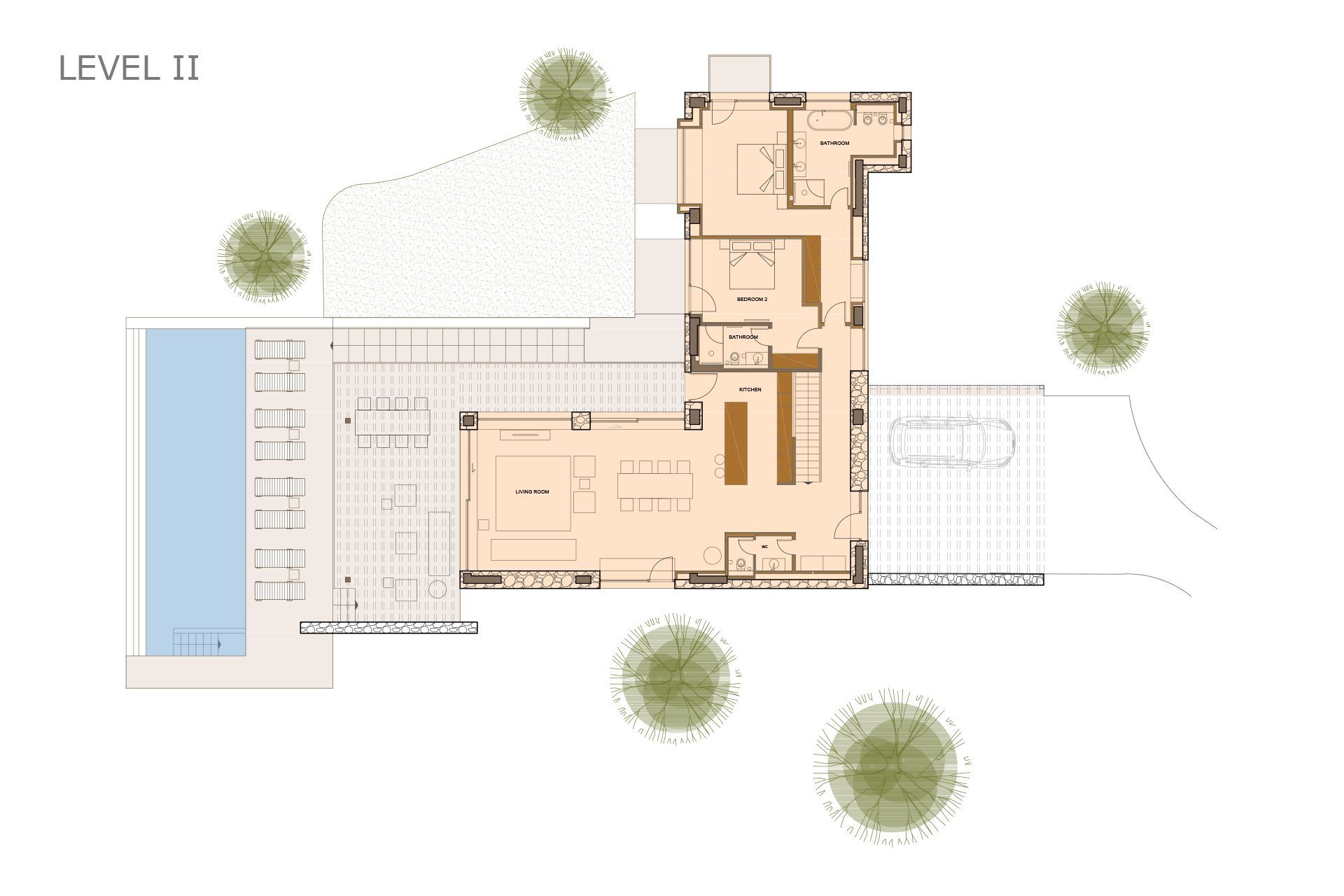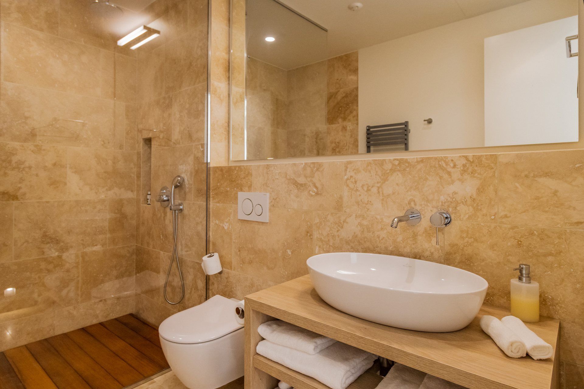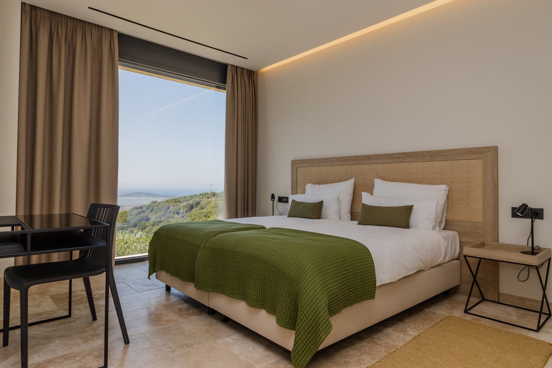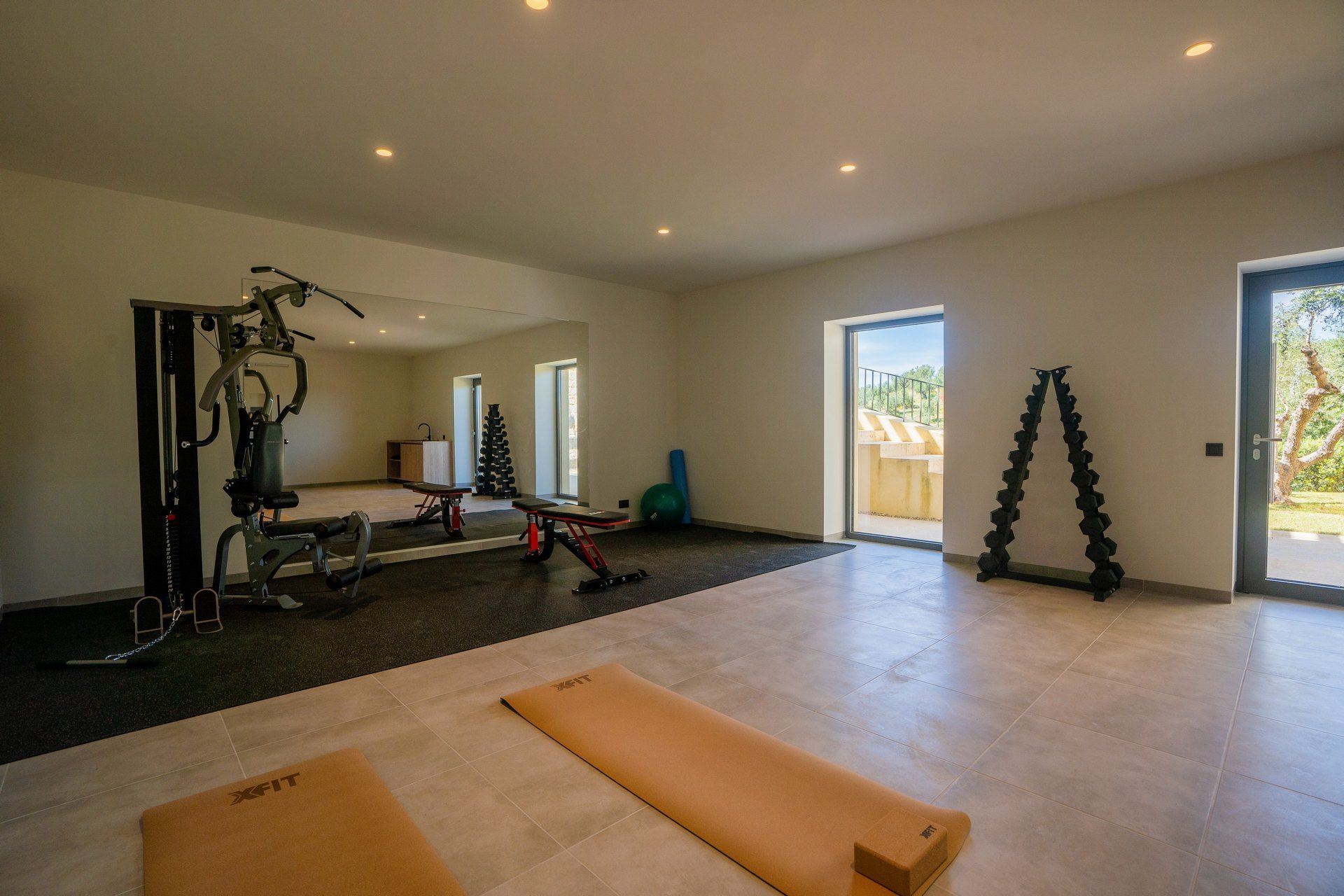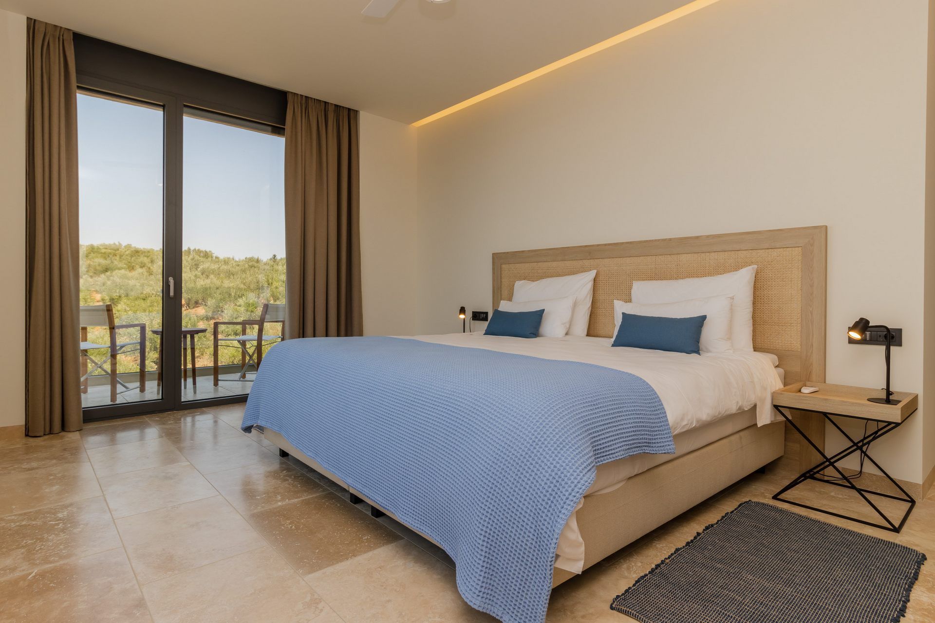 The interior of Lillian is adorned with vivid, earthy colors and minimal furnishing that, along with the floor-to-ceiling doors, create a bright and inviting ambiance. Four luxury bedrooms are spread over 2 levels, along with a fully equipped gym downstairs, for those who like to keep up with their workout routine. The open-plan living area invites you to relax, while the fully equipped kitchen has what you need for easy breakfasts and espresso-in-hand mornings with a view. Trust us, everything is simple, functional, and designed for summertime.