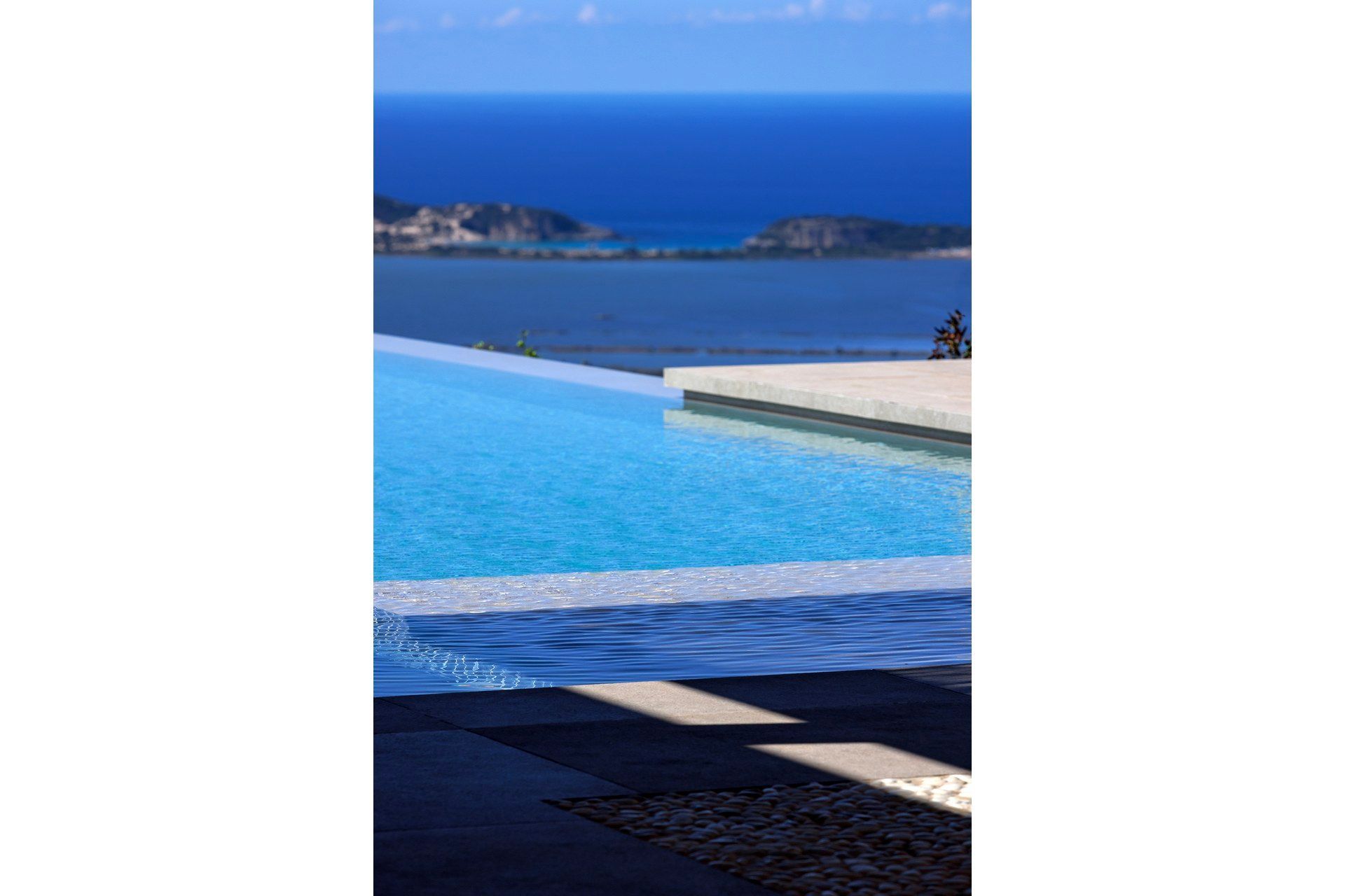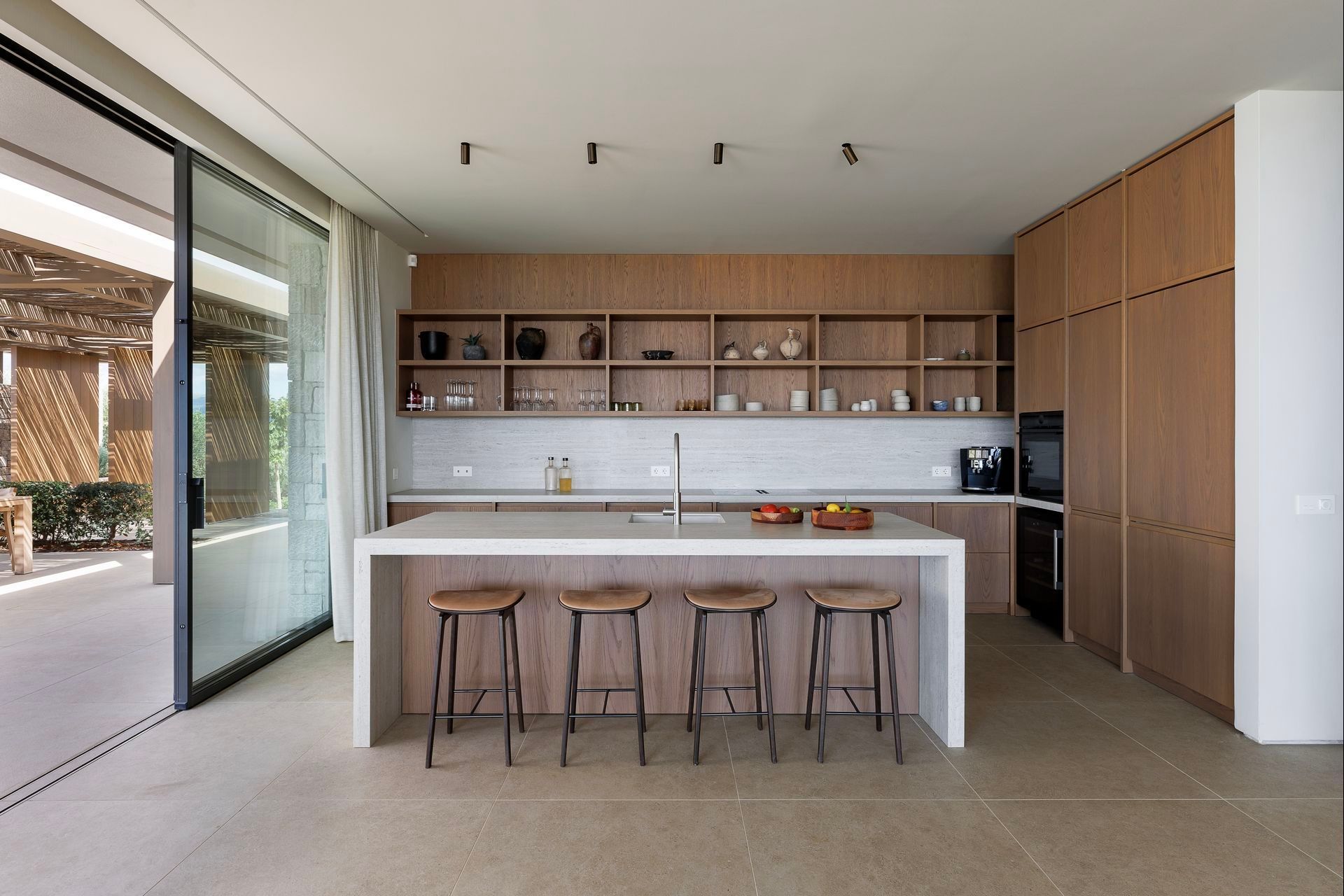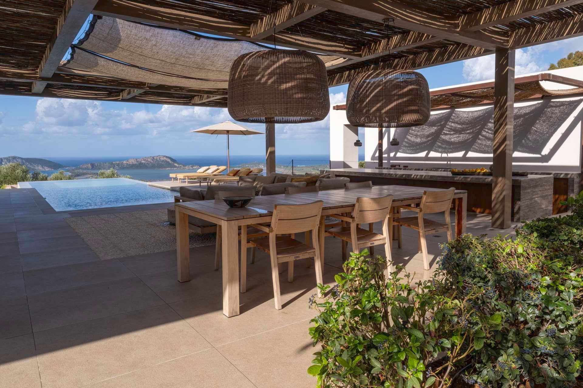The outdoor spaces are central to the experience and among the villa’s strongest assets. The infinity pool sits just beyond the house, drawing the eye toward the water, while the covered dining and lounge areas create a natural place to gather throughout the day. A pool bar, outdoor kitchen, barbecue, and fire pit make staying in feel especially rewarding, and the terraced setting within the olive grove gives everything a sense of privacy and quiet. Even at full occupancy, the exterior feels generous.