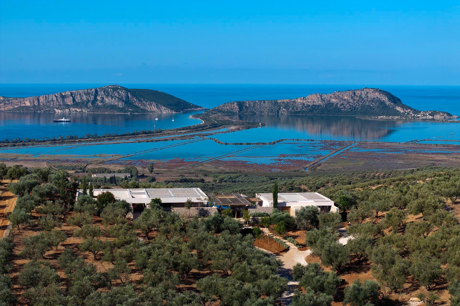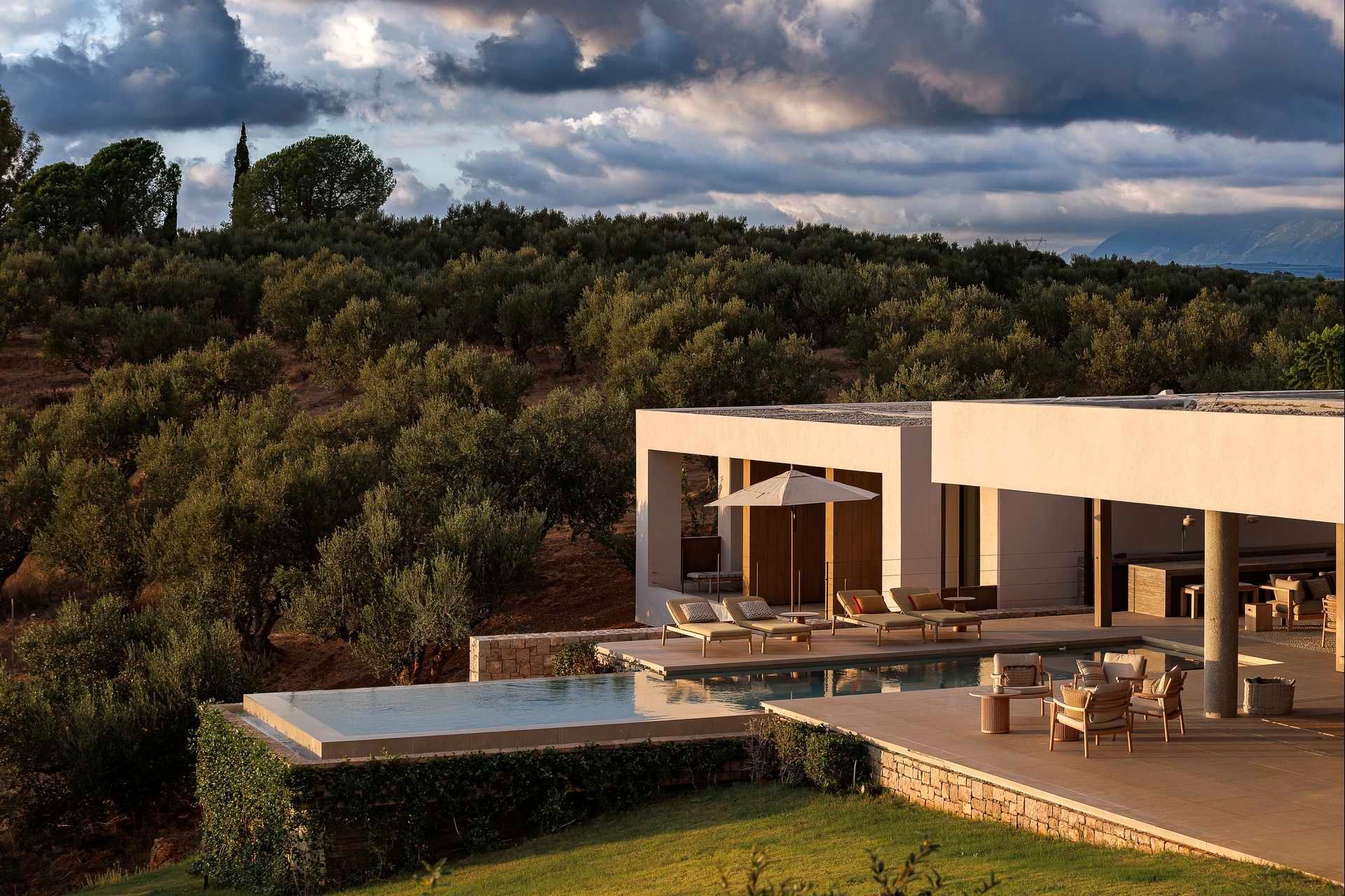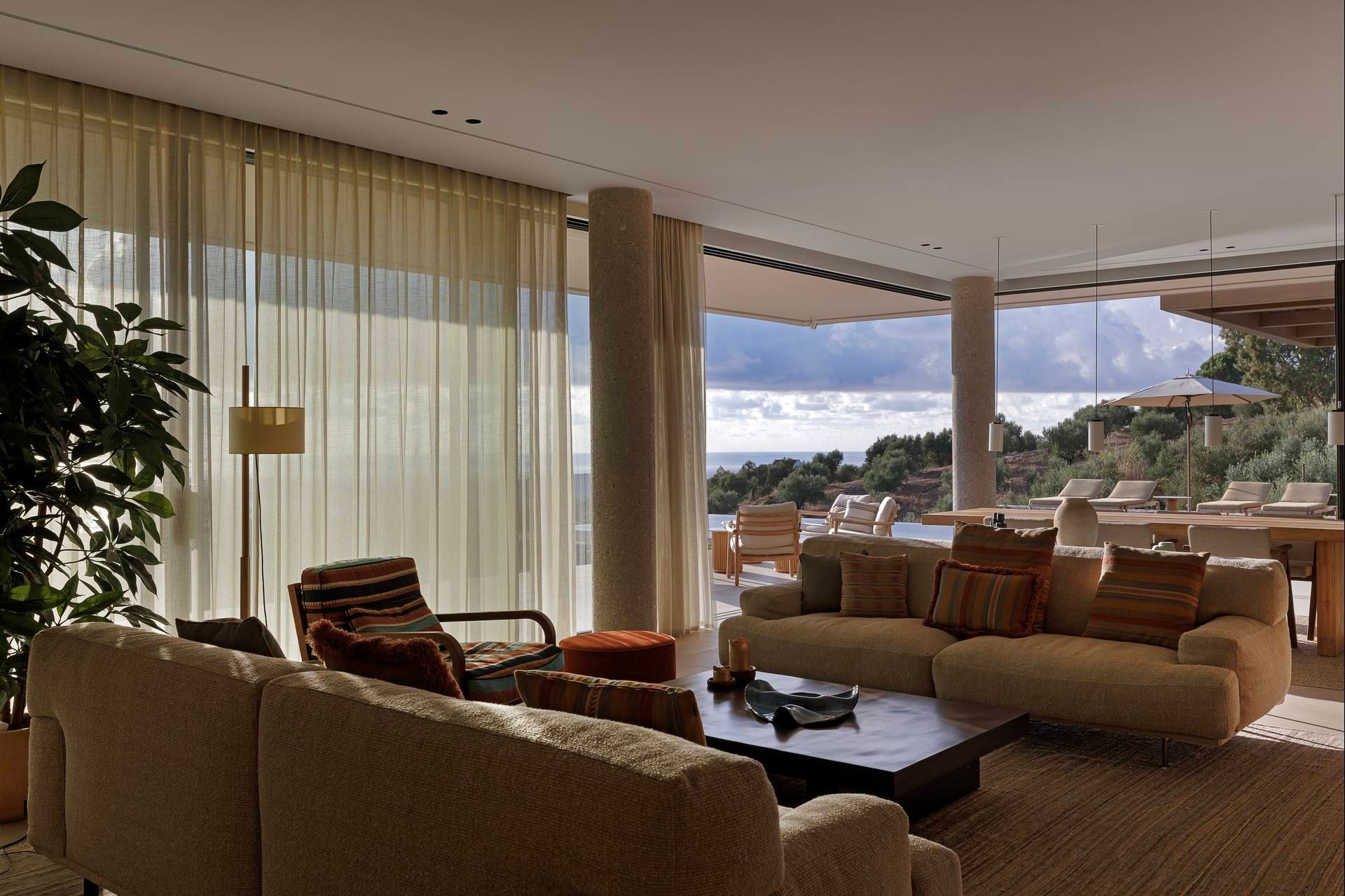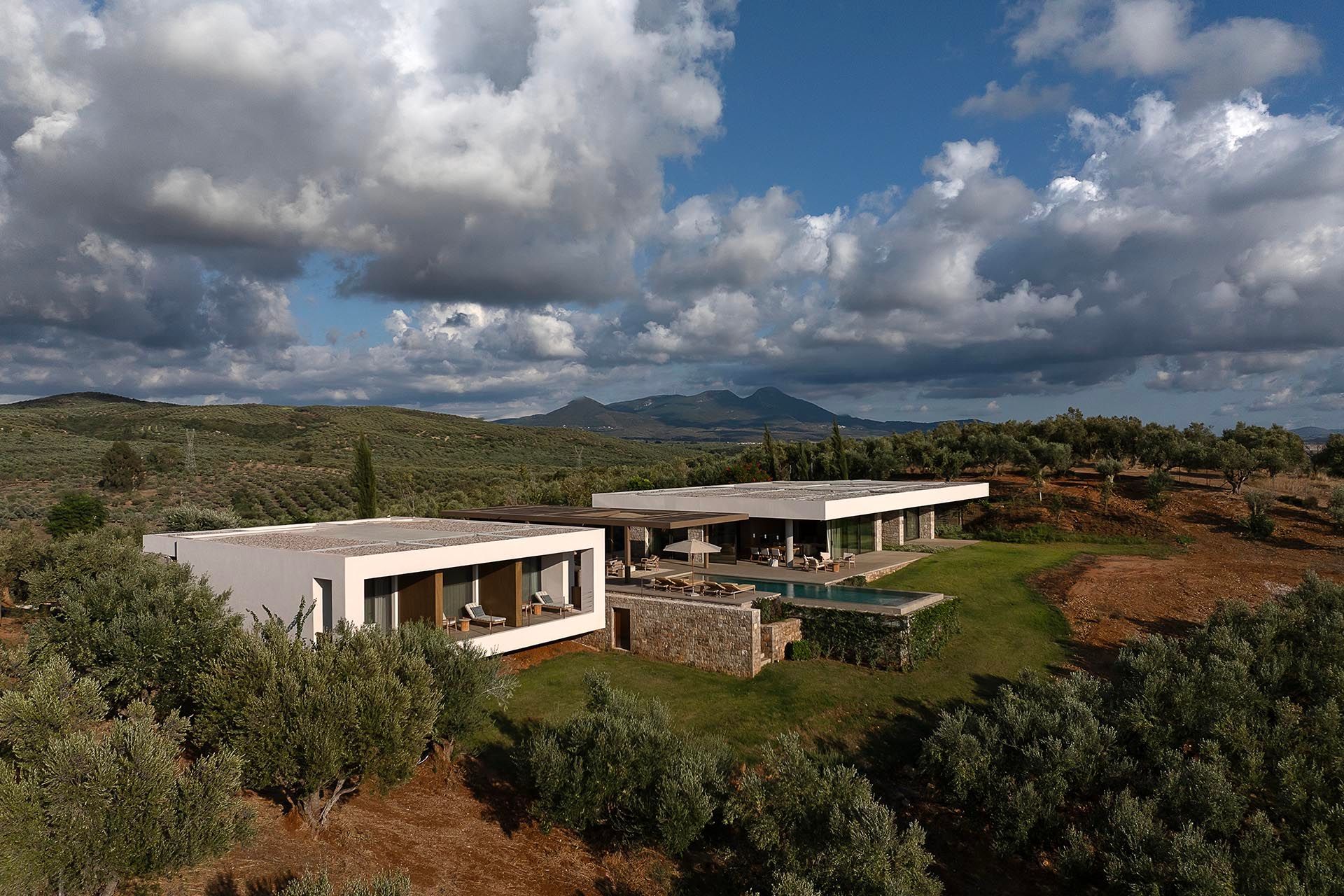 Olivewood is one of those houses where the setting does much of the work, but the architecture rises to meet it. Perched above Gialova with panoramic views across the bay, the lagoon, and the wider Messinian landscape, it accommodates up to eight adults and four children across four bedrooms. The separation between the main house and guesthouse is one of its strongest advantages, while the design itself feels rooted and contemporary at once, thanks to its low profile, earthy palette, and strong relationship to the olive grove around it.