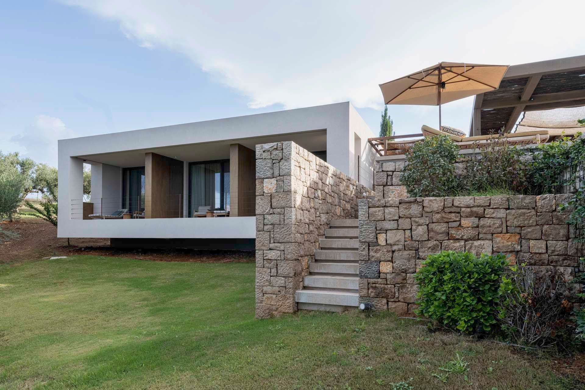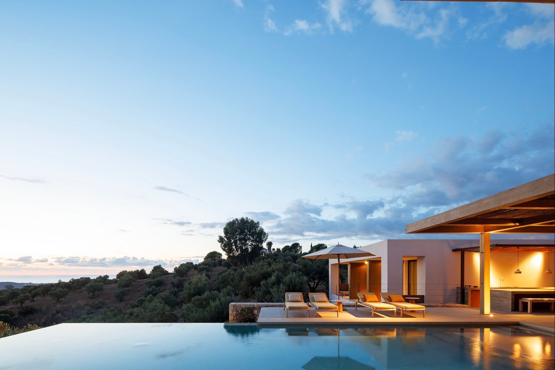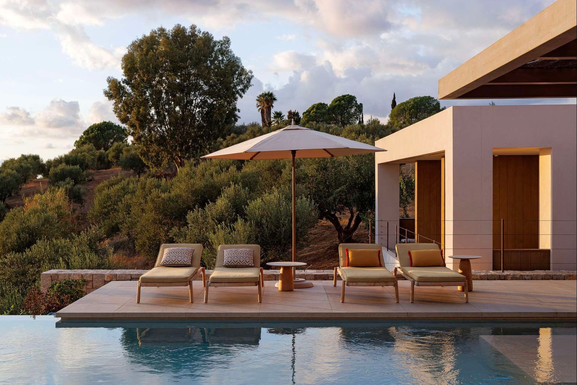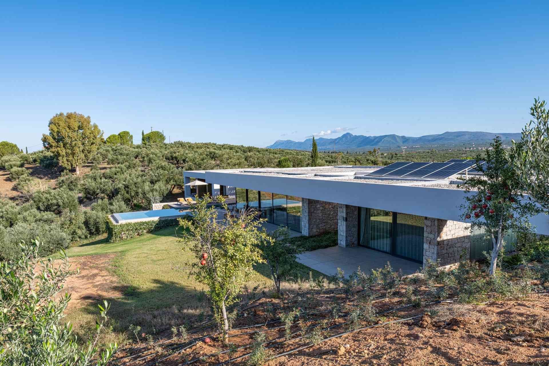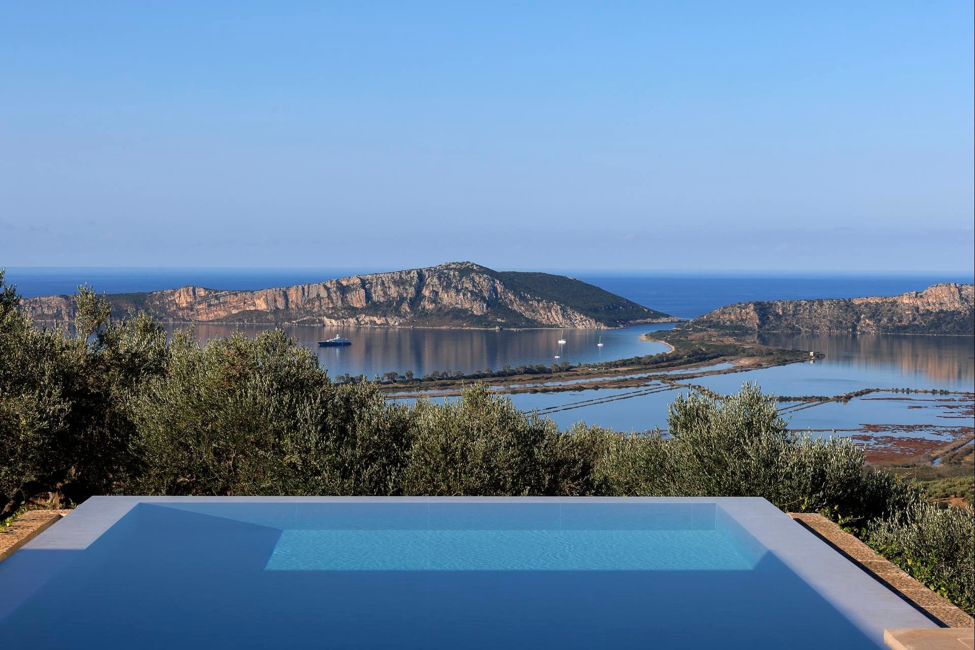 Olivewood is one of those houses where the setting does much of the work, but the architecture rises to meet it. Perched above Gialova with panoramic views across the bay, the lagoon, and the wider Messinian landscape, it accommodates up to eight adults and four children across four bedrooms. The separation between the main house and guesthouse is one of its strongest advantages, while the design itself feels rooted and contemporary at once, thanks to its low profile, earthy palette, and strong relationship to the olive grove around it.
