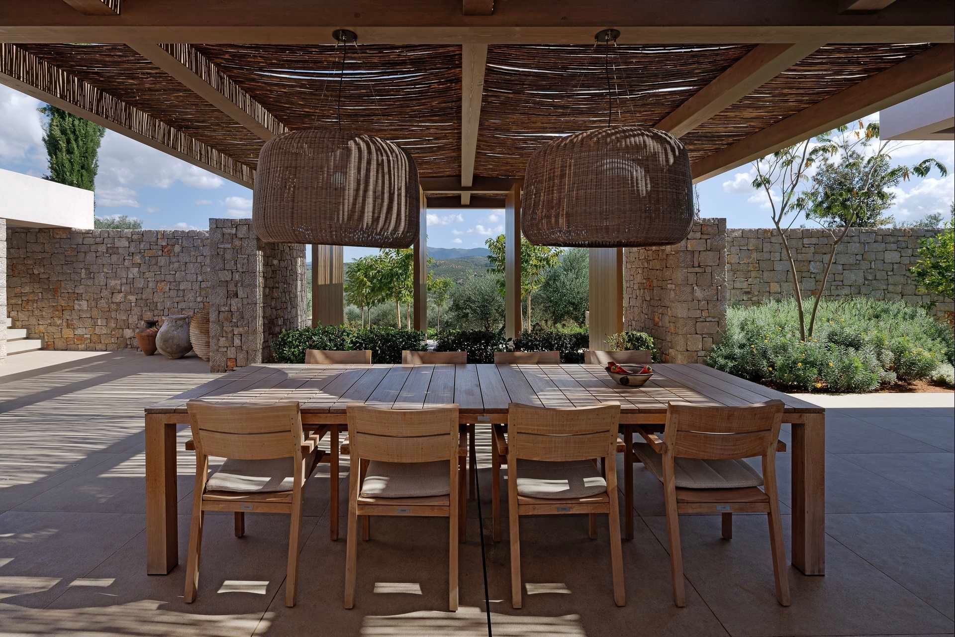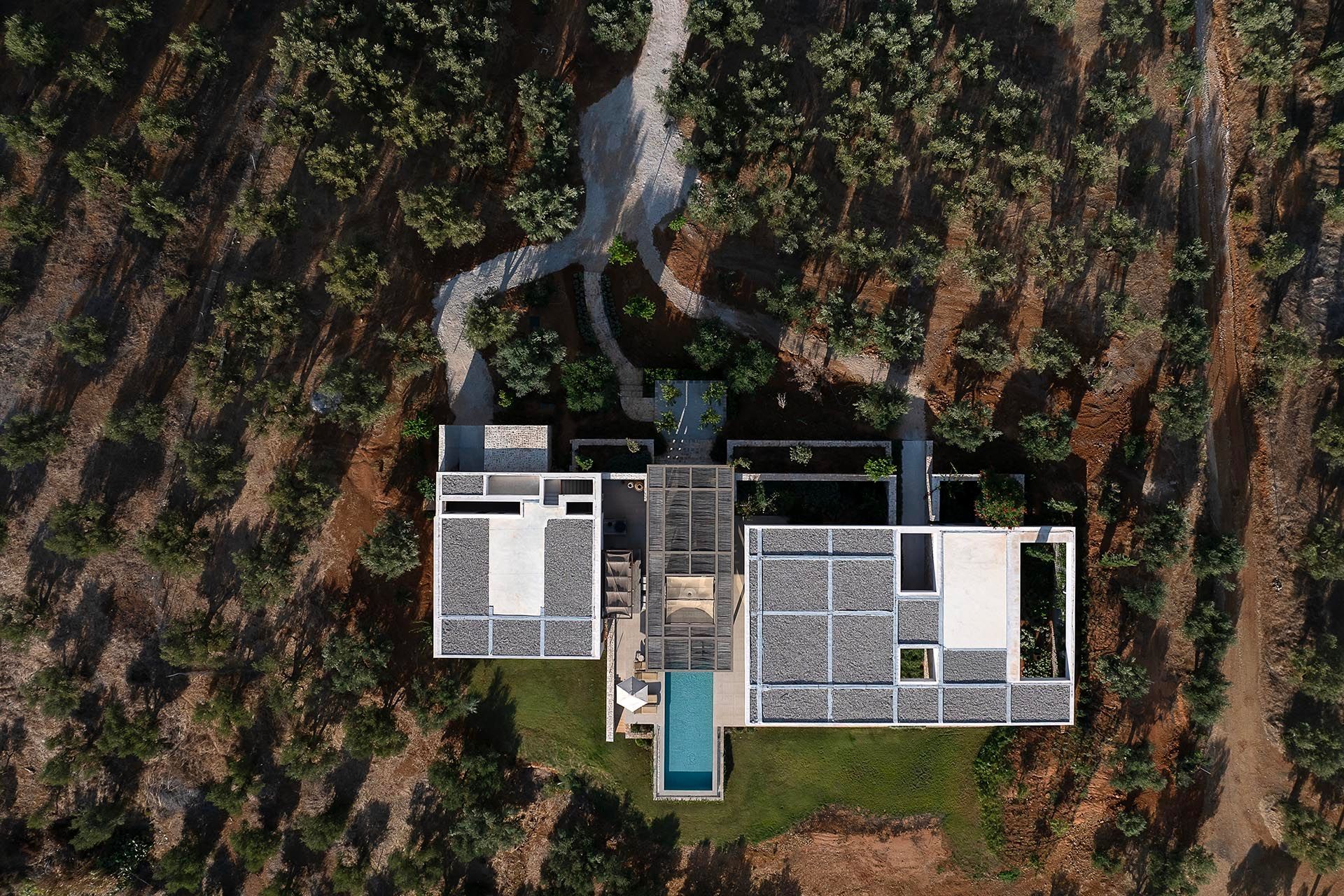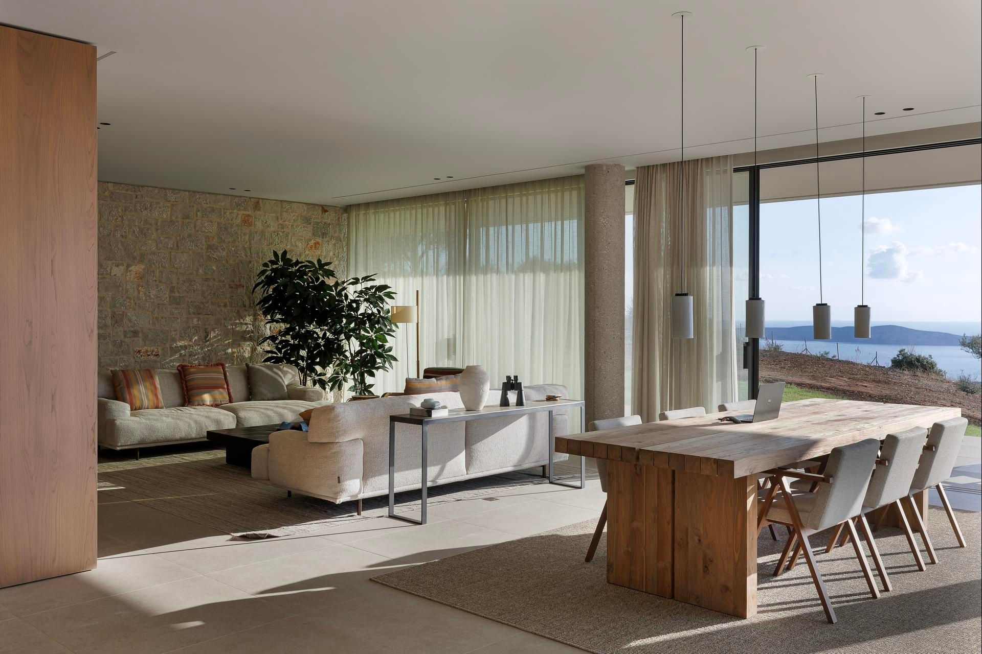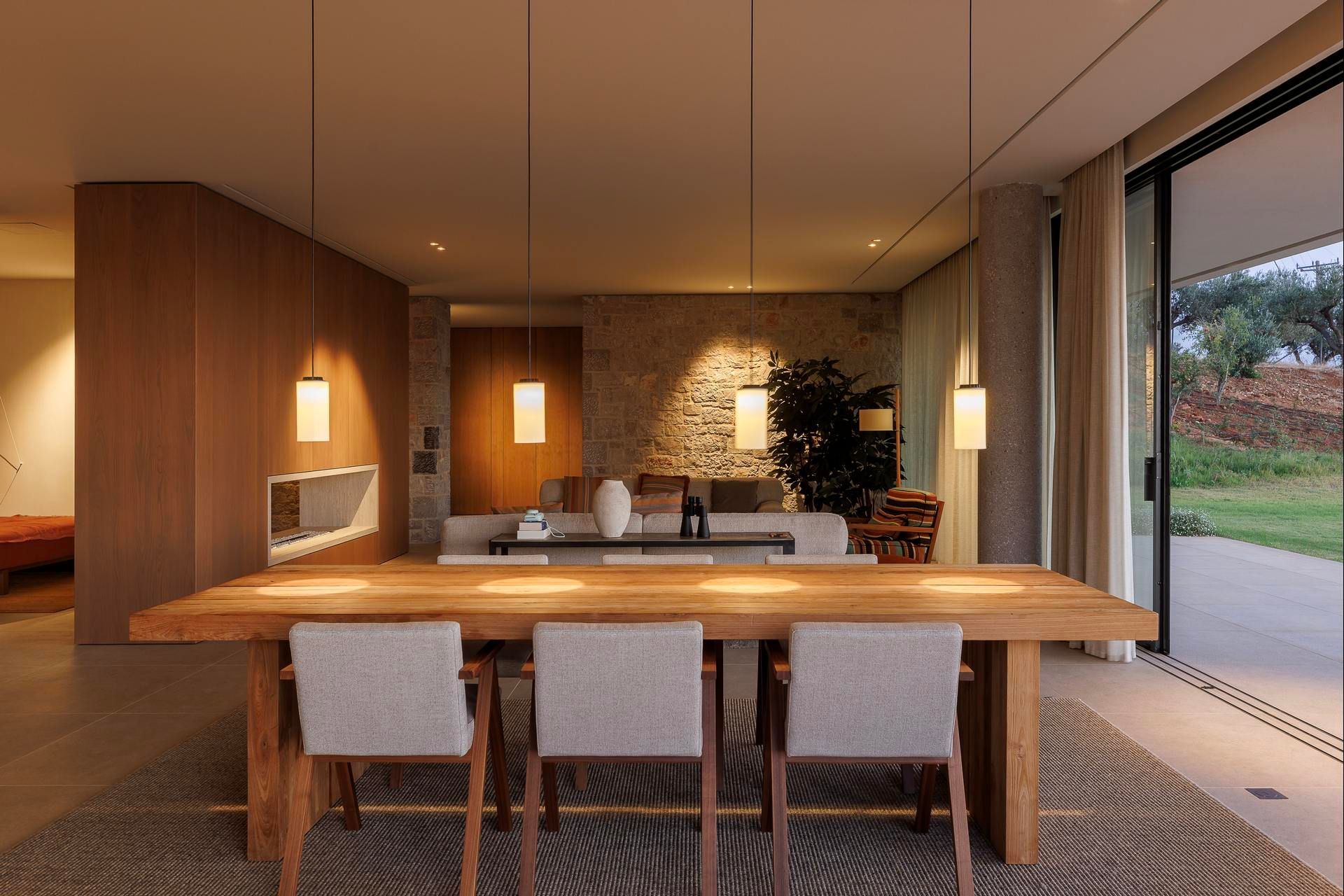 Olivewood is one of those houses where the setting does much of the work, but the architecture rises to meet it. Perched above Gialova with panoramic views across the bay, the lagoon, and the wider Messinian landscape, it accommodates up to eight adults and four children across four bedrooms. The separation between the main house and guesthouse is one of its strongest advantages, while the design itself feels rooted and contemporary at once, thanks to its low profile, earthy palette, and strong relationship to the olive grove around it.