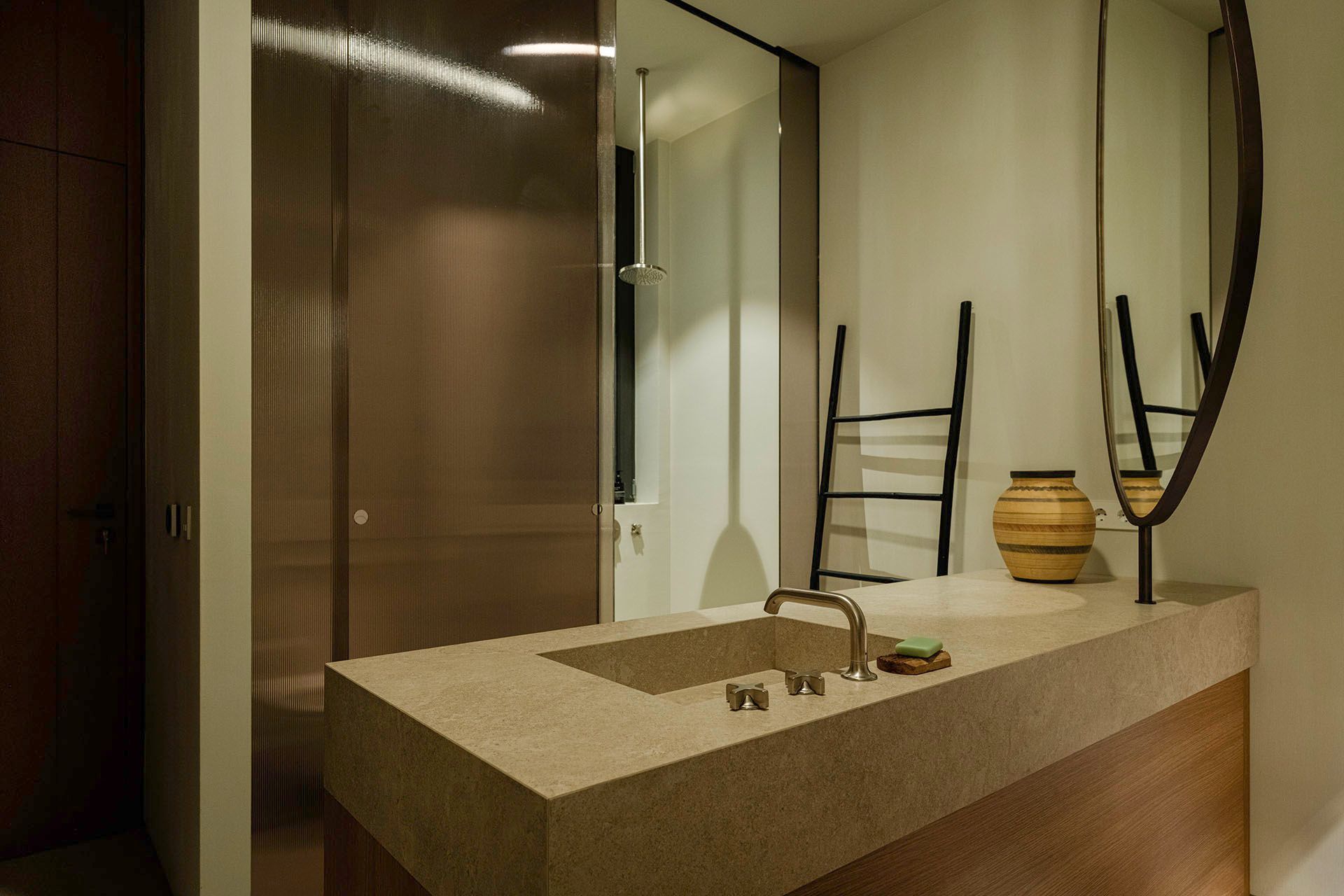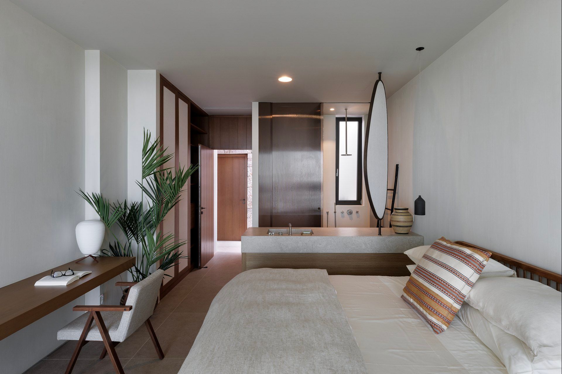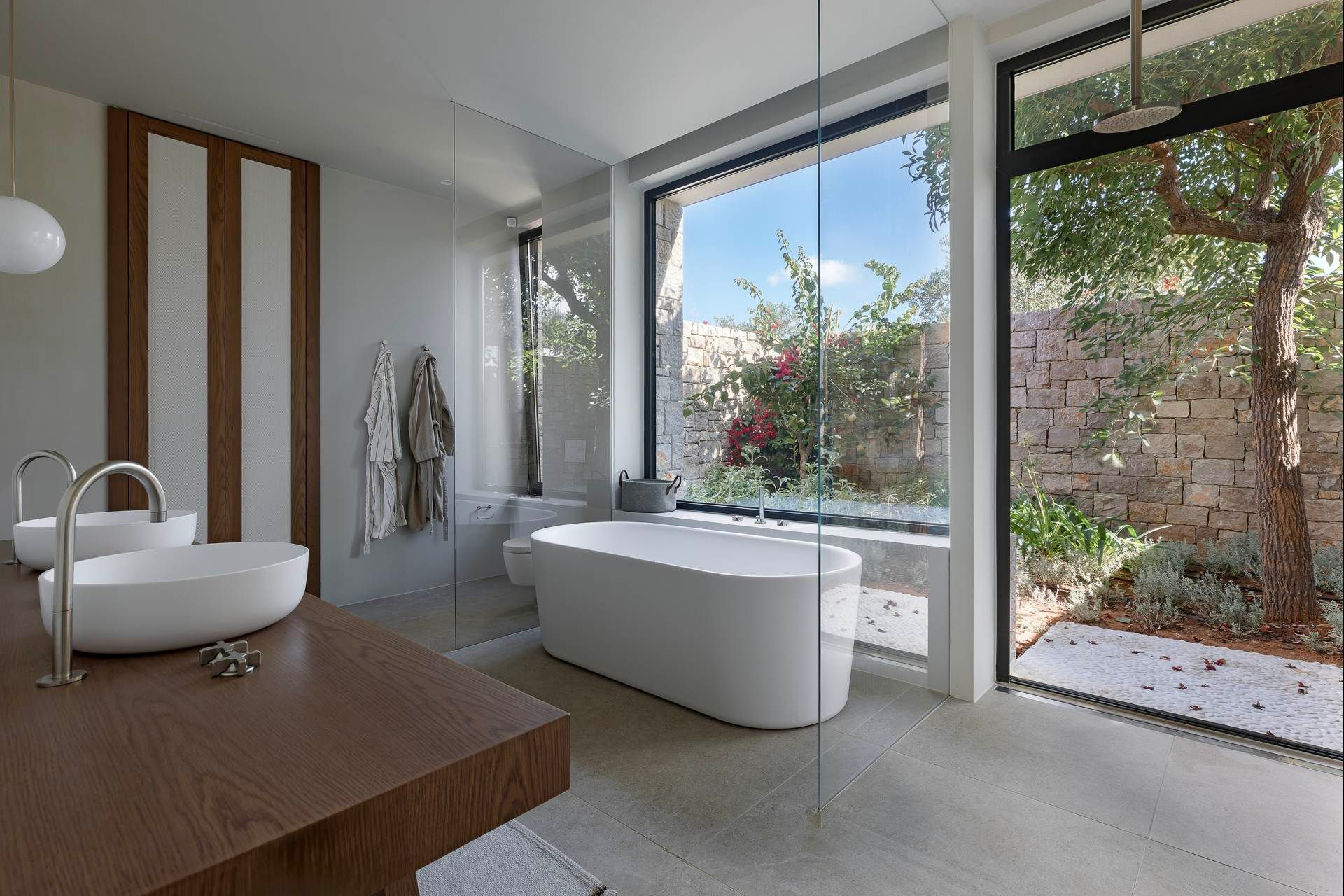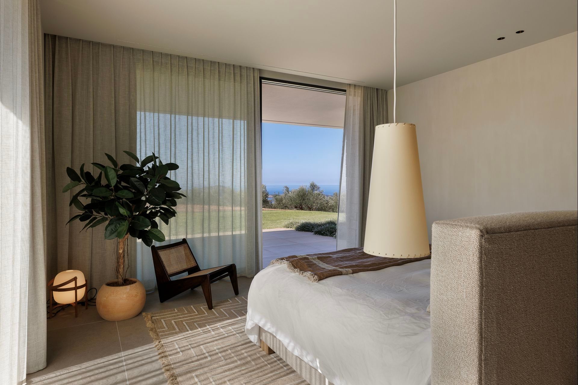 Inside, Olivewood is bright, spacious, and open to the view, with soft materials, floor-to-ceiling windows and muted colors giving the interiors a warm and settled character. The living room, dining area, and kitchen form one easy social space, while the TV room adds a more private corner for cozy moments. The master suite has a more indulgent feel, with its dressing area, bathtub, and walk-in shower, while the guesthouse bedrooms are equally well considered and benefit from their own terraces and ensuite bathrooms.