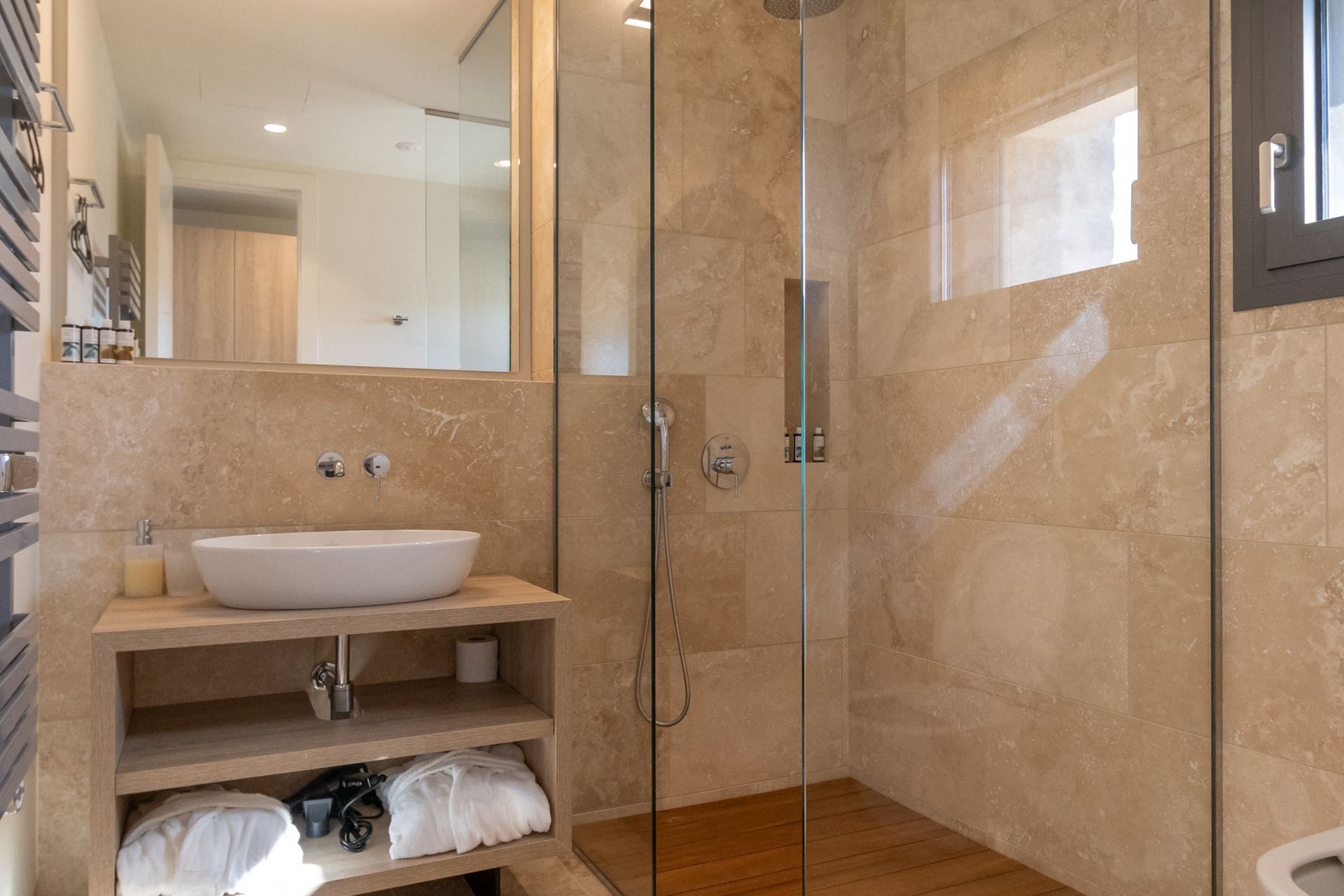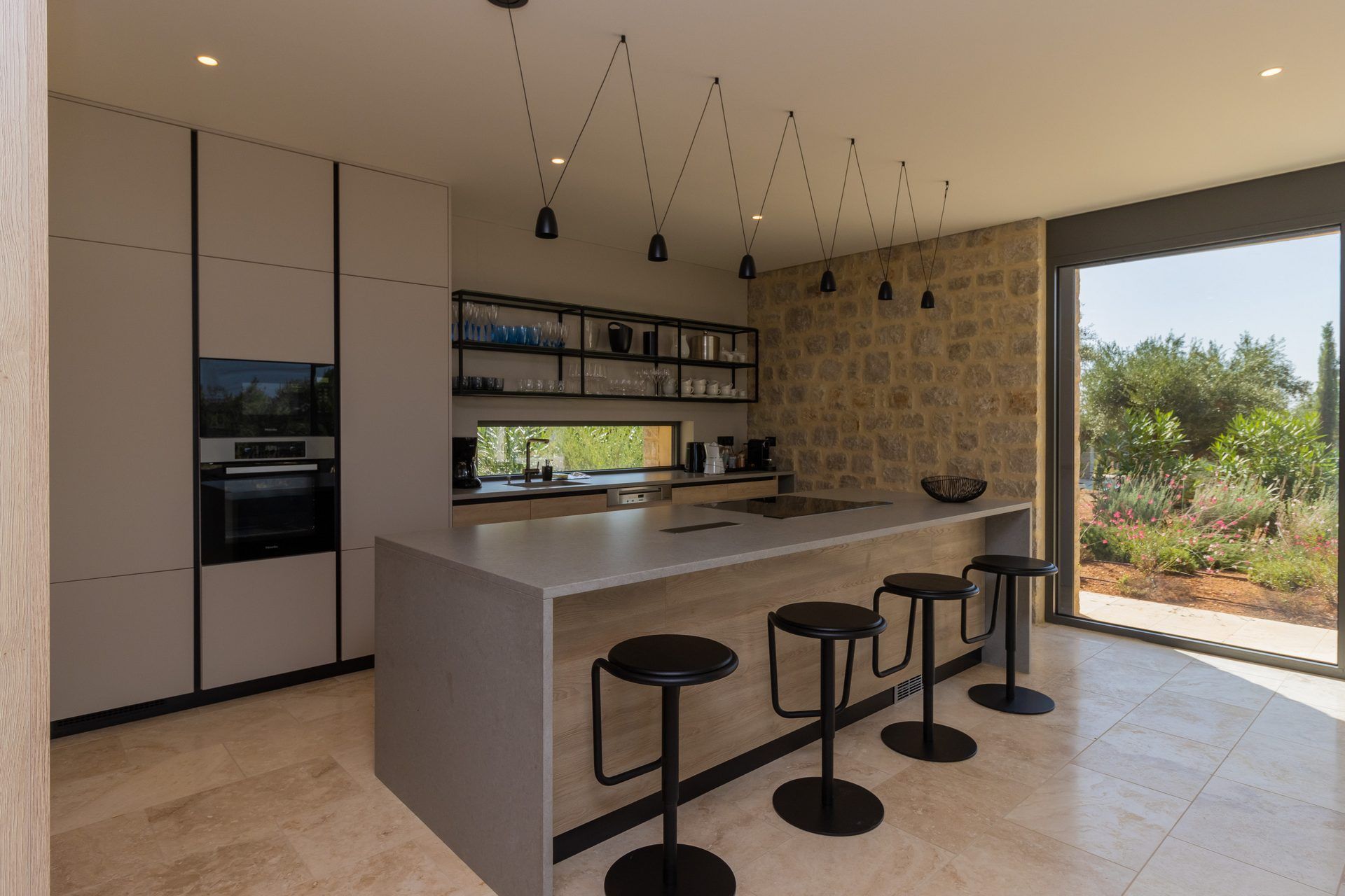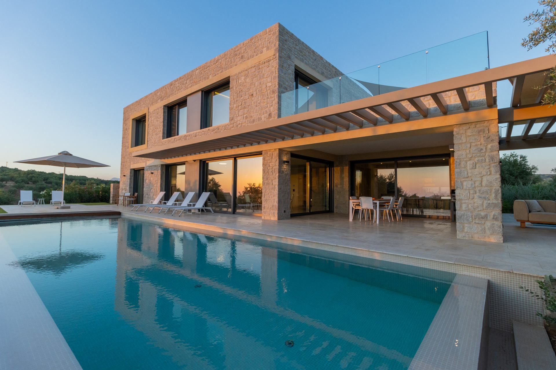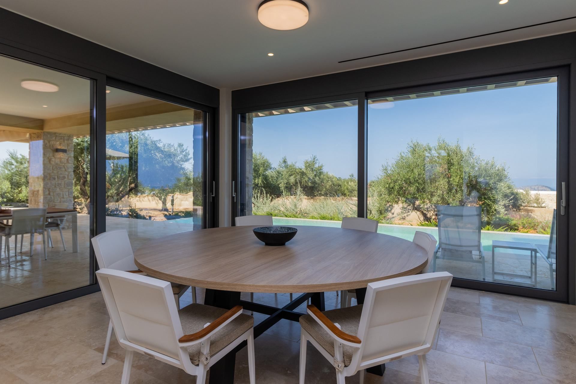 Minimal, contemporary interiors use natural materials and feature elegant furniture with warm, earthy colors. Every area has large sliding doors creating a visual flow among the indoor and outdoor spaces and letting the natural light in. On the ground level, an open plan living and dining area leads directly to the pool, plus there is a modern kitchen with every appliance you need to prepare your meals. One of the bedrooms is located here, and at the upper level, you will find 3 sea-view bedrooms, one of them being a master suite with access to a private balcony.